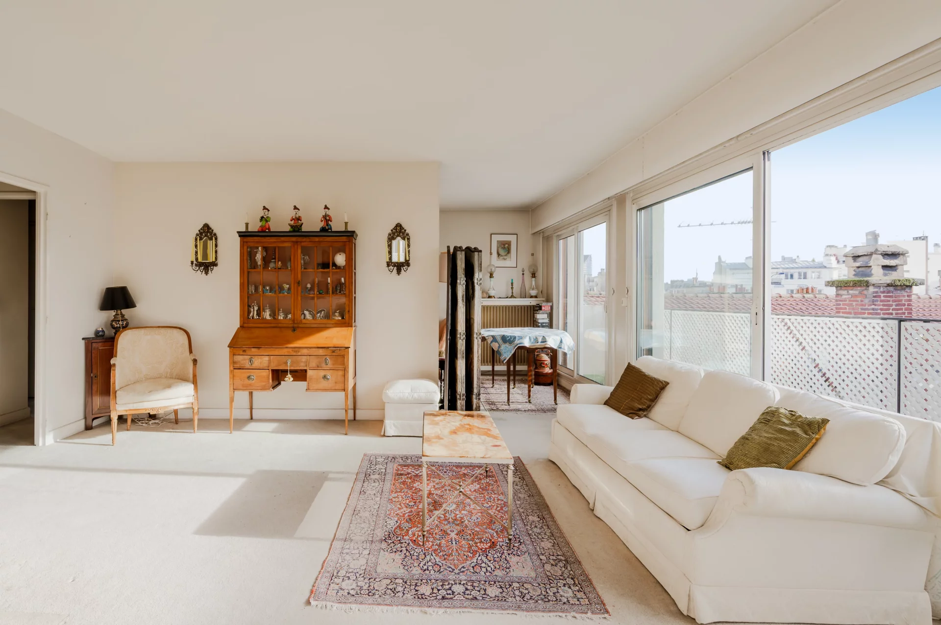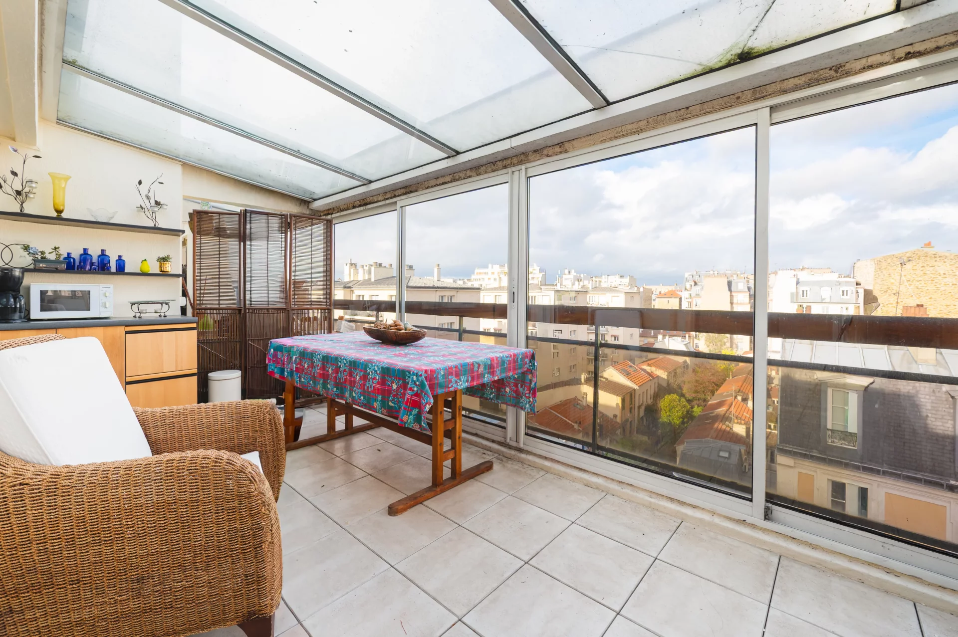 Situé dans une rue calme, au septième et dernier étage avec ascenseur, cet appartement traversant de 61,71 m² loi Carrez dispose d’une véranda fermée de 17,8 m² attenante à la cuisine, aménagée en salle à manger, portant la surface habitable totale à 79,51 m². Une terrasse de 11,6 m² exposée sud-ouest offre un agréable espace extérieur.