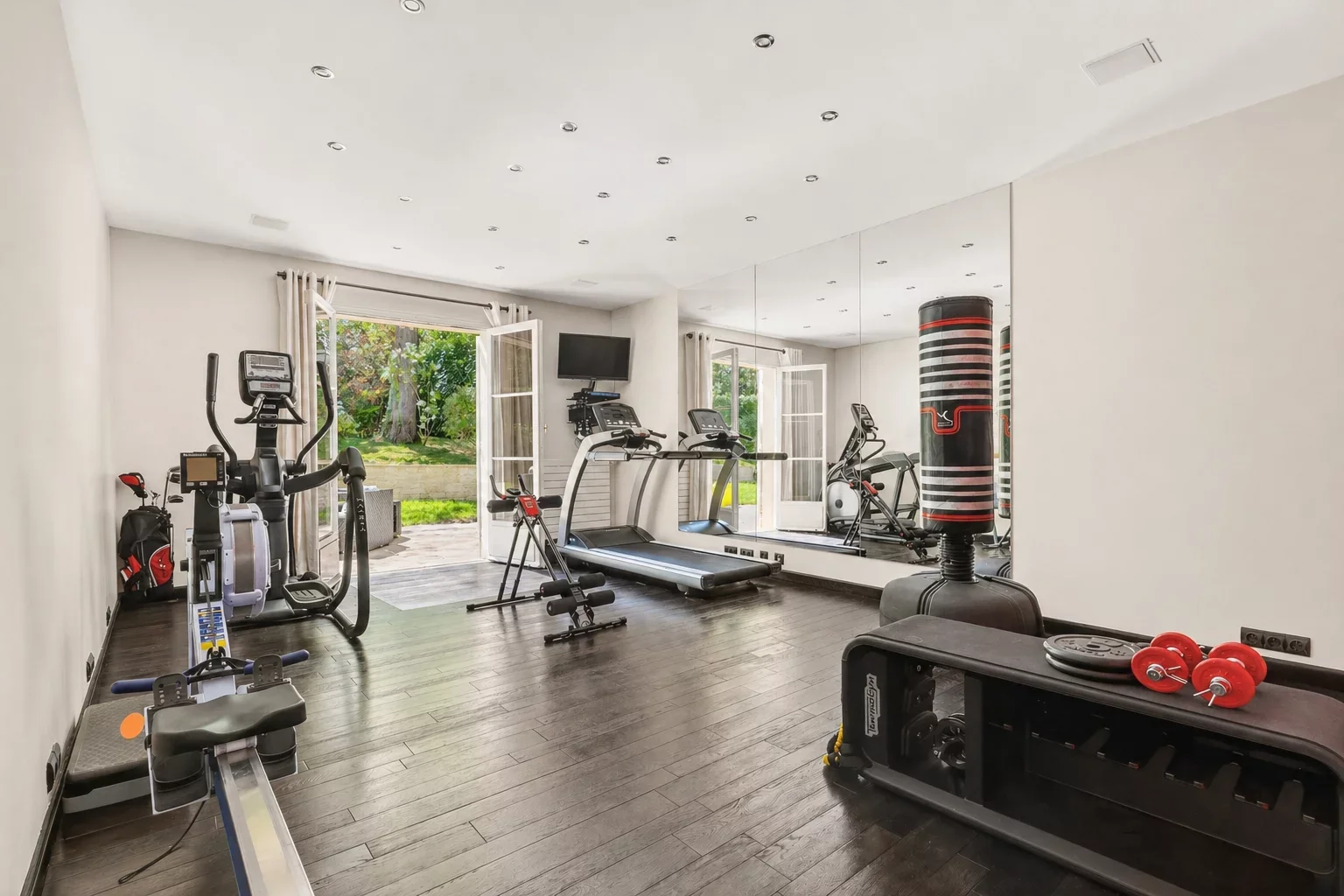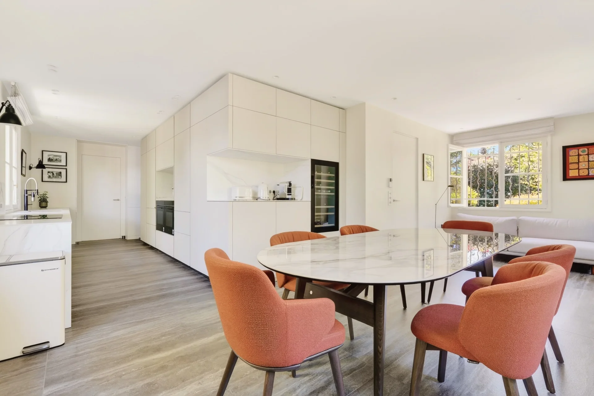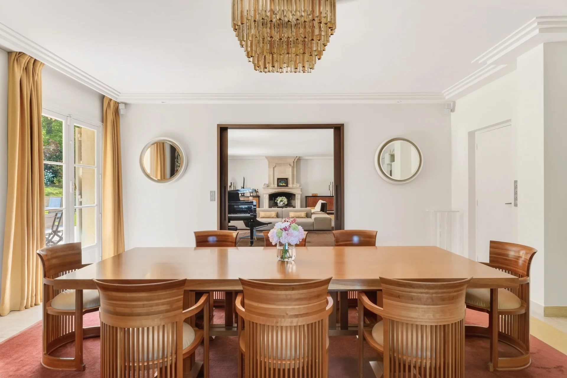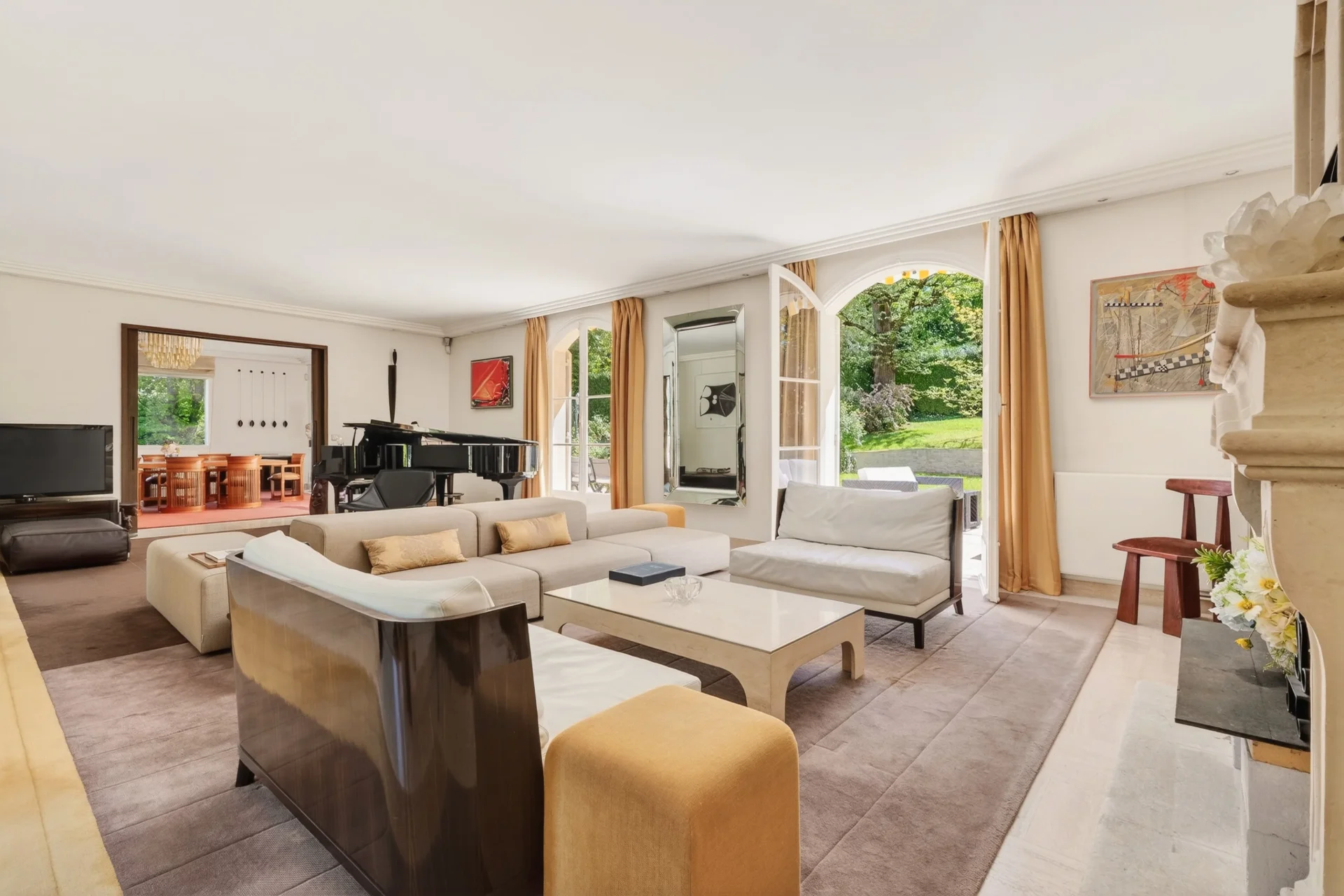 Au rez-de-chaussée, une vaste entrée mène à un lumineux espace de réception de 80 m², ouvert sur la terrasse et le jardin, comprenant une salle à manger et un séjour avec cheminée. Une grande cuisine dînatoire au design italien, entièrement rénovée en 2024, un bureau-bibliothèque, une salle de sport ainsi que des toilettes invités complètent ce niveau.