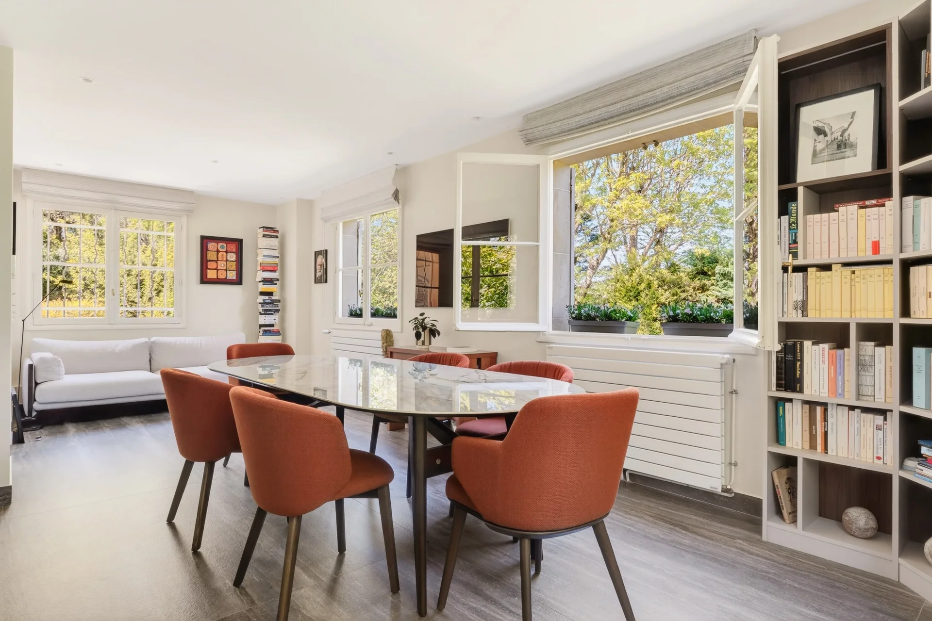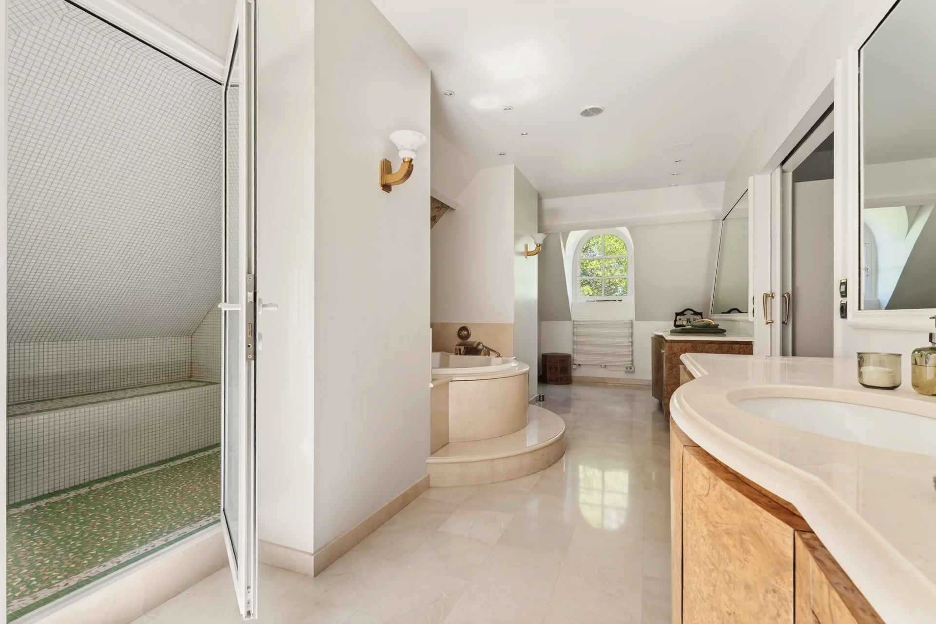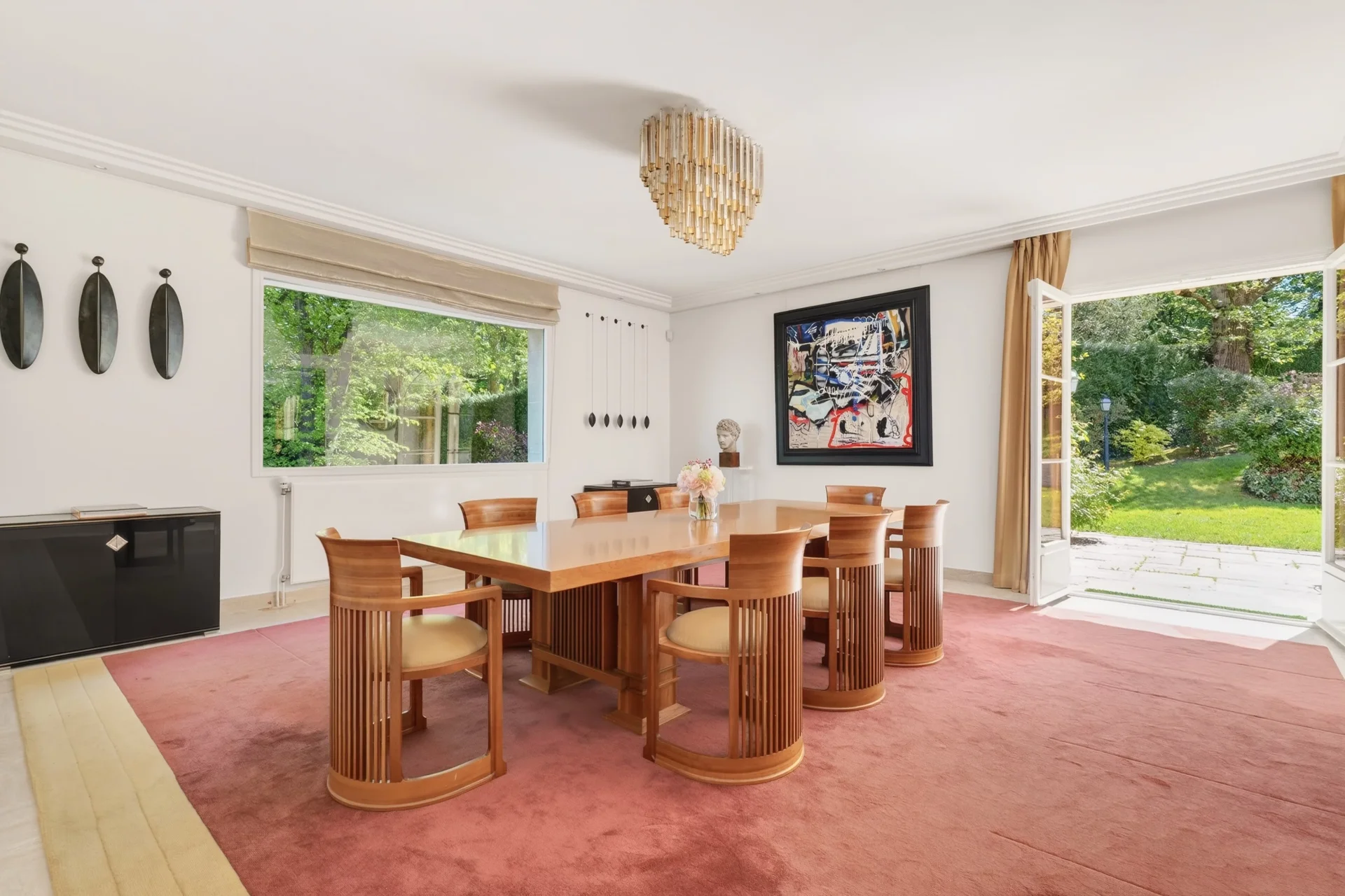 Au rez-de-chaussée, une vaste entrée mène à un lumineux espace de réception de 80 m², ouvert sur la terrasse et le jardin, comprenant une salle à manger et un séjour avec cheminée. Une grande cuisine dînatoire au design italien, entièrement rénovée en 2024, un bureau-bibliothèque, une salle de sport ainsi que des toilettes invités complètent ce niveau.