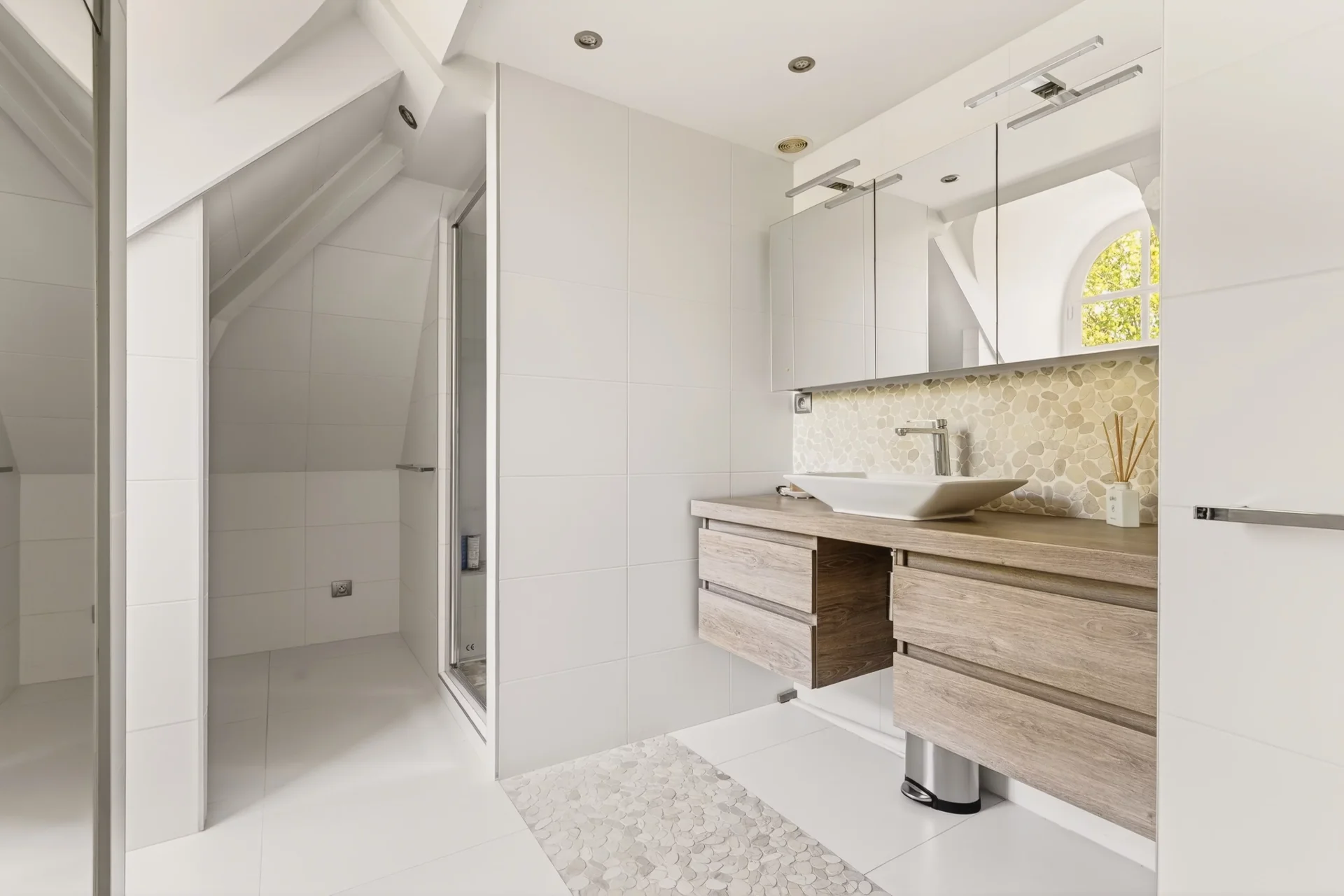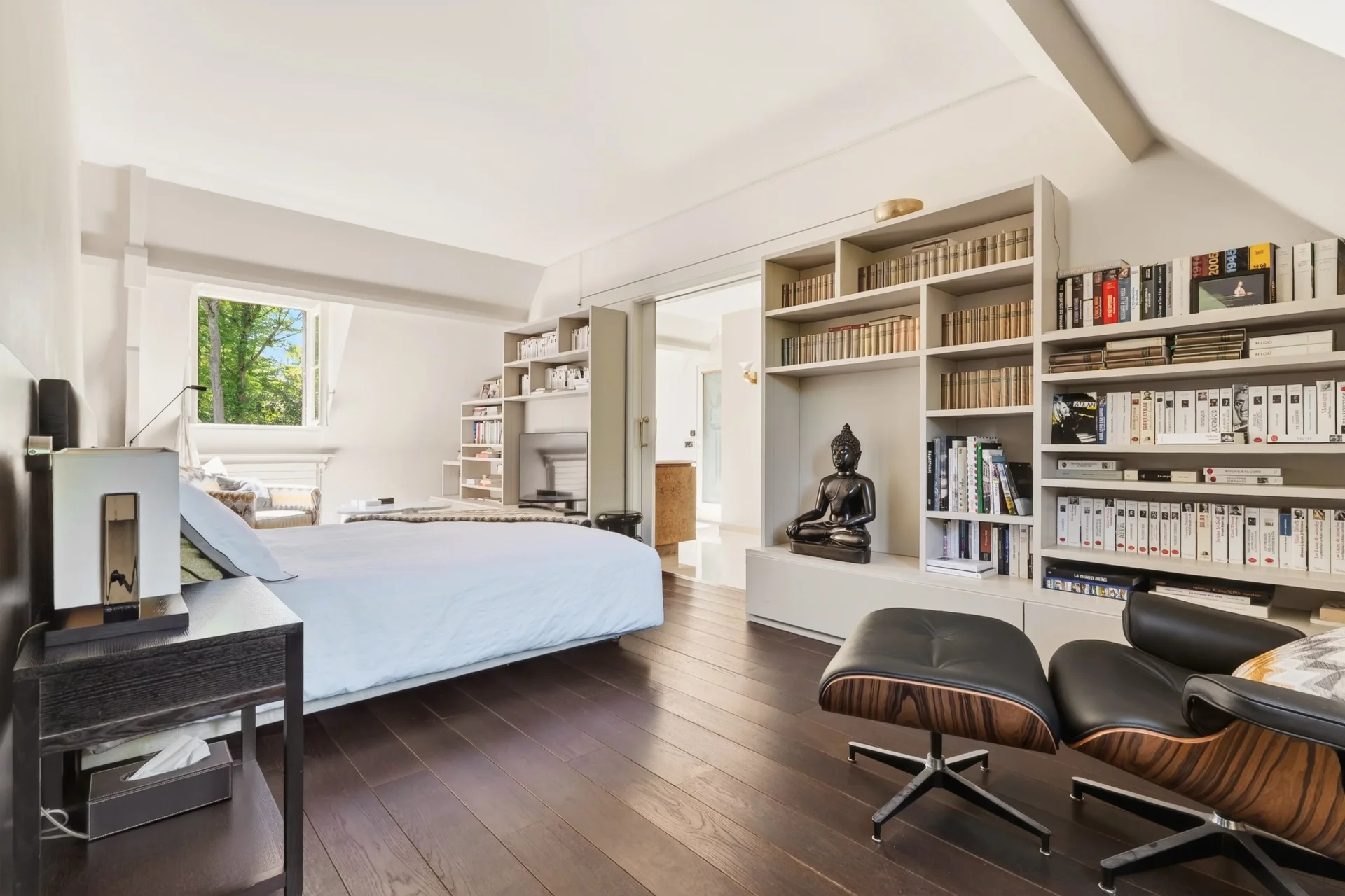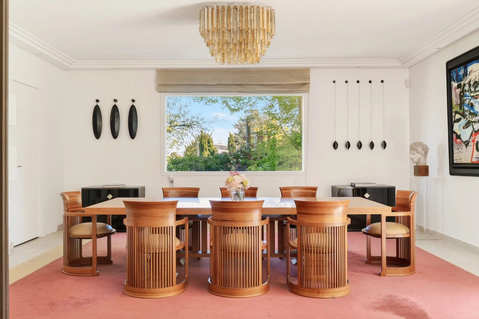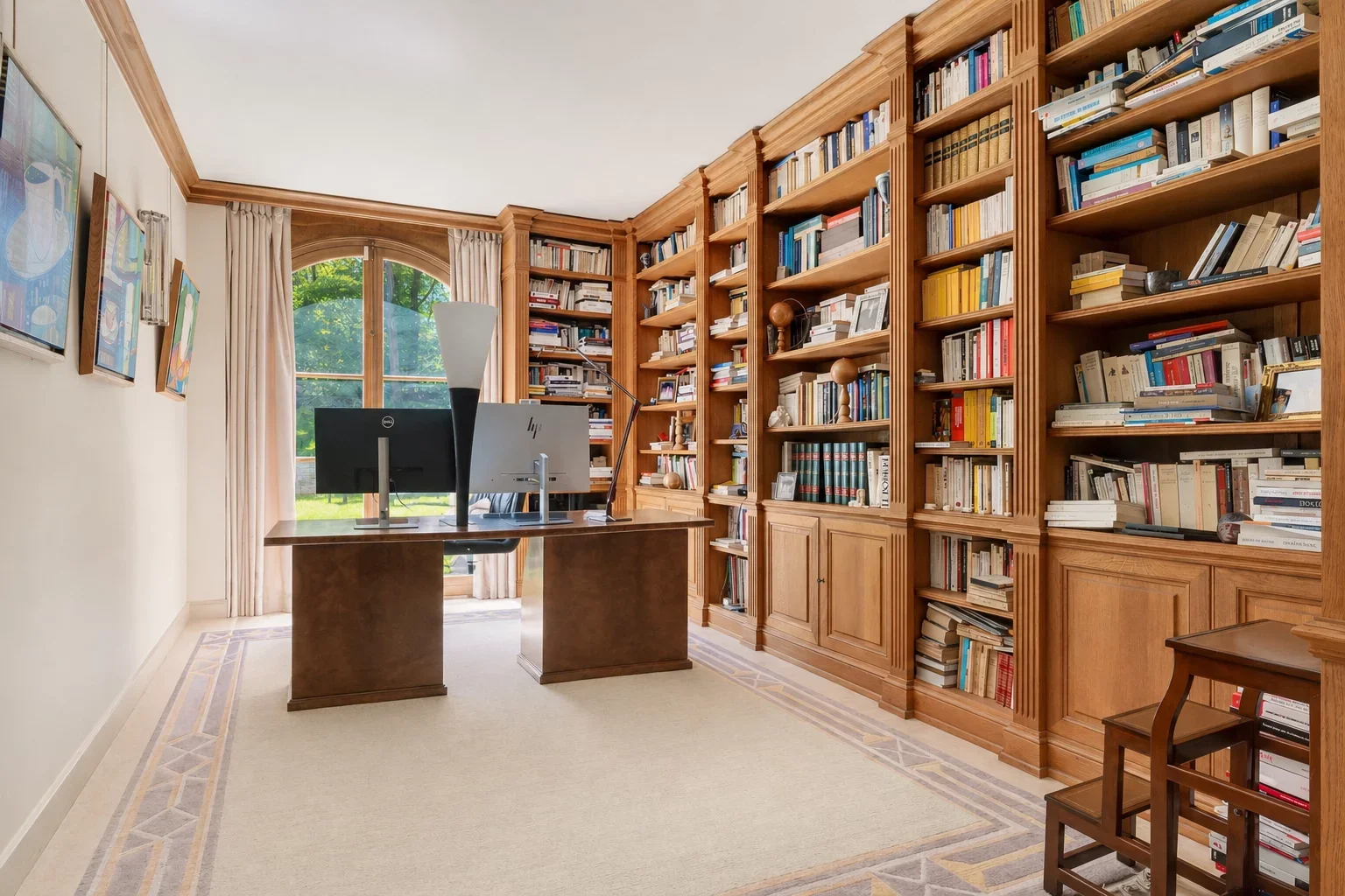 Au rez-de-chaussée, une vaste entrée mène à un lumineux espace de réception de 80 m², ouvert sur la terrasse et le jardin, comprenant une salle à manger et un séjour avec cheminée. Une grande cuisine dînatoire au design italien, entièrement rénovée en 2024, un bureau-bibliothèque, une salle de sport ainsi que des toilettes invités complètent ce niveau.