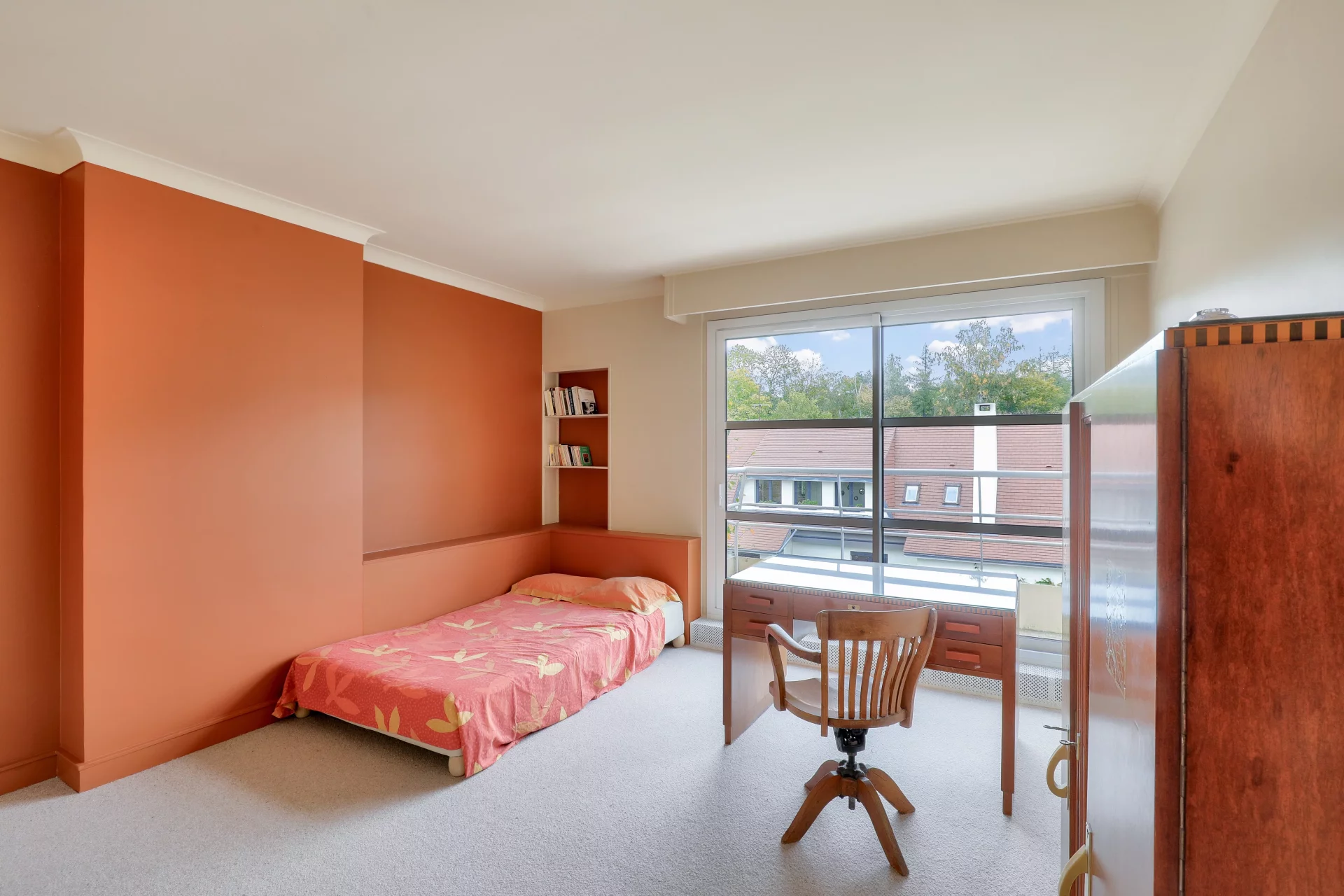 À l’étage, une mezzanine lumineuse surplombe le salon et mène à une terrasse de 40 m² exposée ouest. Deux chambres avec balcon se partagent ce niveau : l’une avec point d’eau, l’autre avec salle de douche et WC privatifs.