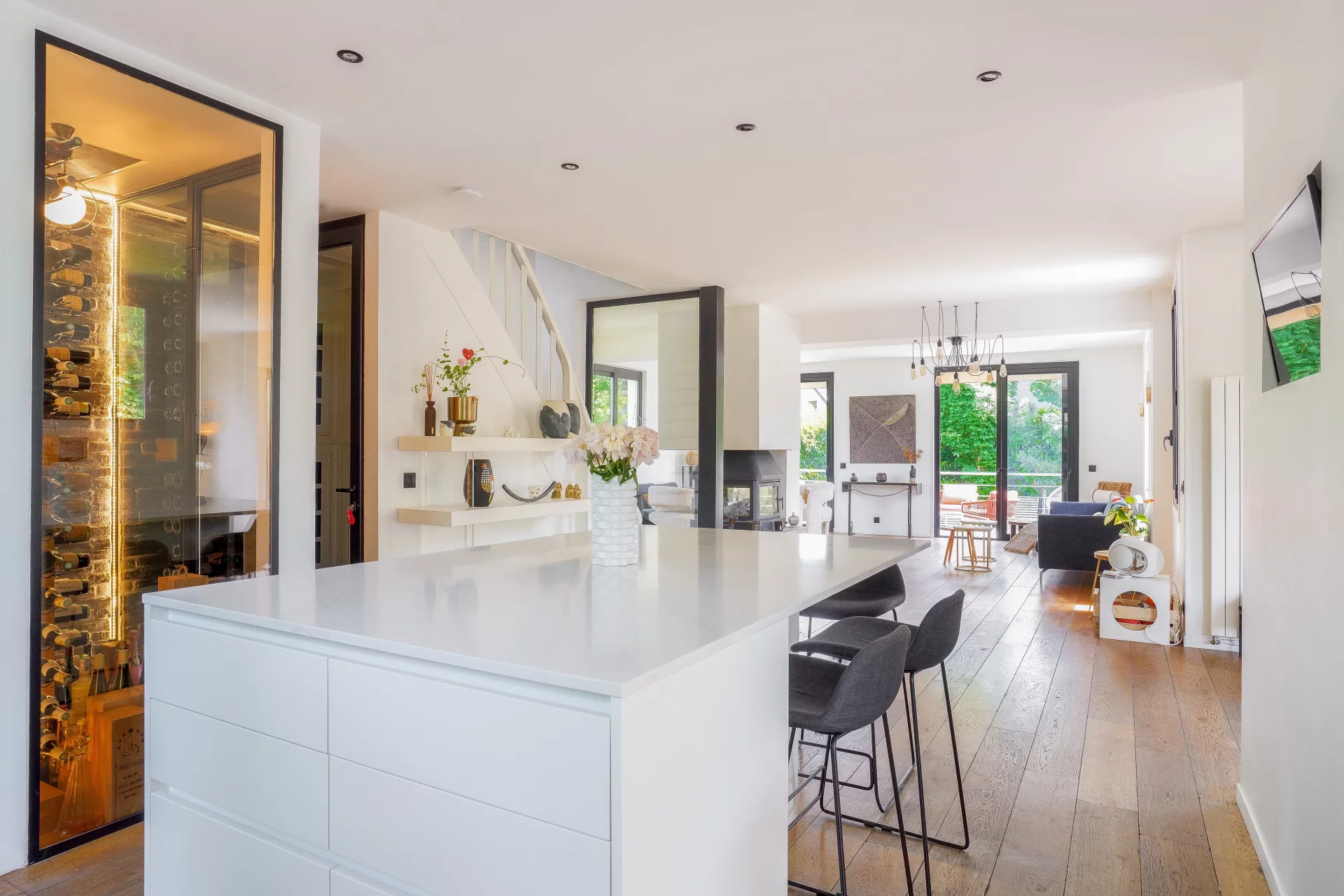 Dès l’entrée, vous serez saisis par la spectaculaire pièce de vie de près de 100 m², baignée de lumière grâce à de larges ouvertures, sublimée par une architecture élégante et épurée. Cet espace s’articule autour d’une salle à manger, d’une cuisine ouverte haut de gamme avec îlot central, d’une arrière-cuisine, ainsi qu'une cave à vin vitrée, véritable élément décoratif. Une cheminée centrale apporte chaleur et convivialité à ce vaste volume prolongé par une grande terrasse exposée.