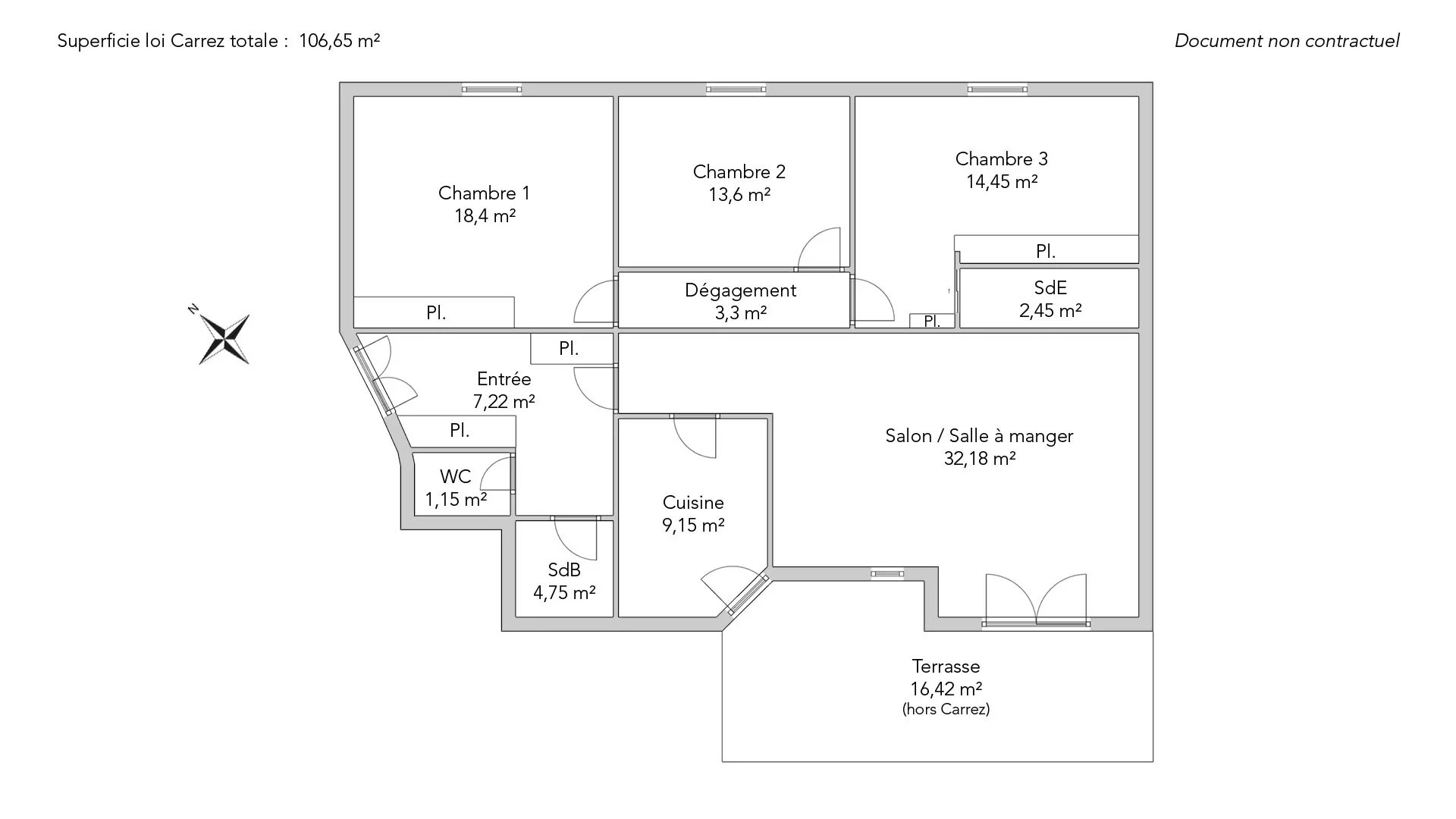 L'appartement se compose d'une entrée avec dressing qui dessert un séjour avec cuisine semi ouverte, trois chambres dont une avec sa salle de douche, une salle de bains avec toilettes, des toilettes séparées ainsi que de nombreux rangements intégrés.
