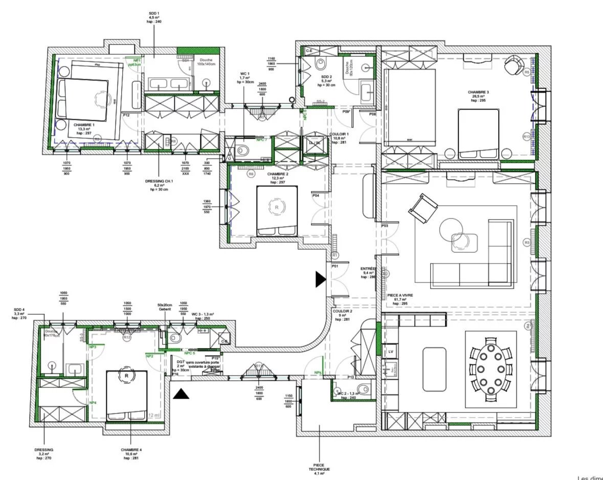 Il comporte une entrée, un séjour prolongé par sa cuisine ouverte avec îlot central, trois chambres en suite, une quatrième chambre ou éventuel salon de télévision et des toilettes séparées.