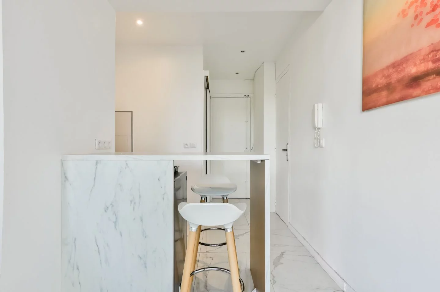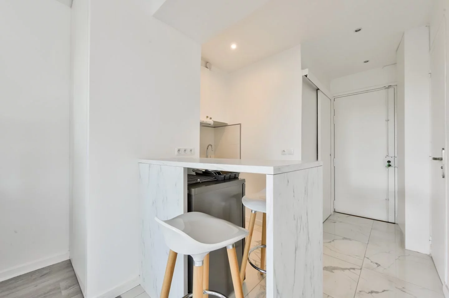 Situé au troisième et dernier étage par ascenseur d’un bel immeuble en pierre de taille, au sein d’une résidence de standing sécurisée avec gardien et dotée d'un jardin, joli studio avec terrasse offrant une vue dégagée sur le ciel et la tour Eiffel en très bon état.