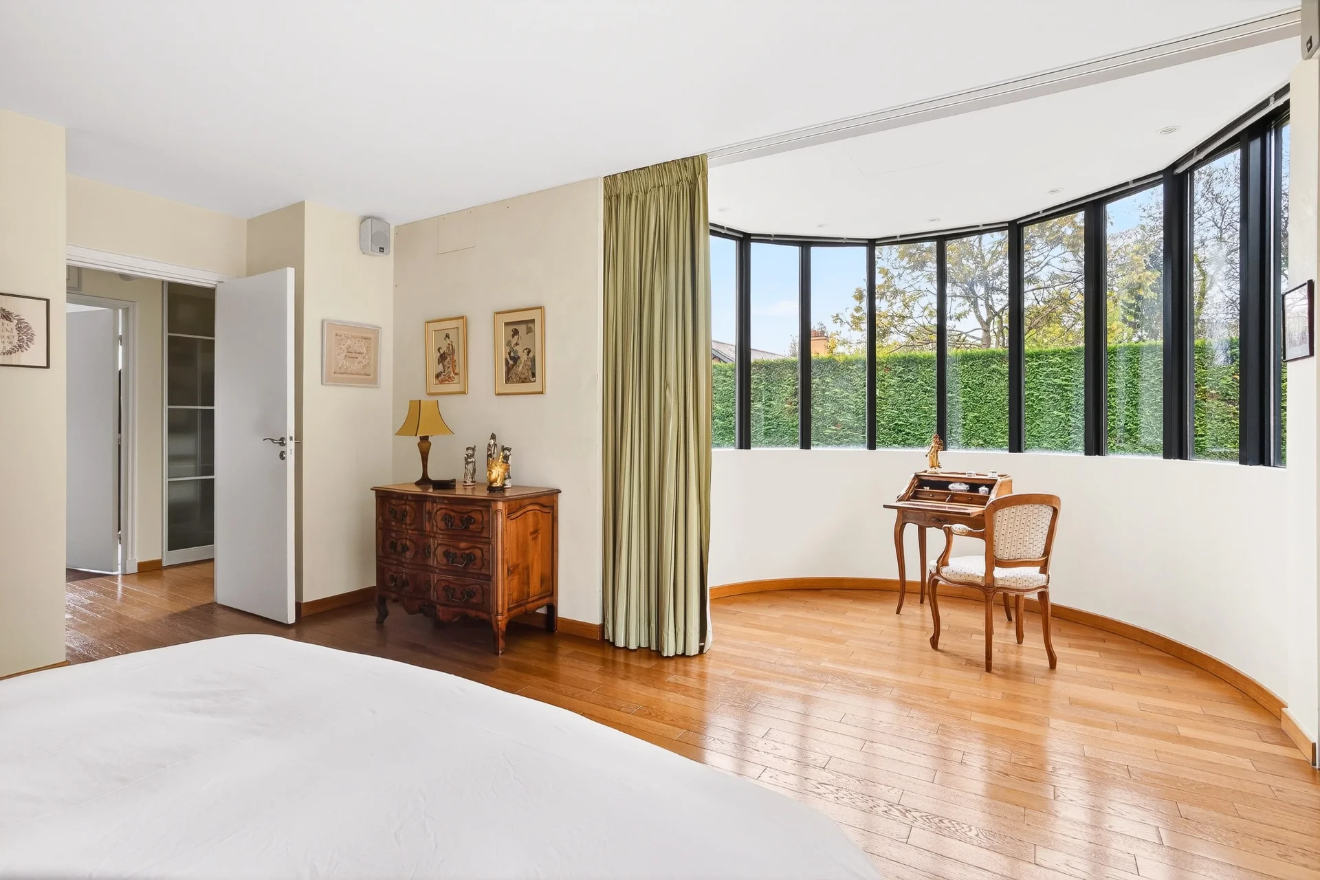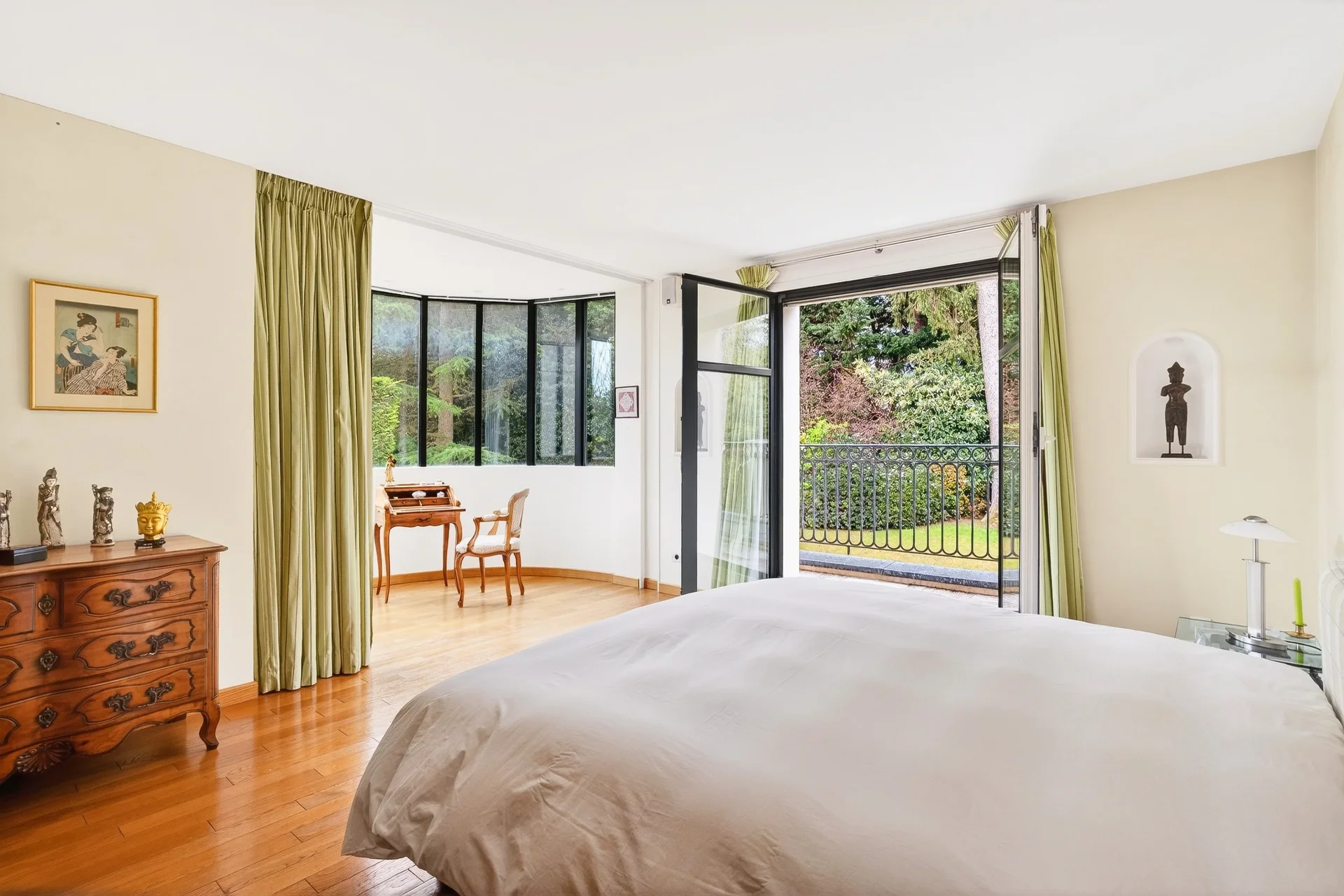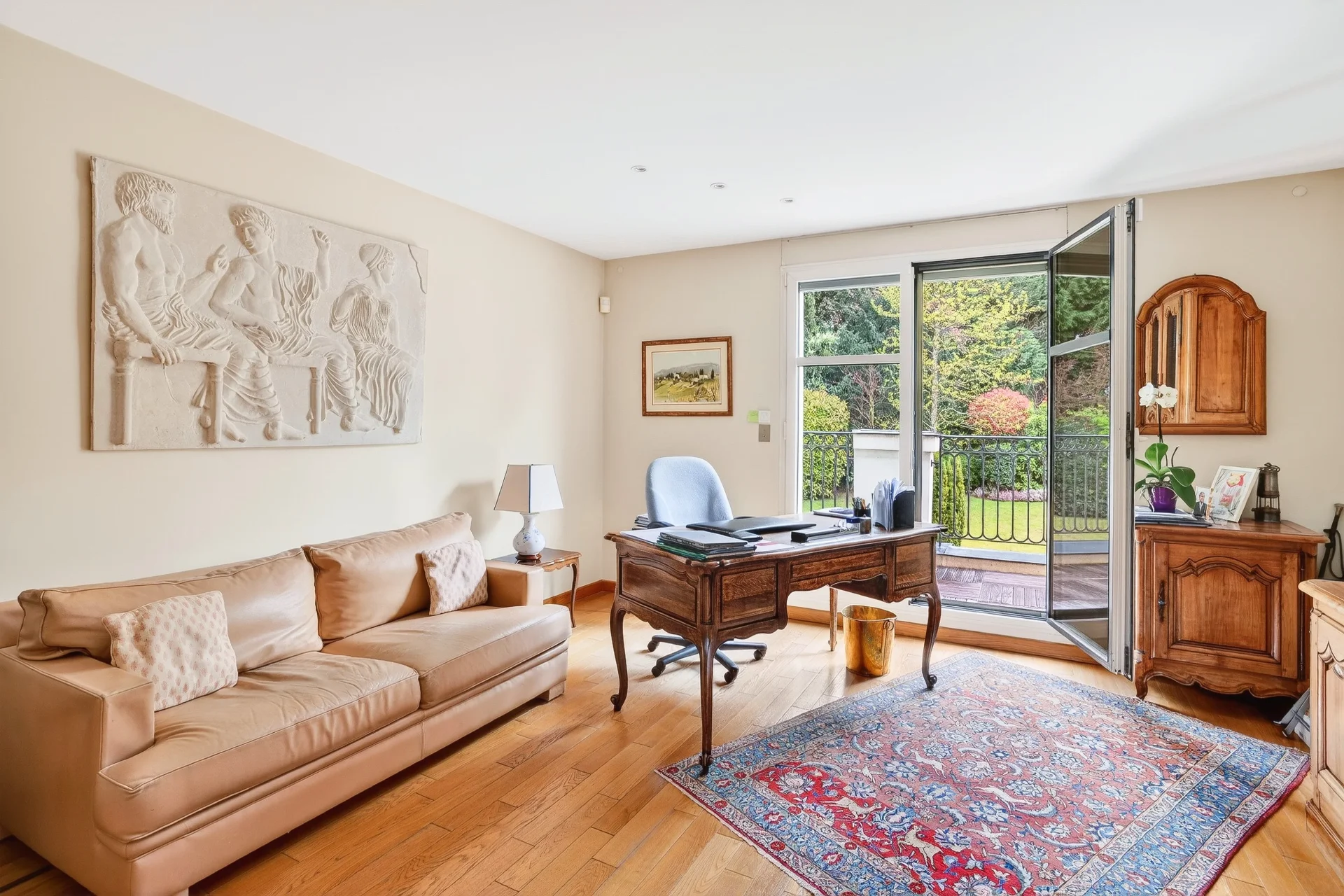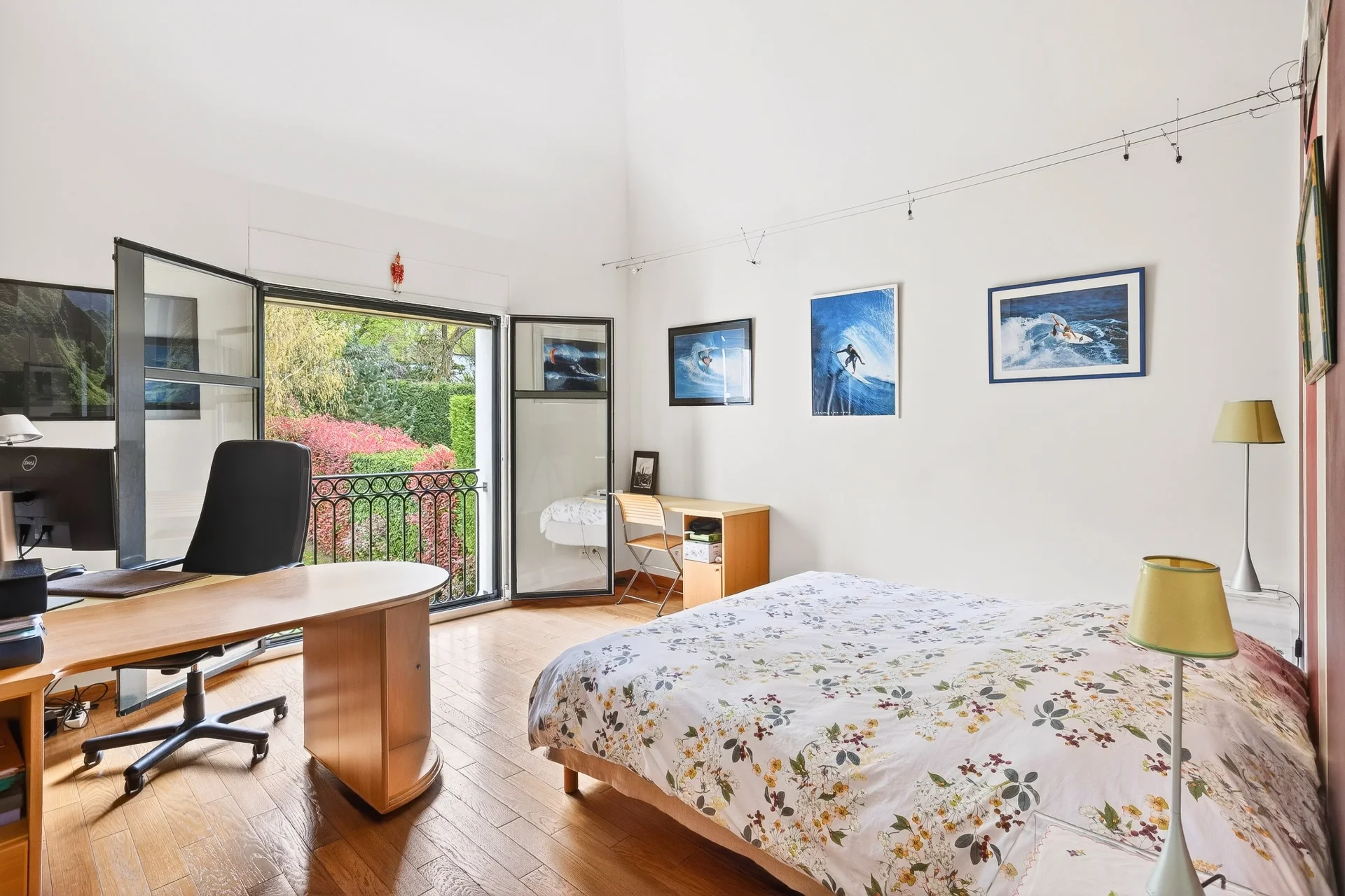 En mezzanine, un bureau baigné de lumière, prolongé par une terrasse de 50 m² offrant une vue dégagée sur le Parc de Saint-Cloud et la forêt domaniale de Fausses-Reposes.