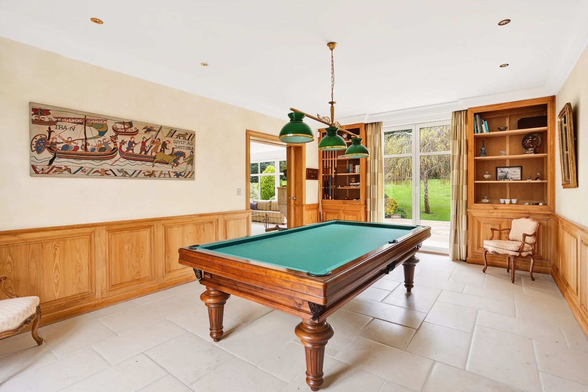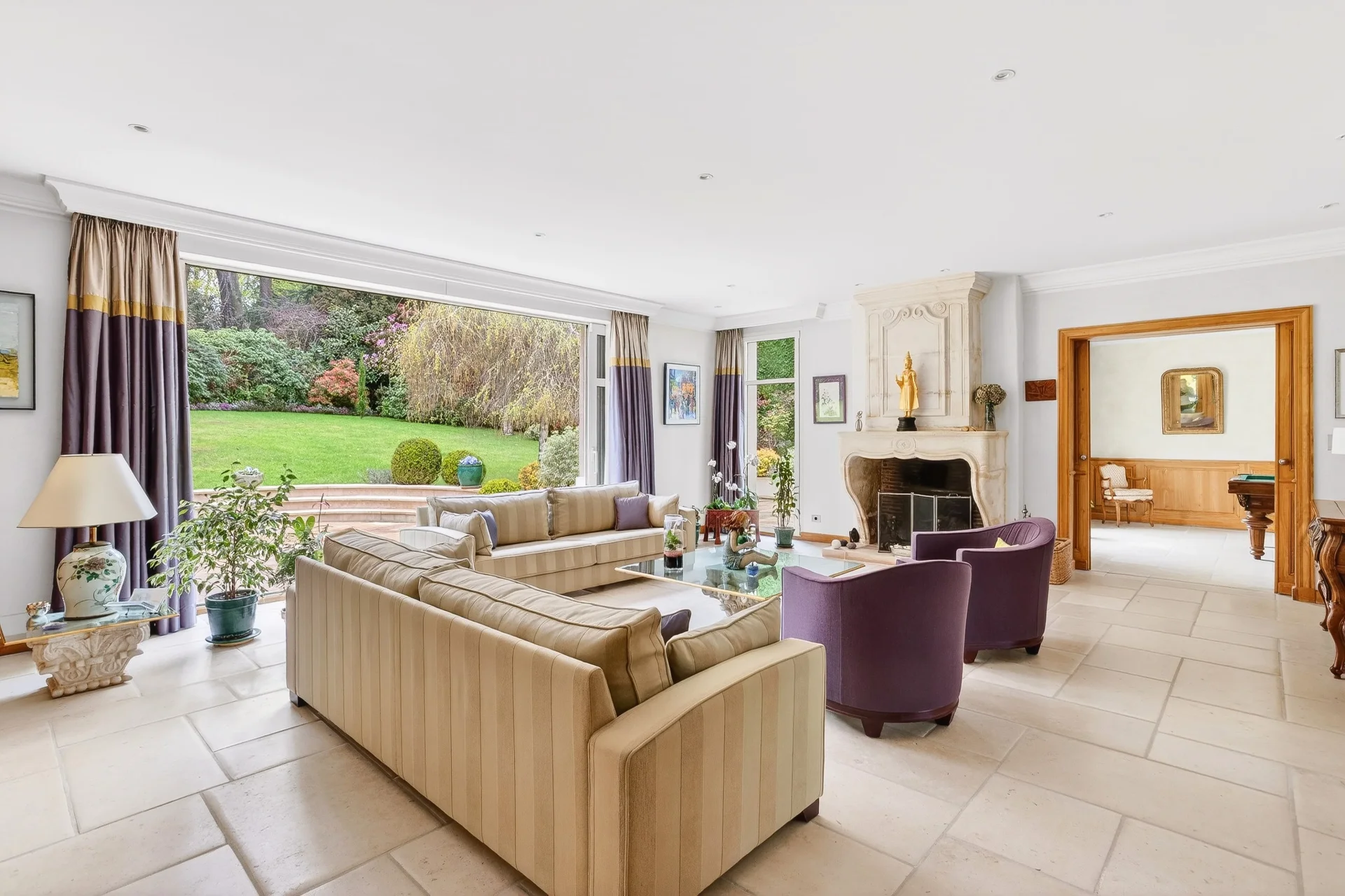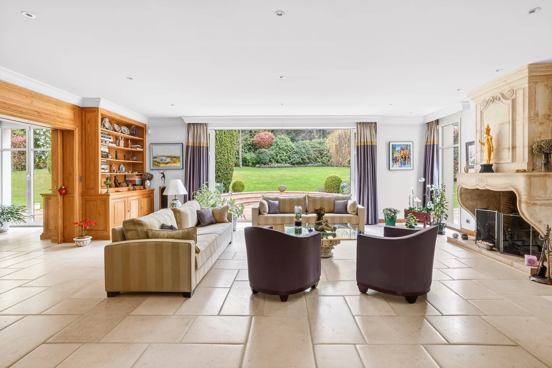 Le rez-de-chaussée, entièrement de plain-pied sur la terrasse et le jardin, s’ouvre sur une entrée desservant un vaste séjour lumineux avec cheminée, un second salon, une salle à manger ainsi qu’une grande cuisine dînatoire avec arrière-cuisine et vestiaire invités.
