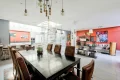 L’entrée ouvre sur une vaste pièce de réception baignée de lumière et sa cuisine ouverte, accueillant salle à manger, salon et espace télé.