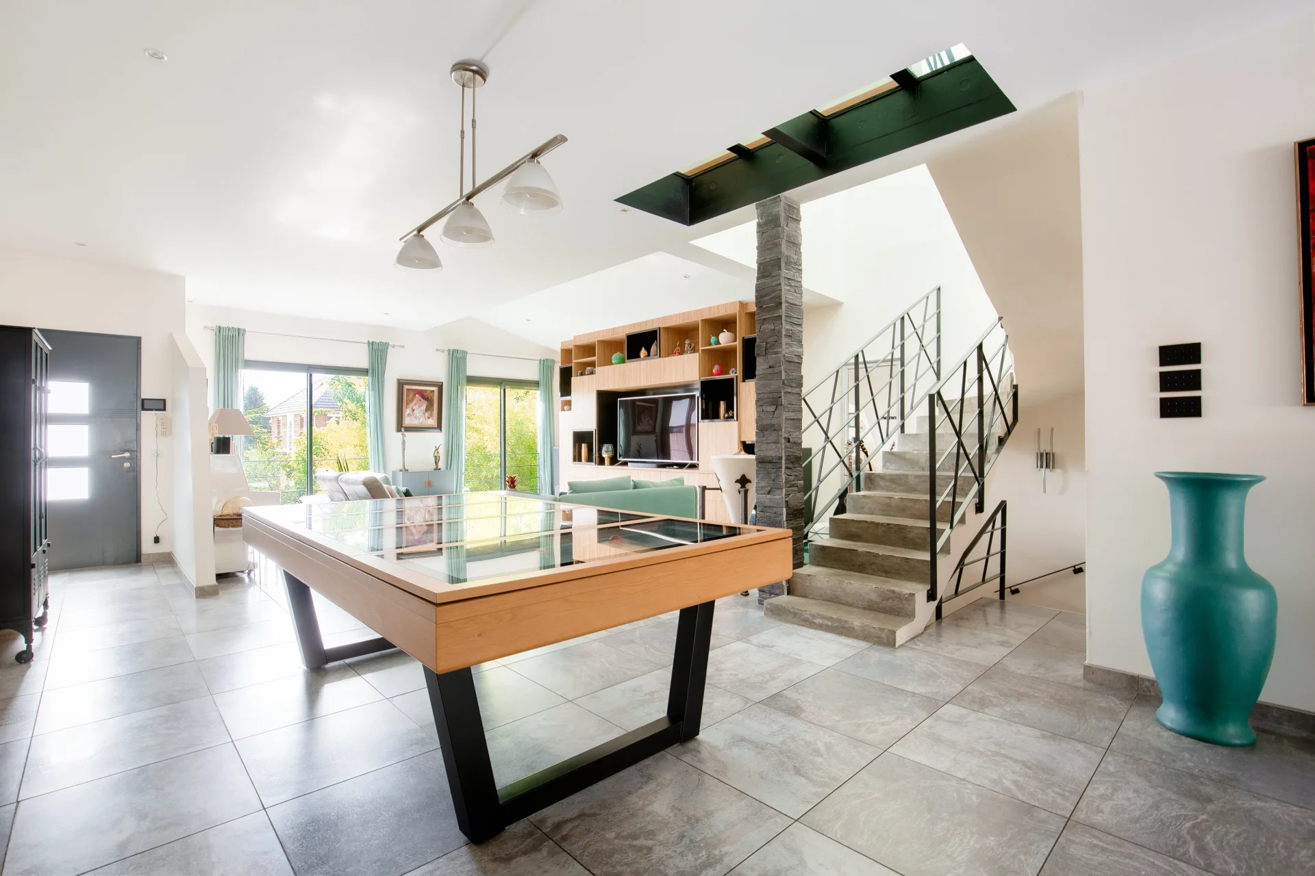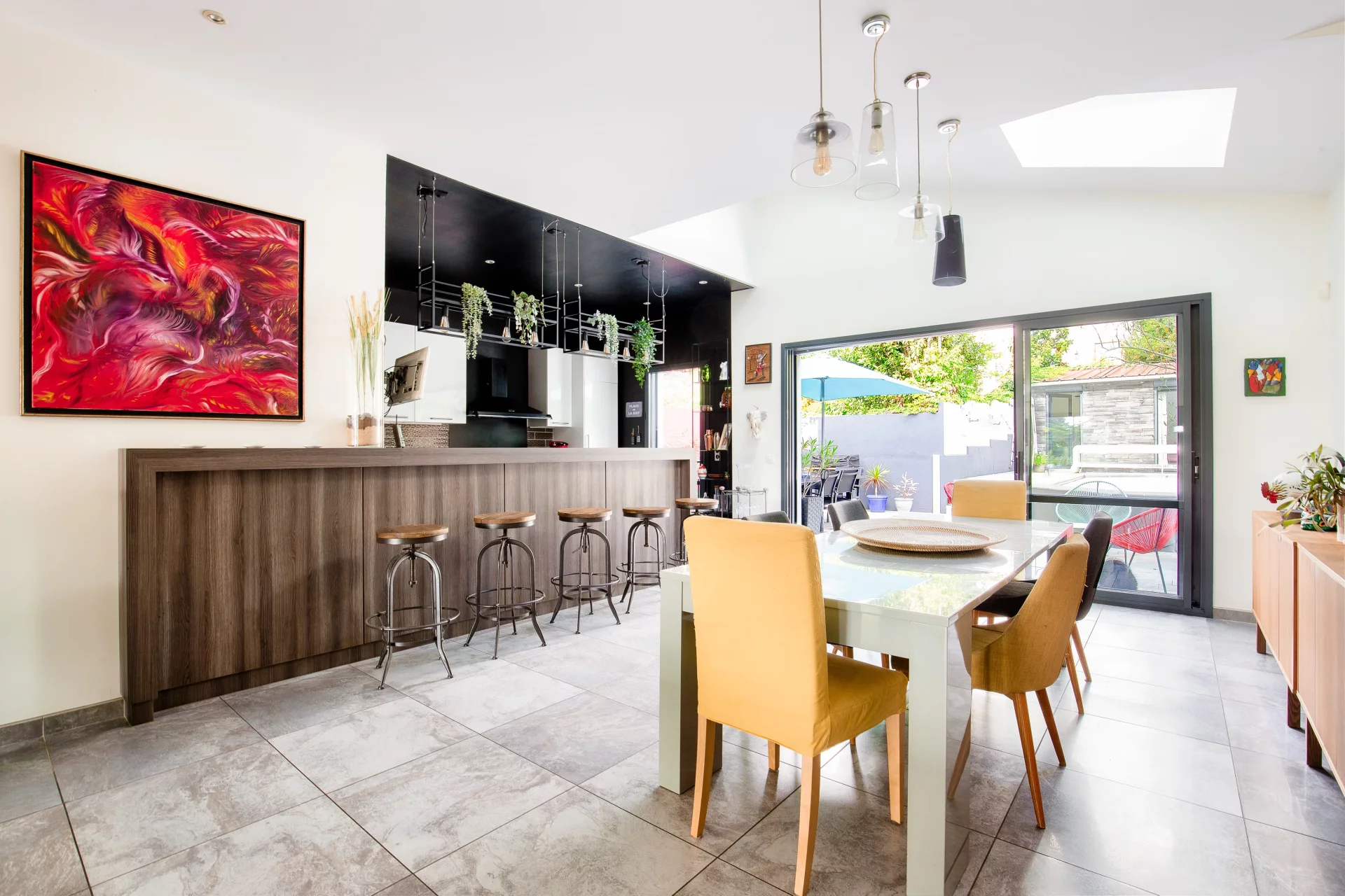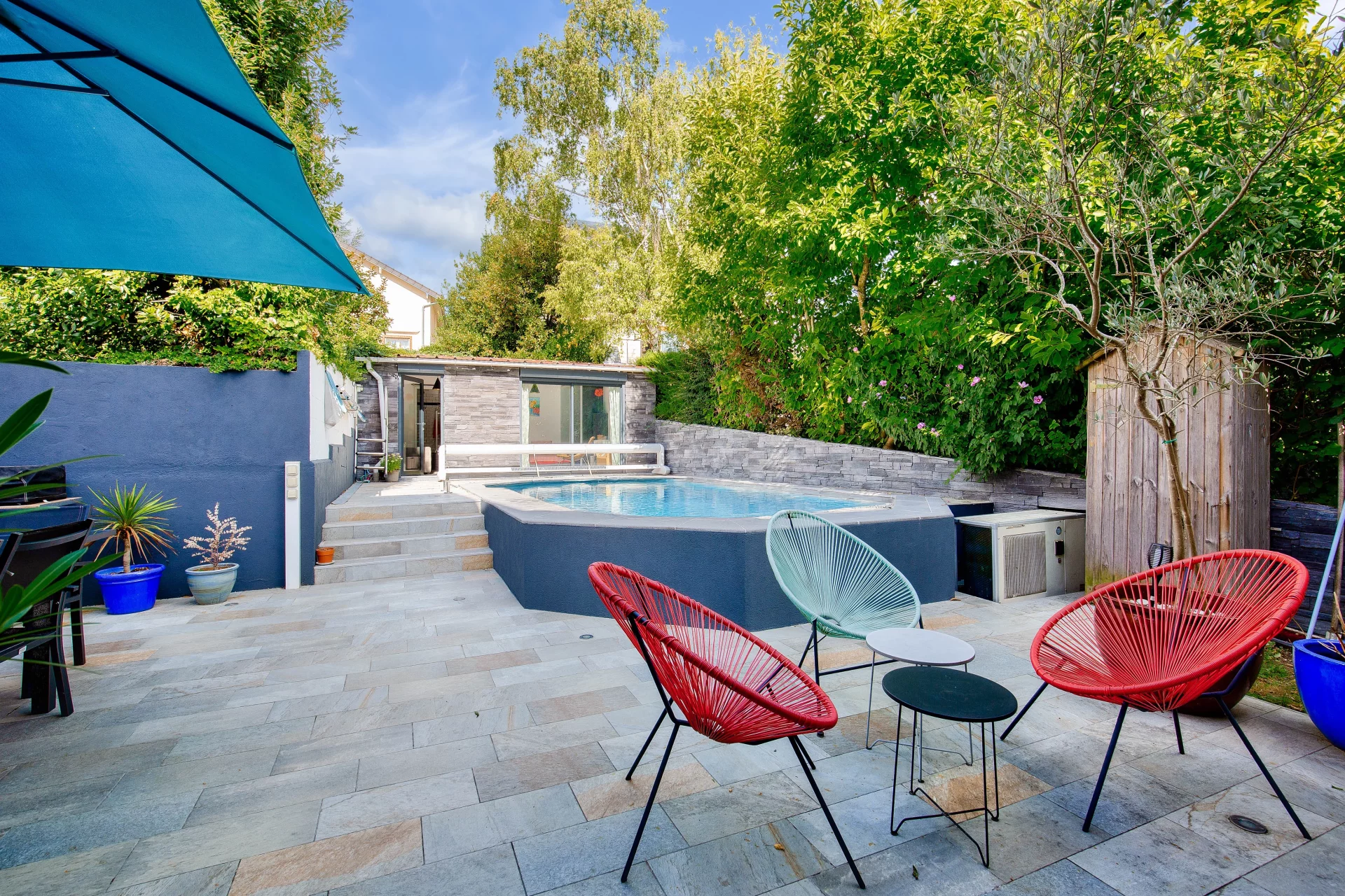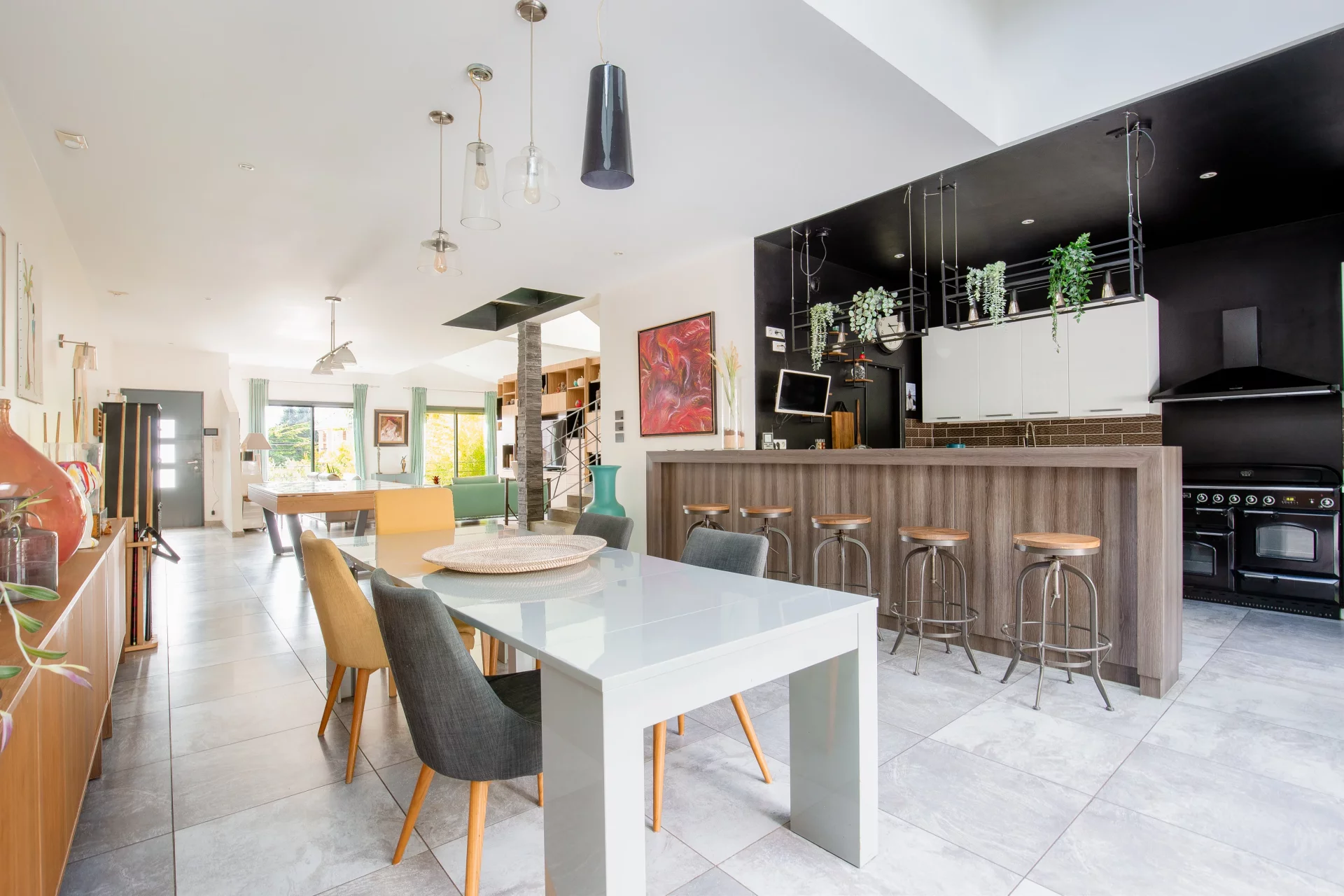 Le rez-de-chaussée accueille une superbe pièce de vie de près de 100 m² avec cuisine ouverte, entièrement de plain-pied sur une parcelle de 458 m². Celle-ci s’ouvre sur une terrasse et une piscine chauffée par pompe à chaleur, à l’abri des regards, équipée d’un volet roulant électrique.