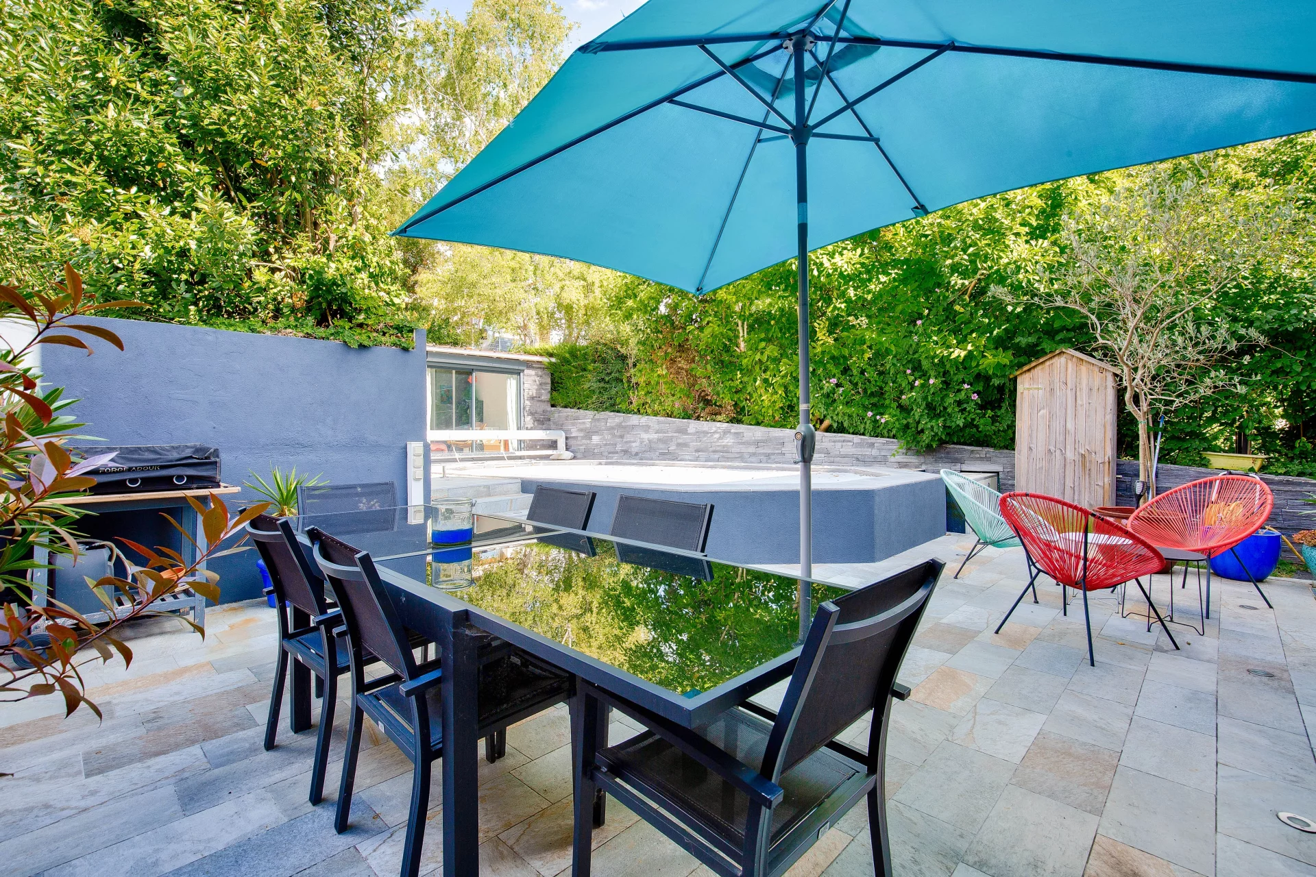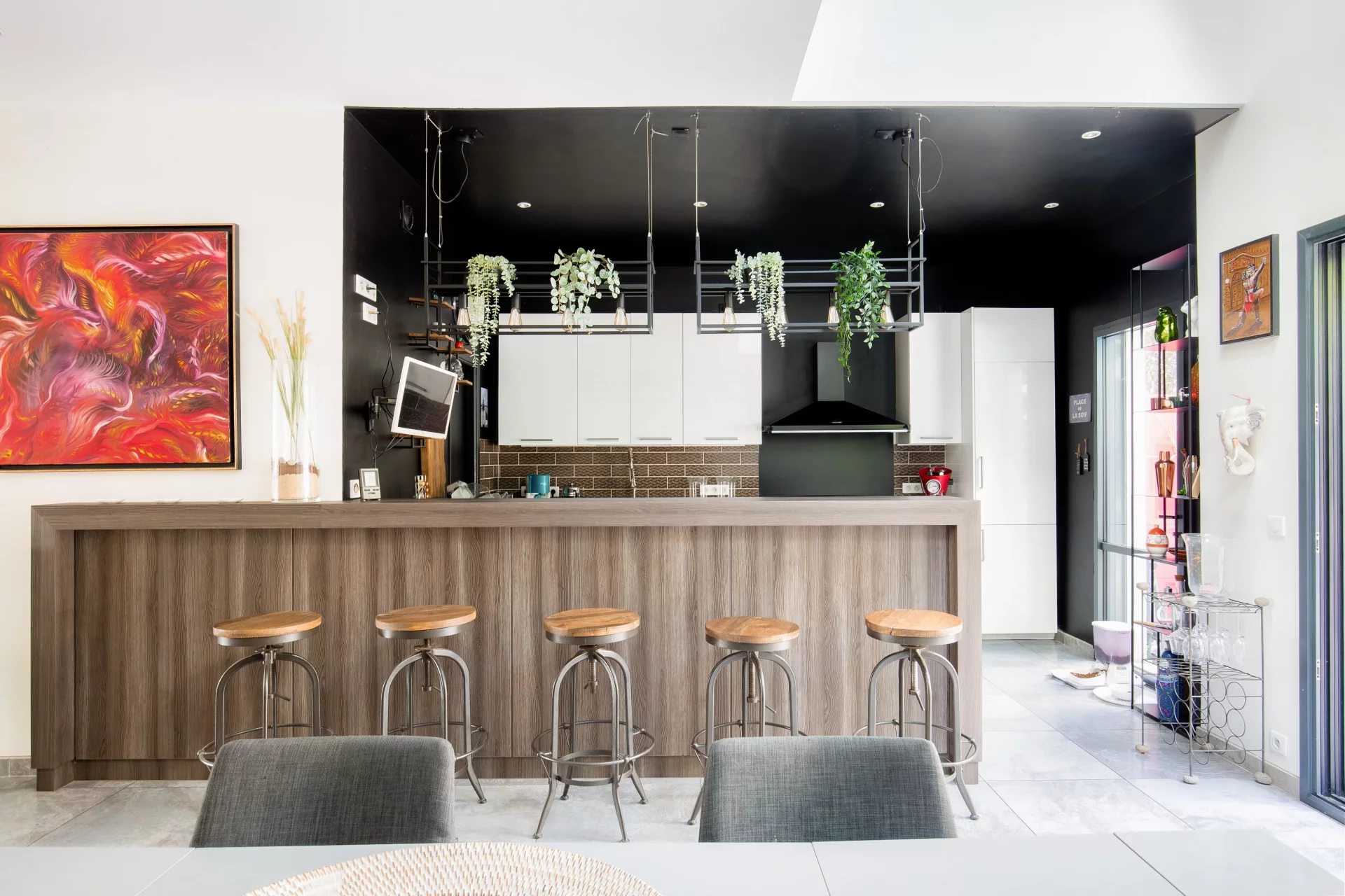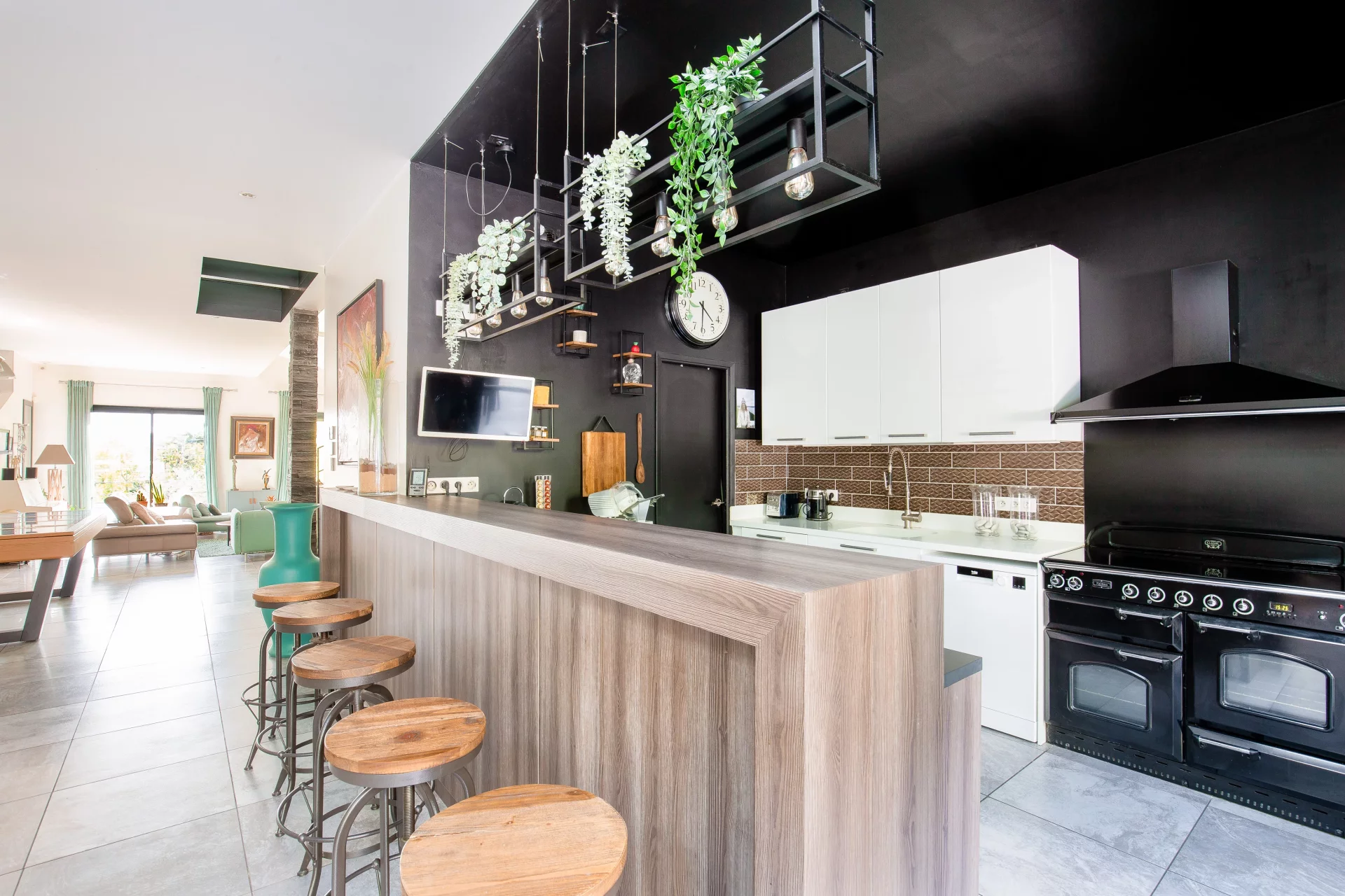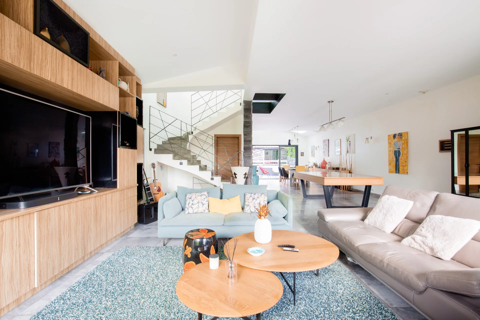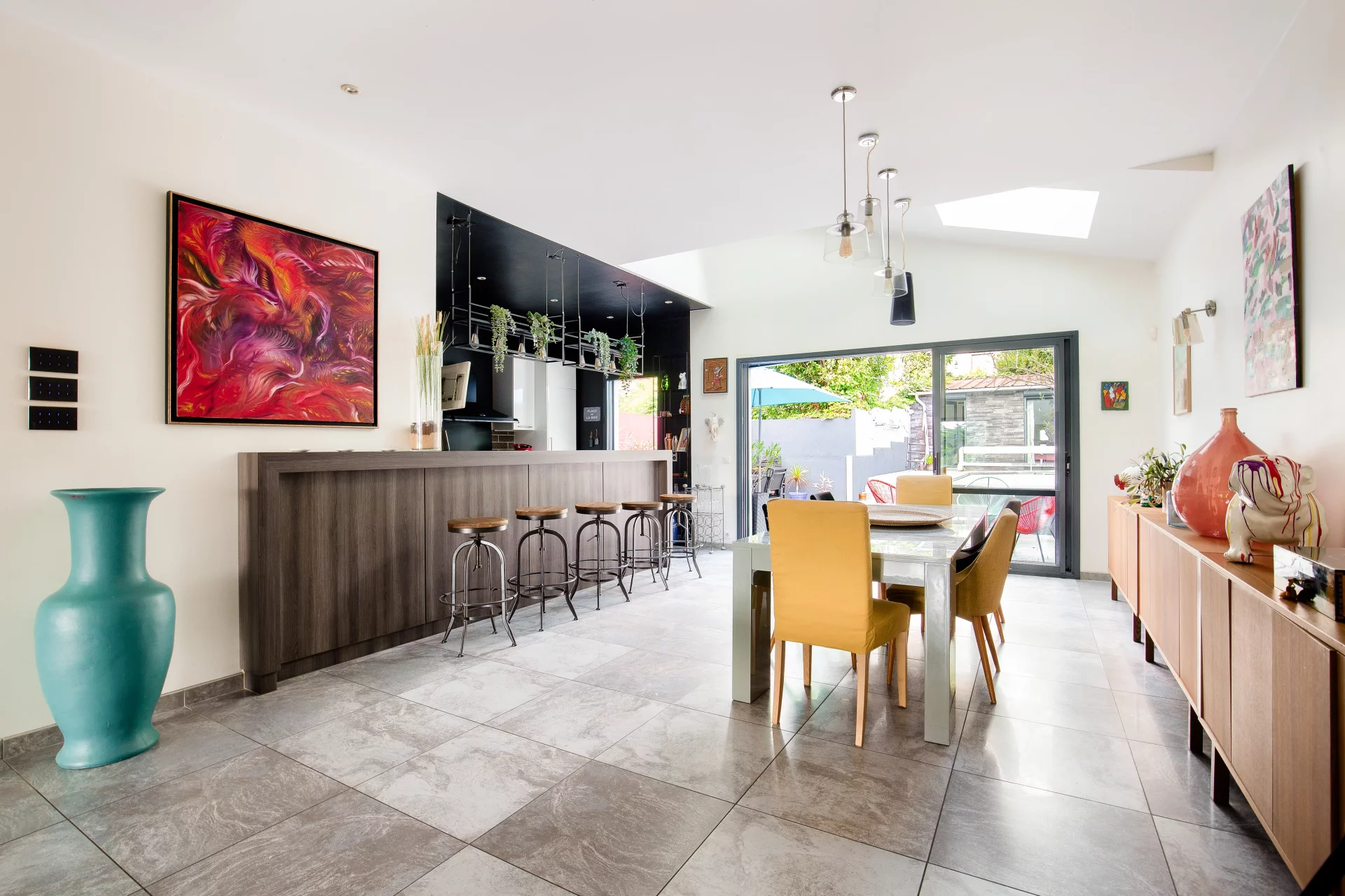 Le rez-de-chaussée accueille une superbe pièce de vie de près de 100 m² avec cuisine ouverte, entièrement de plain-pied sur une parcelle de 458 m². Celle-ci s’ouvre sur une terrasse et une piscine chauffée par pompe à chaleur, à l’abri des regards, équipée d’un volet roulant électrique.