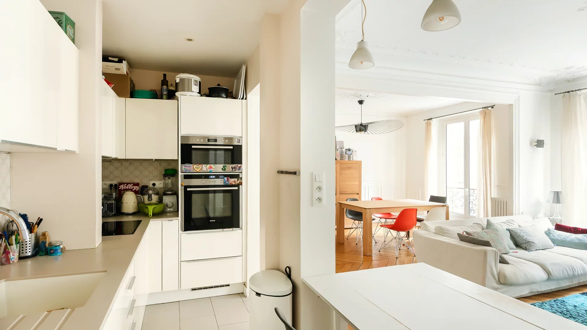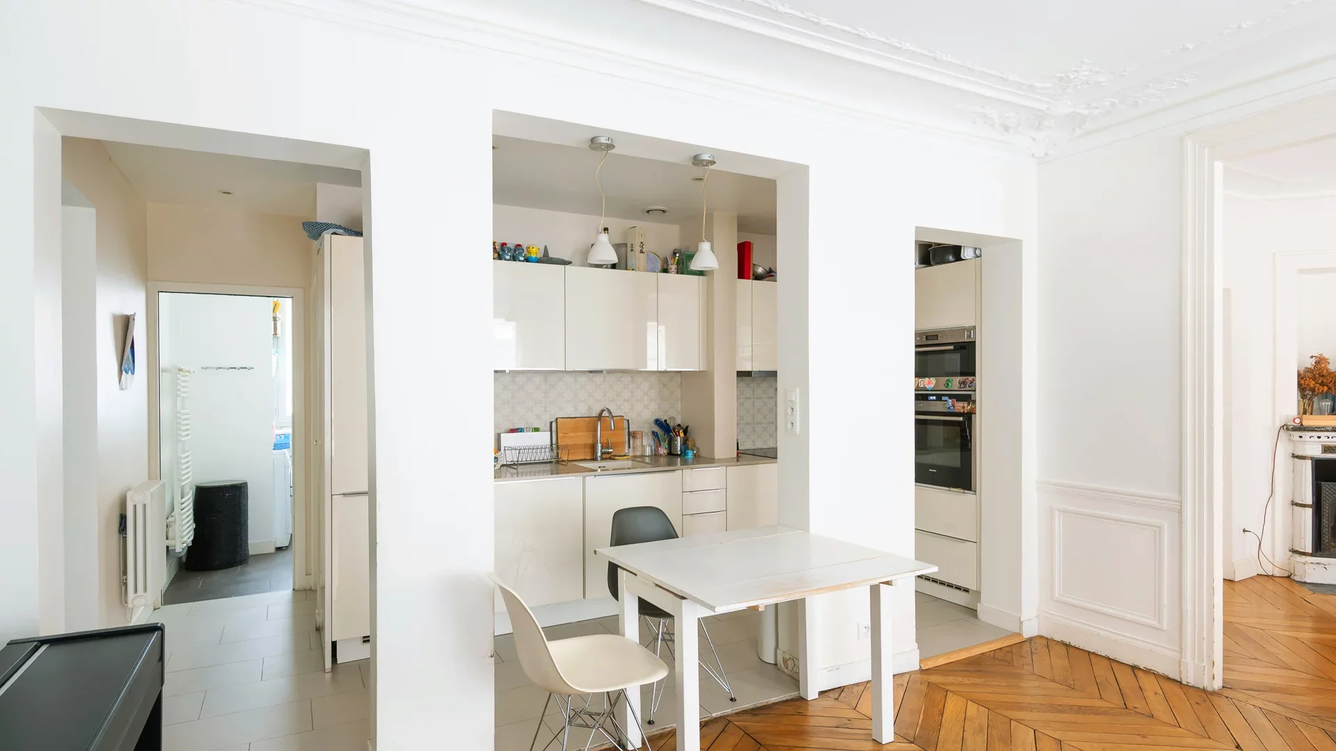 L'appartement profite de beaux volumes grâce à ses 2,83m de hauteur sous plafond et a préservé l'intégralité de son charme ancien : parquet, moulures et cheminées.