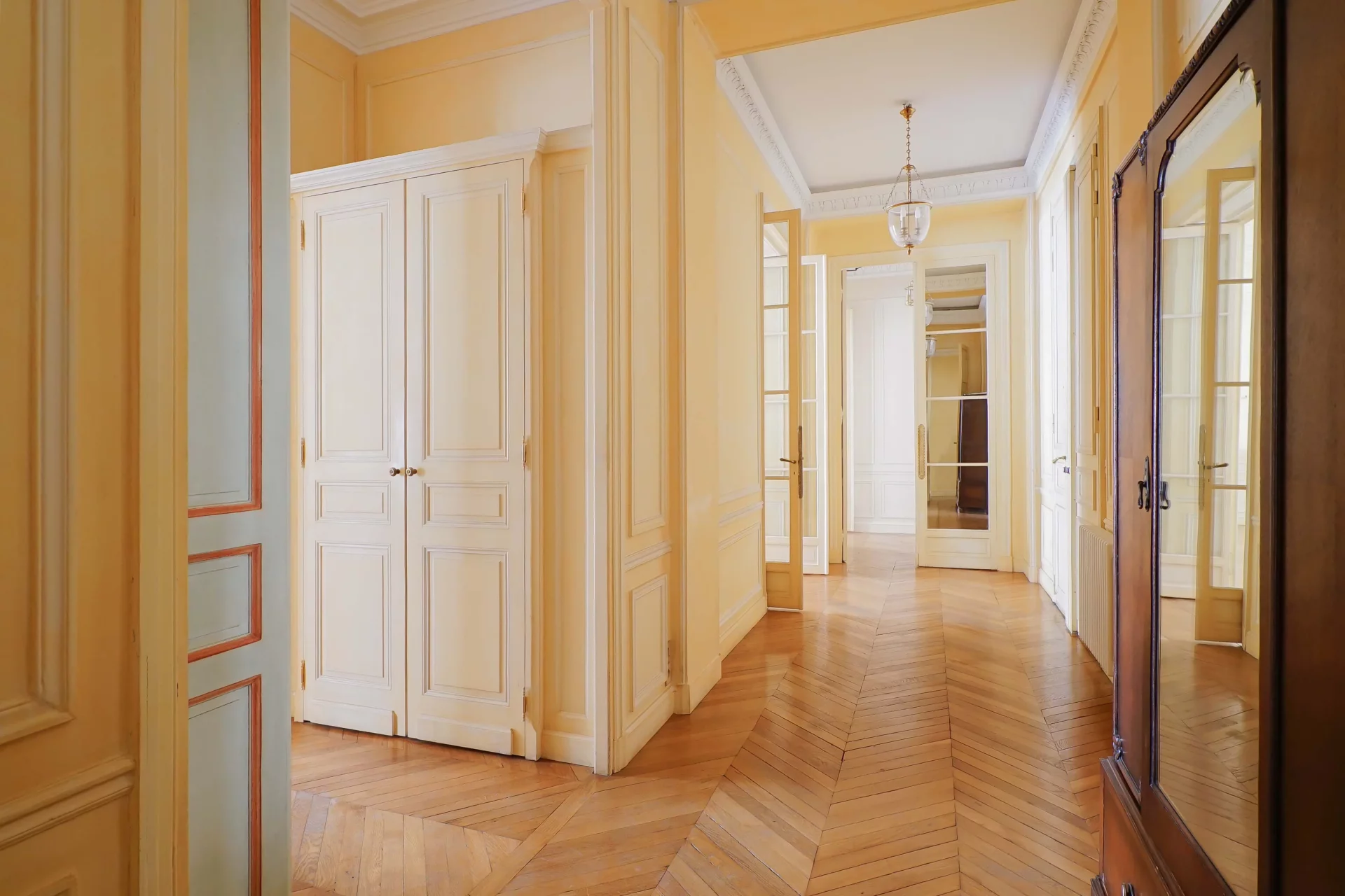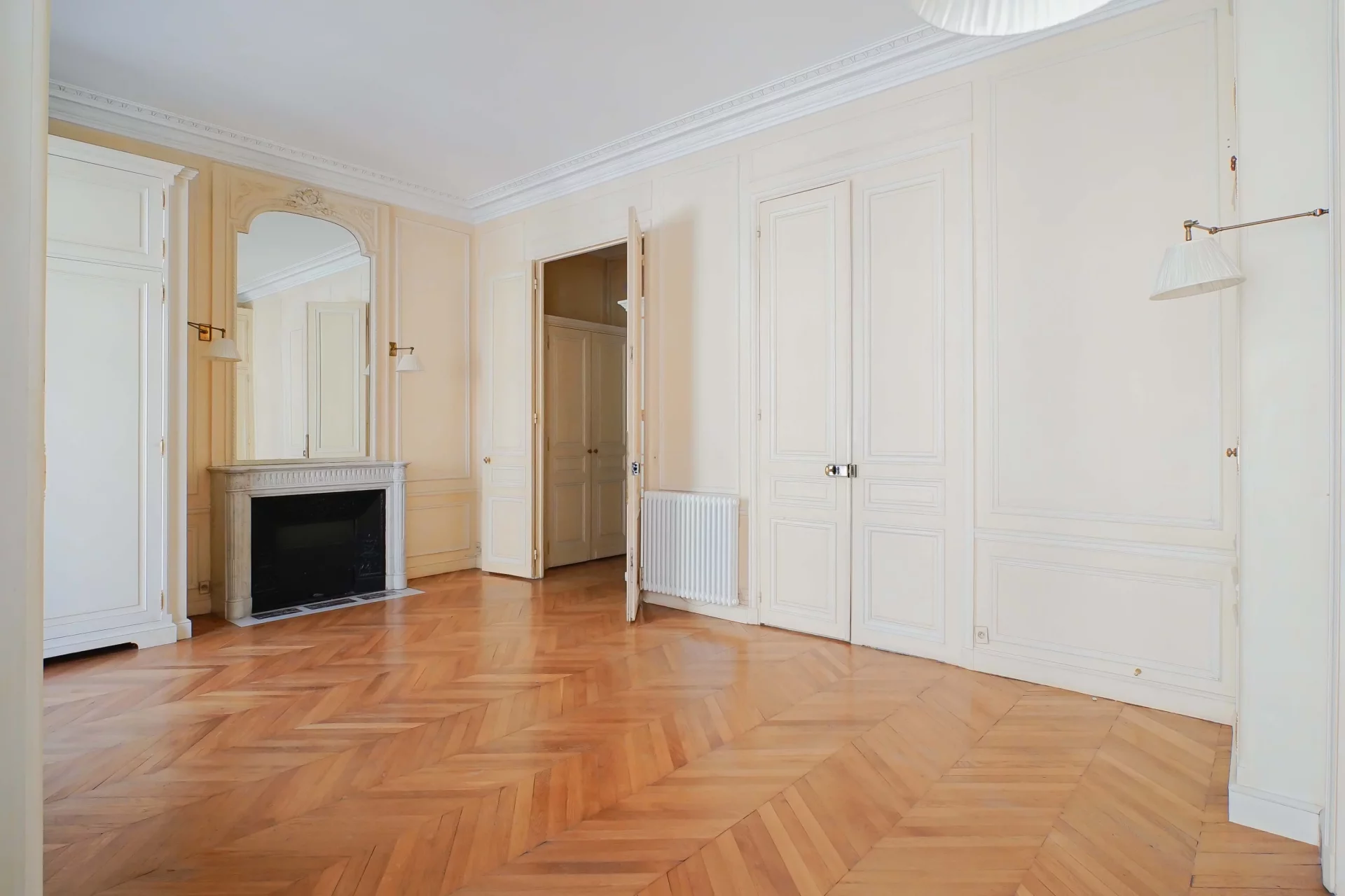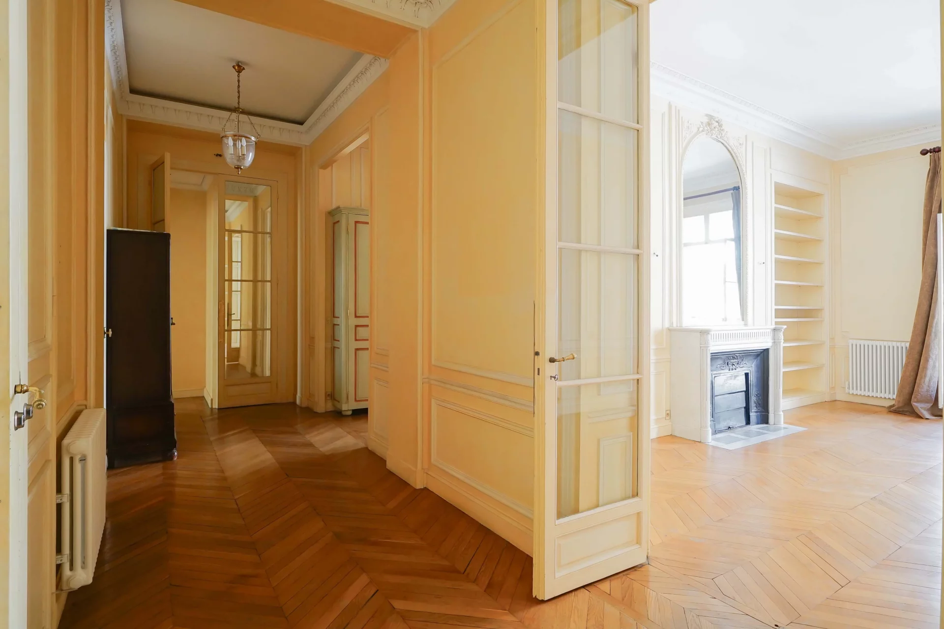Au deuxième étage d’un élégant immeuble haussmannien par ascenseur avec service de conciergerie, cet appartement de caractère de 155,25m² loi Carrez offre tout le charme de l’ancien: parquet point de Hongrie, moulures, cheminées et belle hauteur sous plafond.