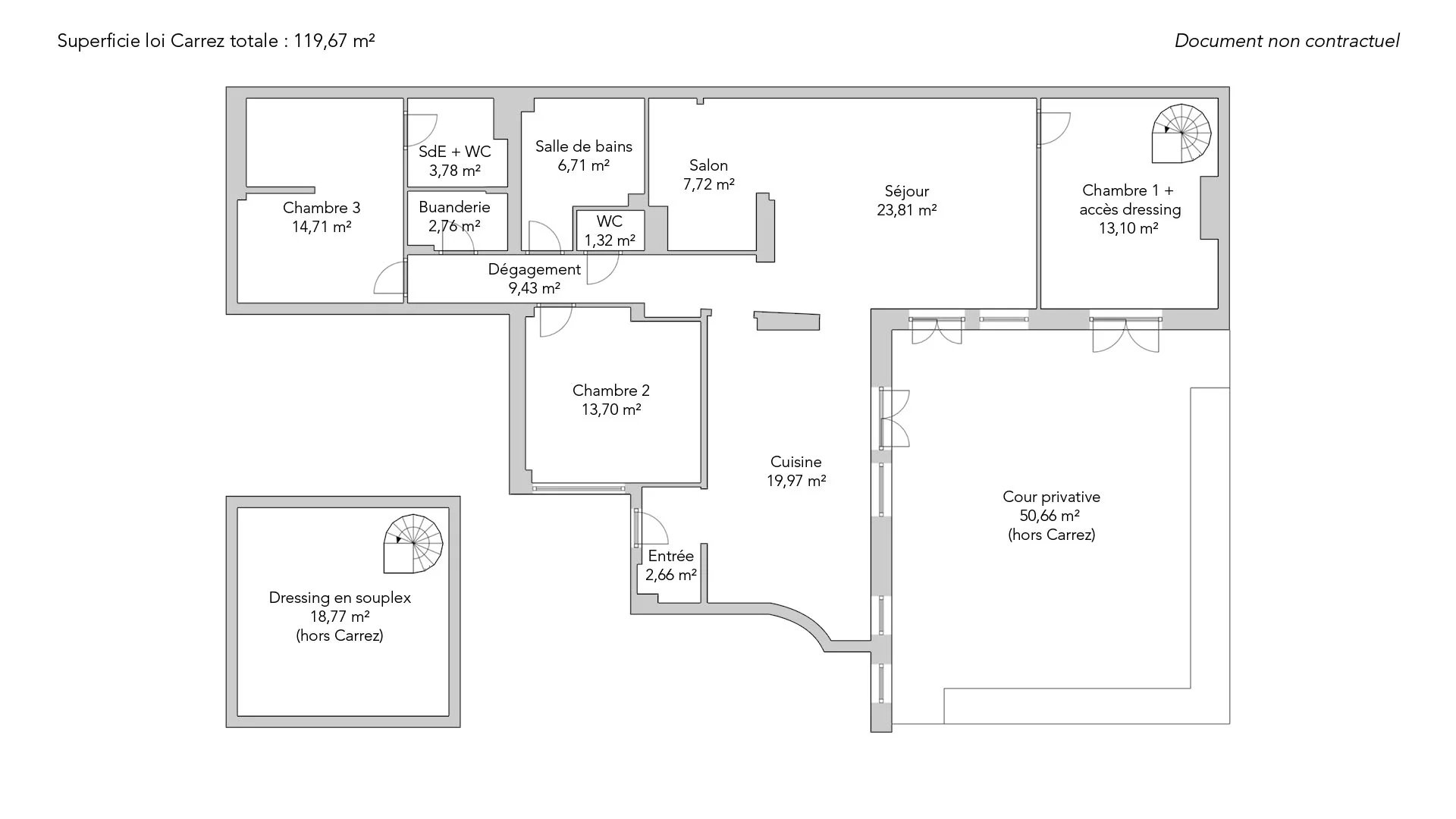 Le plan parfaitement optimisé propose une entrée avec placards, une cuisine ouverte sur une vaste salle à manger, un séjour chaleureux, trois chambres dont une en suite avec salle de douche et toilettes, une salle de bains, des toilettes indépendantes et de nombreux rangements intégrés. Un grand dressing de 19m² en souplex complète ce bien rare.