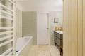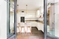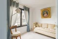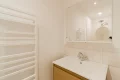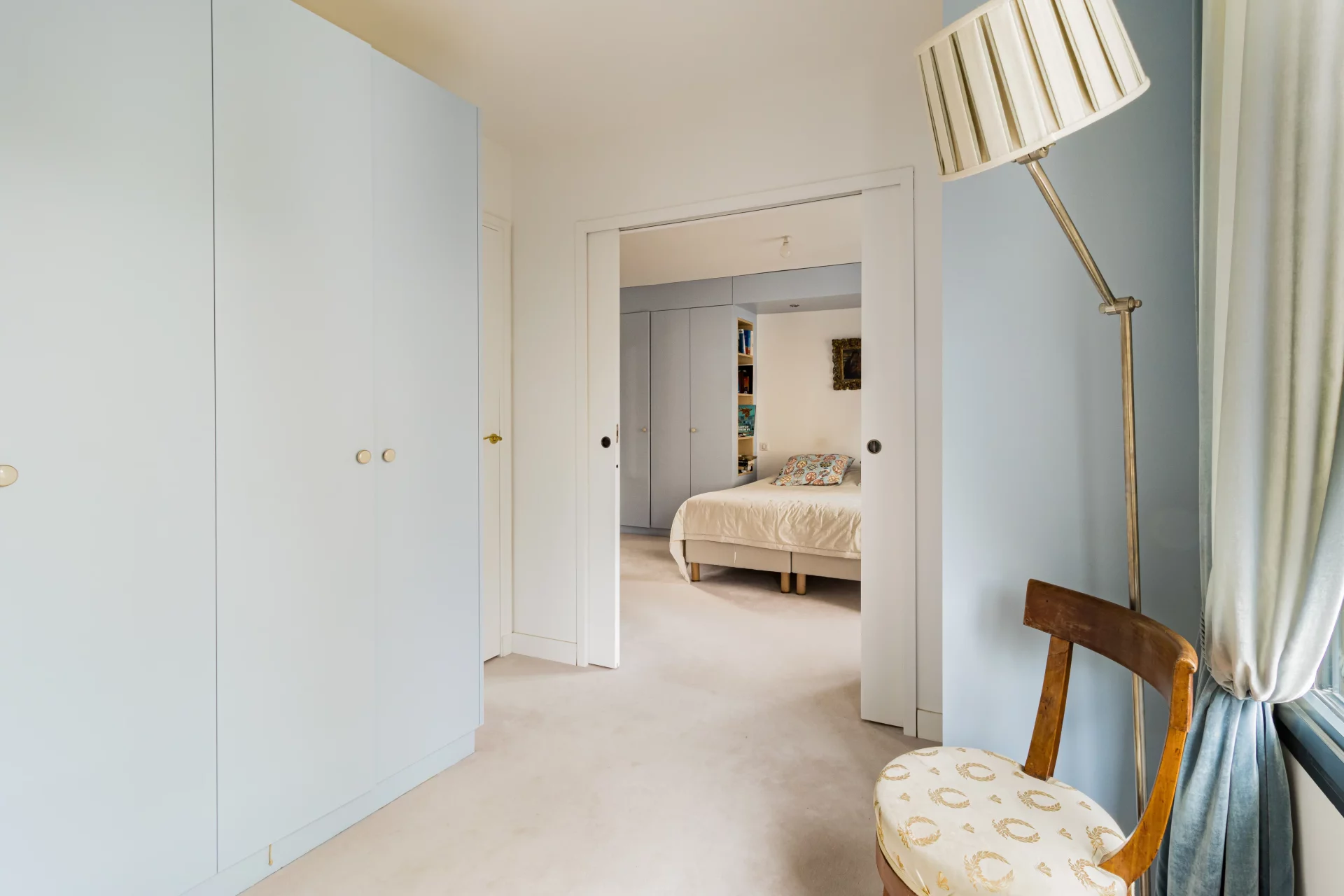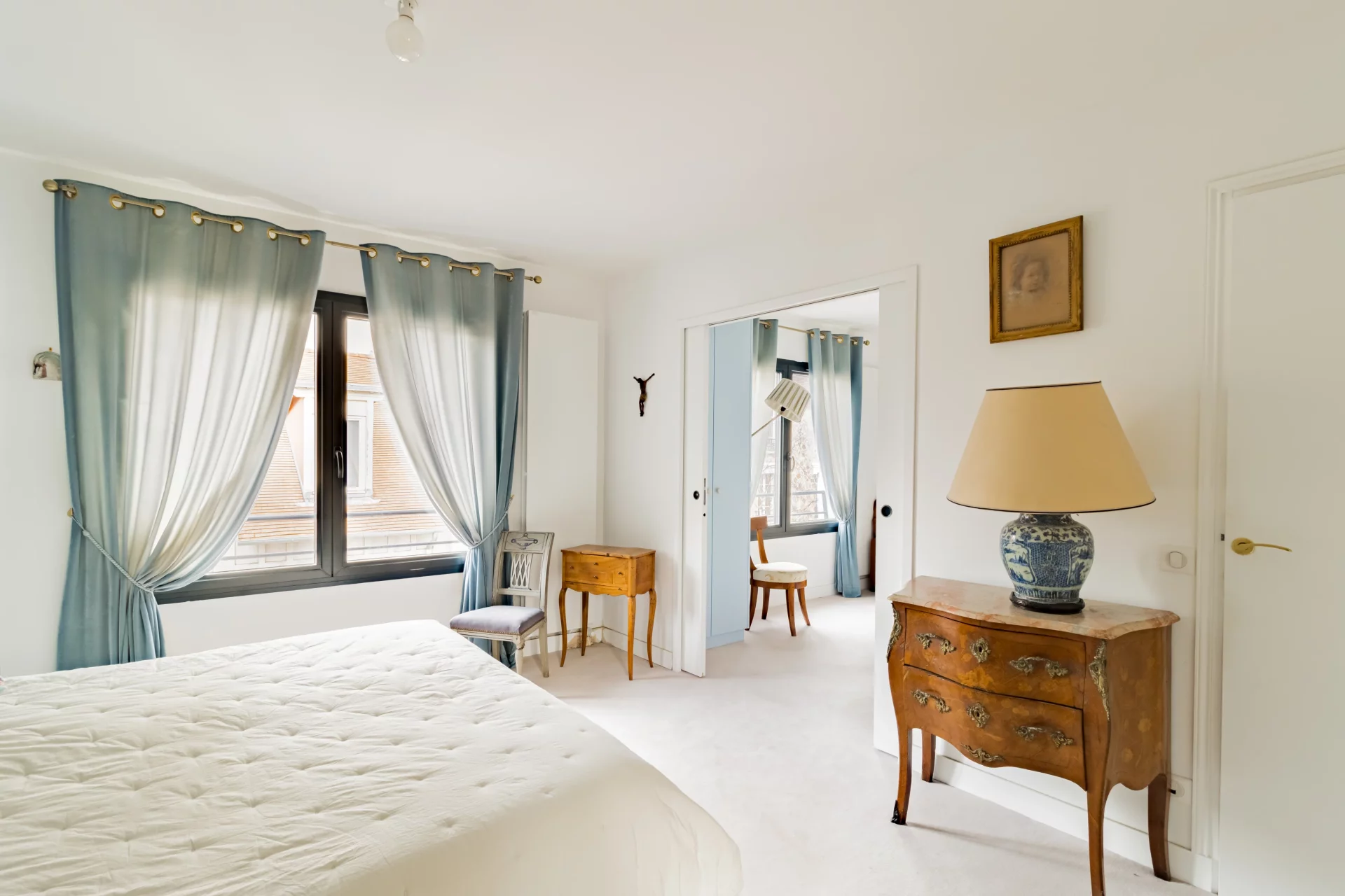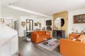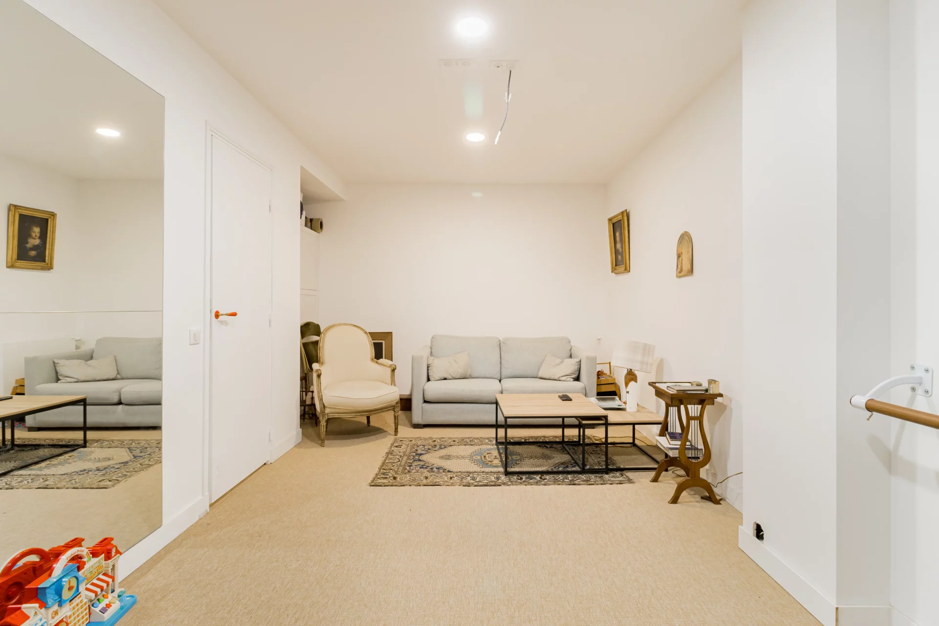 Au premier étage, l’espace de vie s’articule autour d’un vaste double séjour baigné de lumière grâce à ses grandes baies vitrées donnant sur une rue calme et charmante.