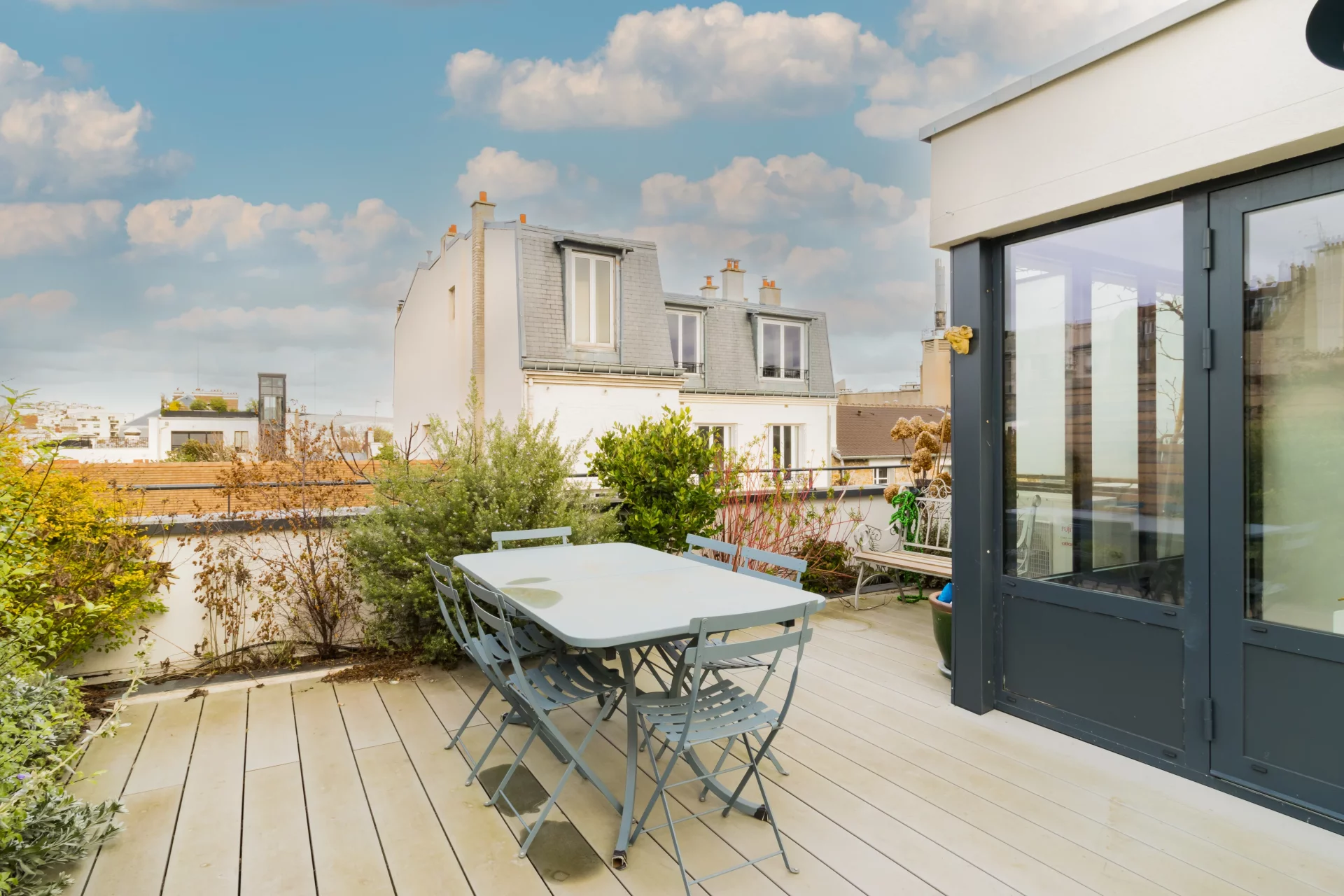 Le troisième étage abrite un espace cuisine fermé menant à une magnifique terrasse arborée de 30m², offrant une vue panoramique dégagée sur les environs, un véritable havre de paix.