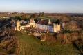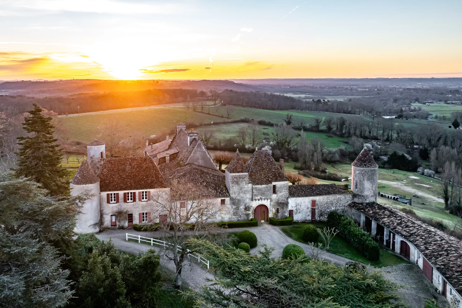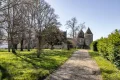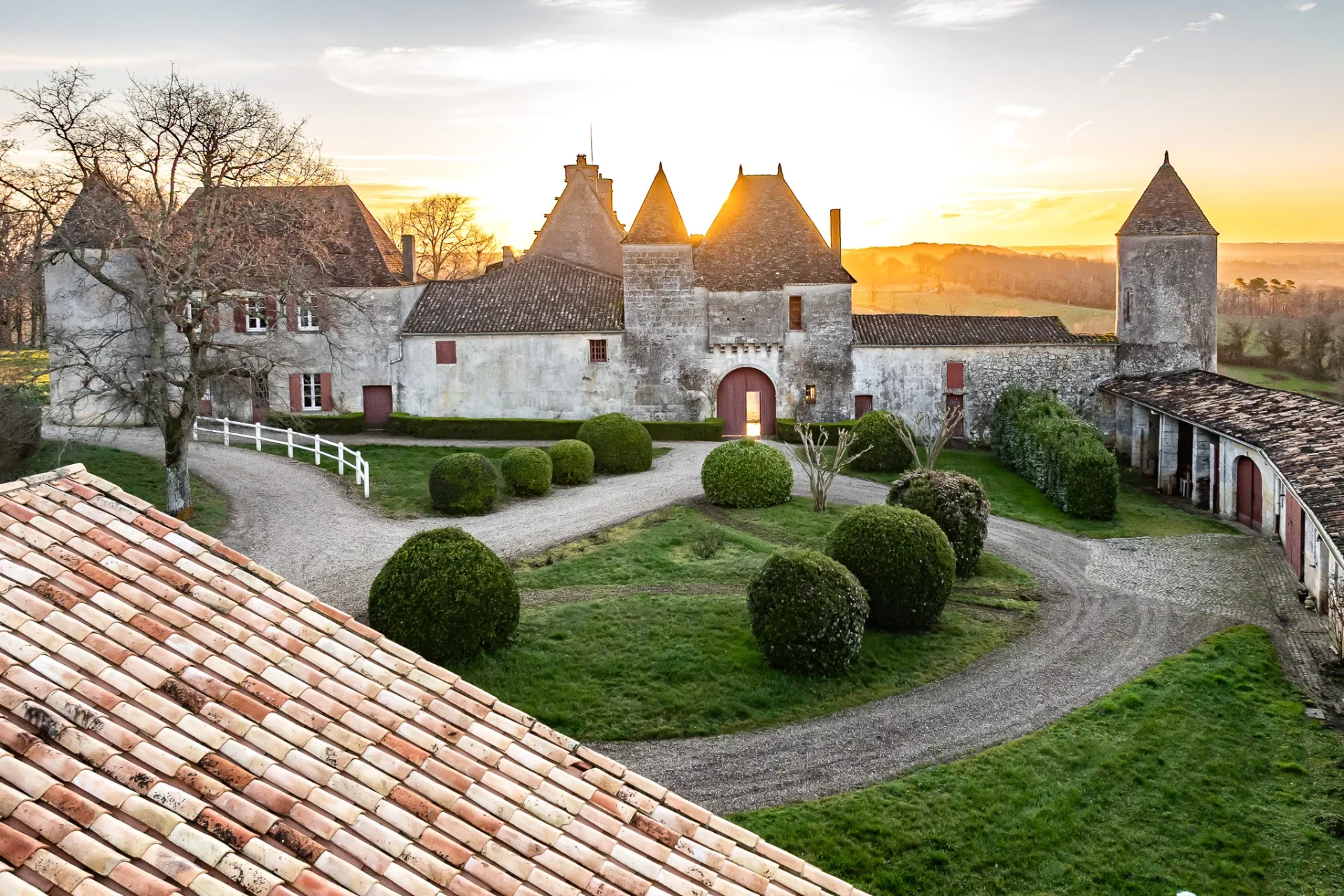 Dominant les coteaux de Castillon-la-Bataille, célèbre pour sa bataille de 1453 marquant la fin de la guerre de Cent Ans, le château s’étend sur 112 hectares de vignes, prés et bois, à quelques kilomètres de Saint-Émilion. Bâti à partir du XIVe et remanié au XIXe siècle, ce domaine d’exception allie histoire et prestige. Son architecture, typique du XVe siècle avec ses toits pentus en tuiles plates et ses trois tours d’angle, dont une abrite une chapelle, en fait un témoignage rare du patrimoine bordelais. Le parc, ceint de murailles et de tours rondes, offre une vue imprenable sur la vallée.