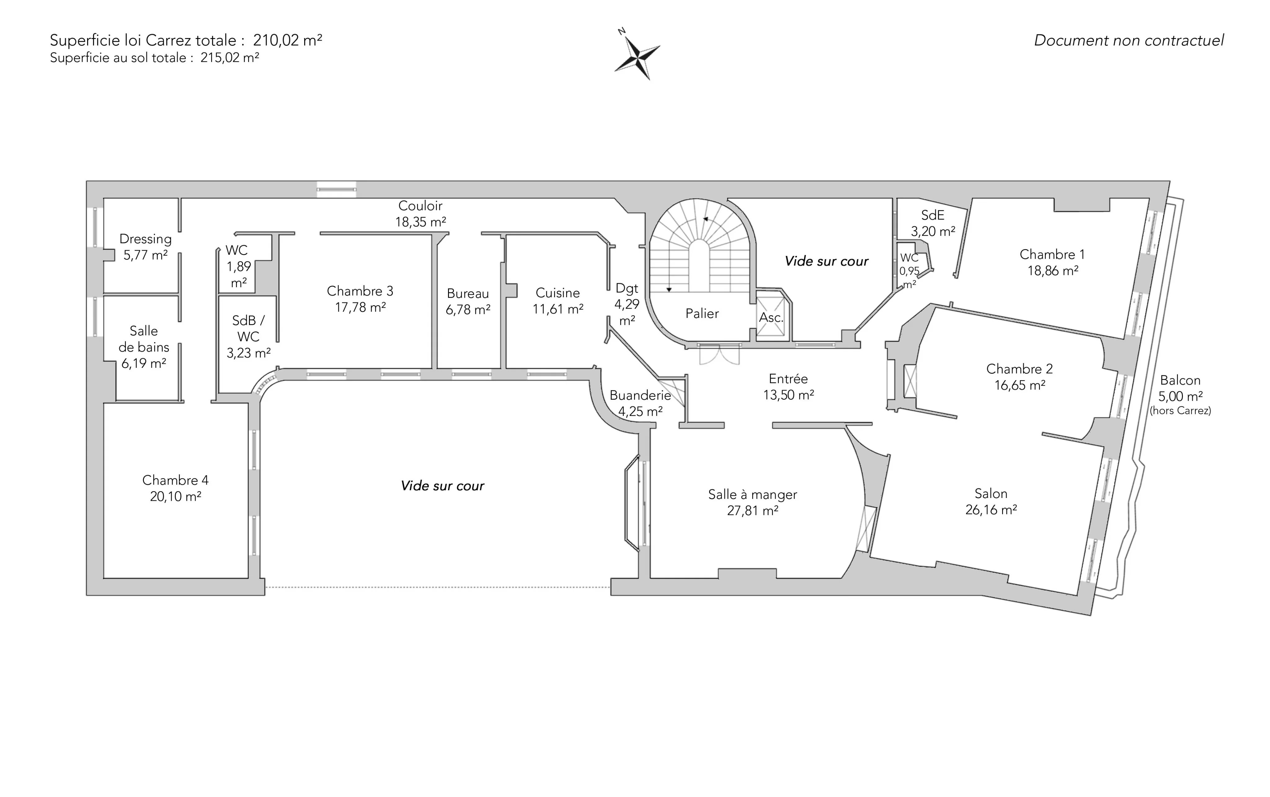 Seul sur le palier au deuxième étage d'un immeuble haussmannien parfaitement entretenu, avec ascenseur, cet appartement de 213m² comporte un séjour ouvert sur un magnifique balcon filant en pierre, une agréable salle à manger ainsi qu’une cuisine indépendante avec espace buanderie.