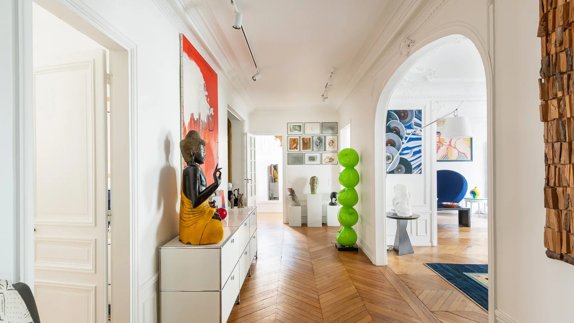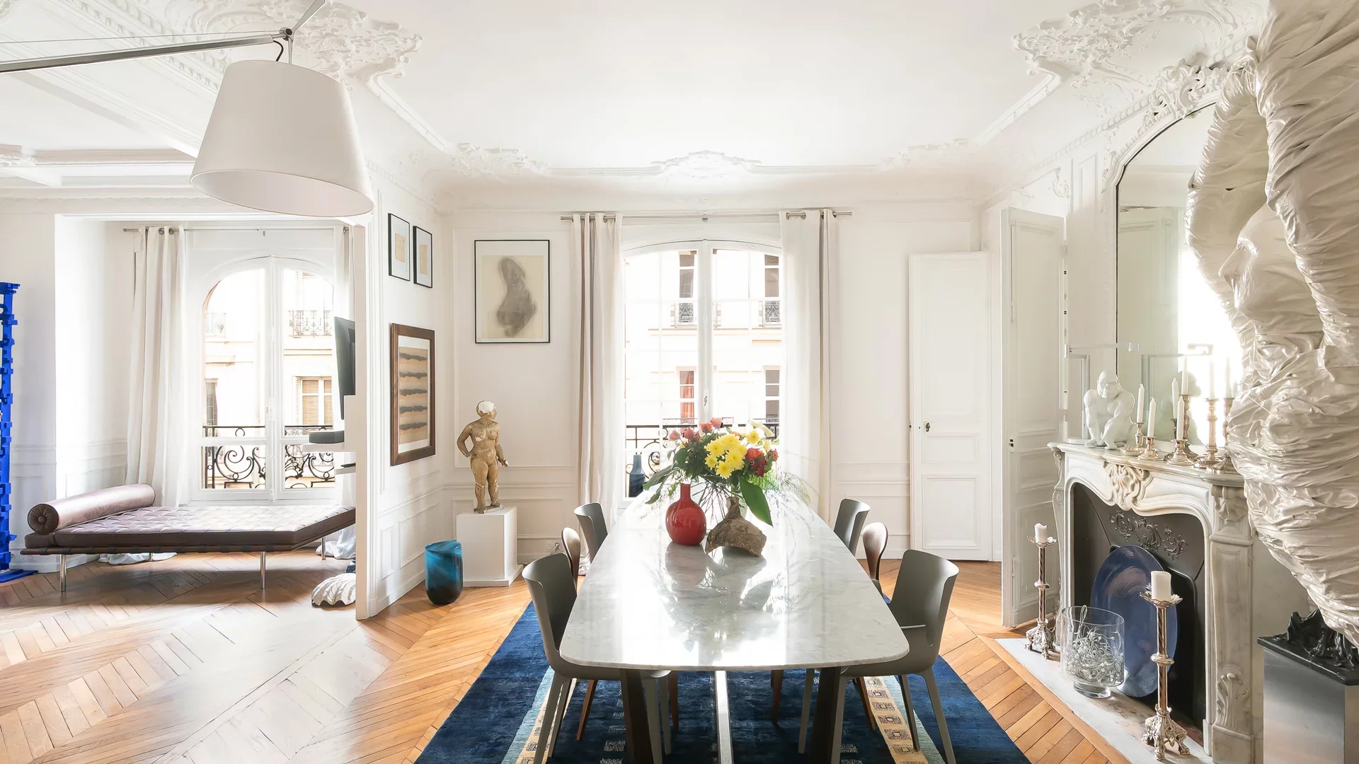 Il s’ouvre sur une somptueuse réception de 63 m², aux volumes remarquables (3 m de hauteur sous plafond), sublimée par parquets, moulures et cheminées.