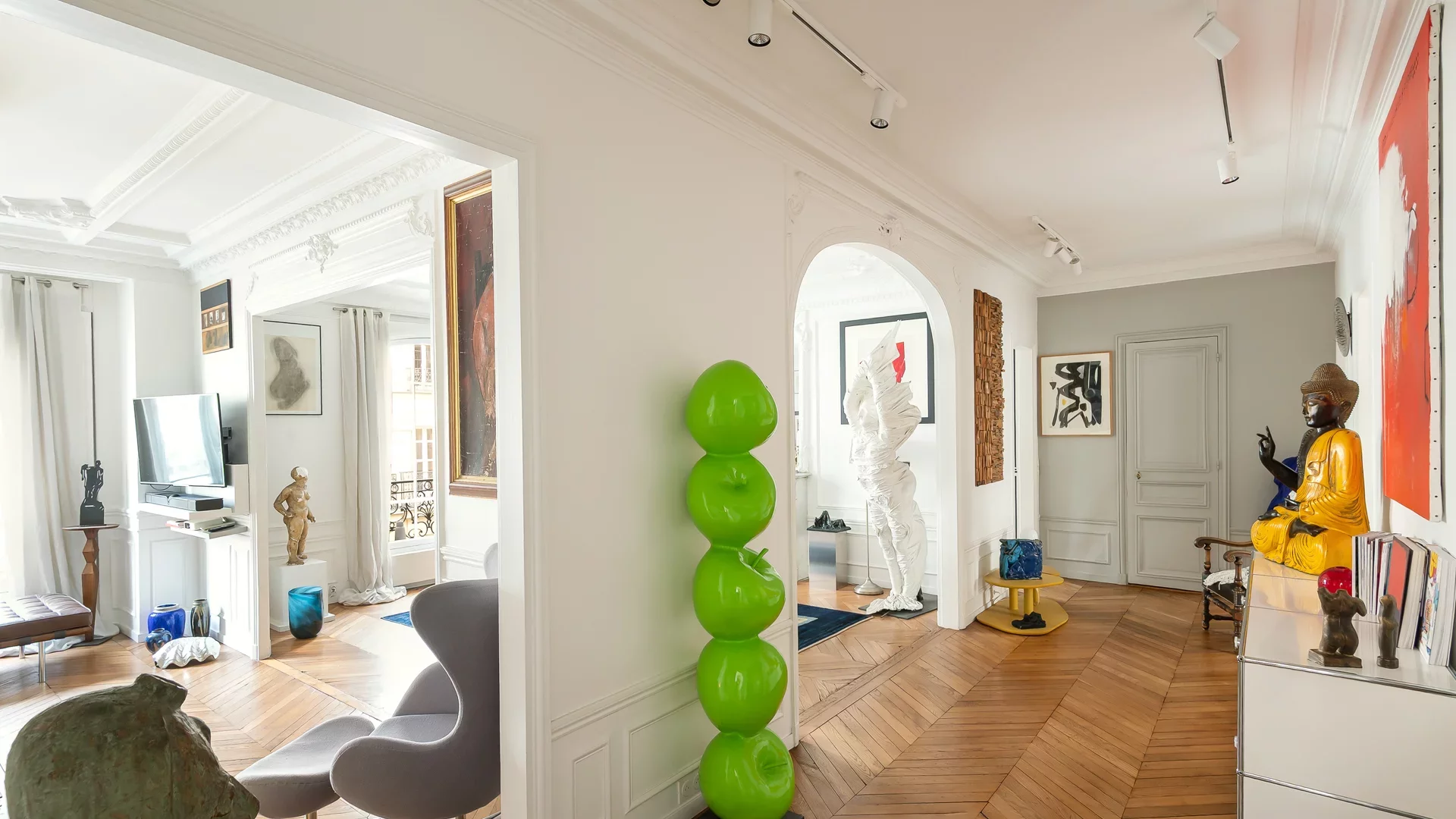 À la lisière du 9ème arrondissement, dans une rue calme et recherchée du 10ème, au sein d’un bel immeuble en pierre de taille avec ascenseur, seul sur le palier, superbe appartement traversant de 150,03 m² loi Carrez (157,50 m² au sol), situé au troisième étage et entièrement rénové par architecte avec des matériaux de grande qualité.