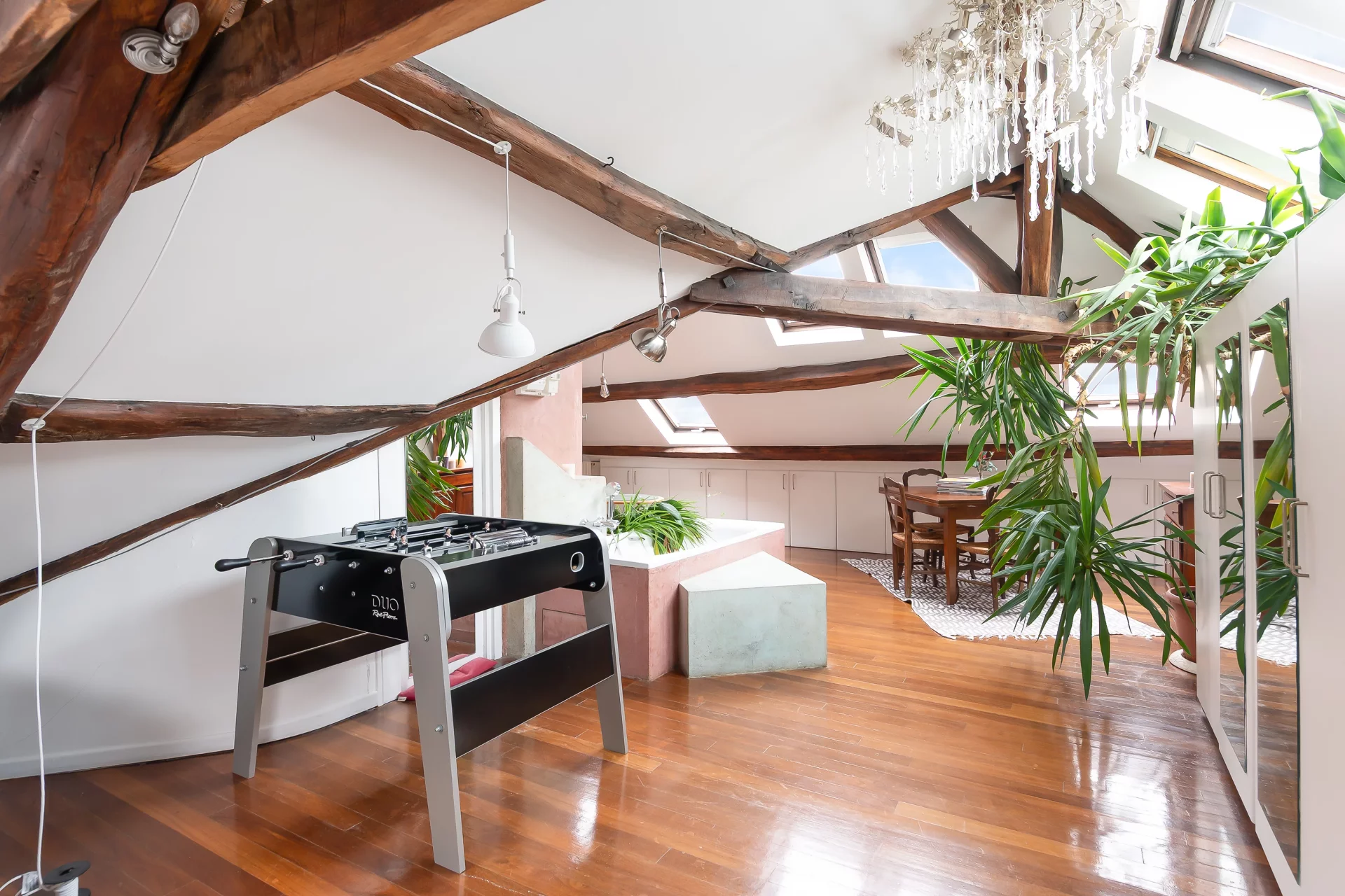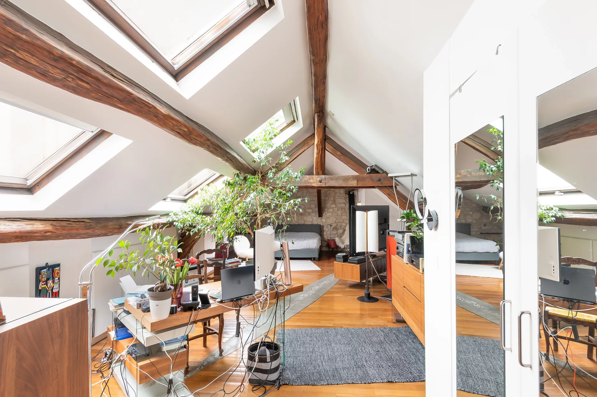 Ce lieu bénéficie d'une belle lumière grâce aux nombreux vélux répartis dans tout l’appartement et d'aucun vis-à-vis.