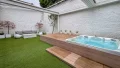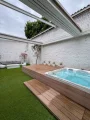 Le rez-de-chaussée s’ouvre sur une pièce de vie spectaculaire de 82m², baignée de lumière grâce à ses larges baies vitrées. Elle comprend un séjour ouvert avec cheminée au gaz contemporaine, une cuisine moderne et un parquet chaleureux. L’espace se prolonge vers un patio intimiste de 61,52m², idéal pour recevoir ou se détendre, avec jacuzzi intégré.