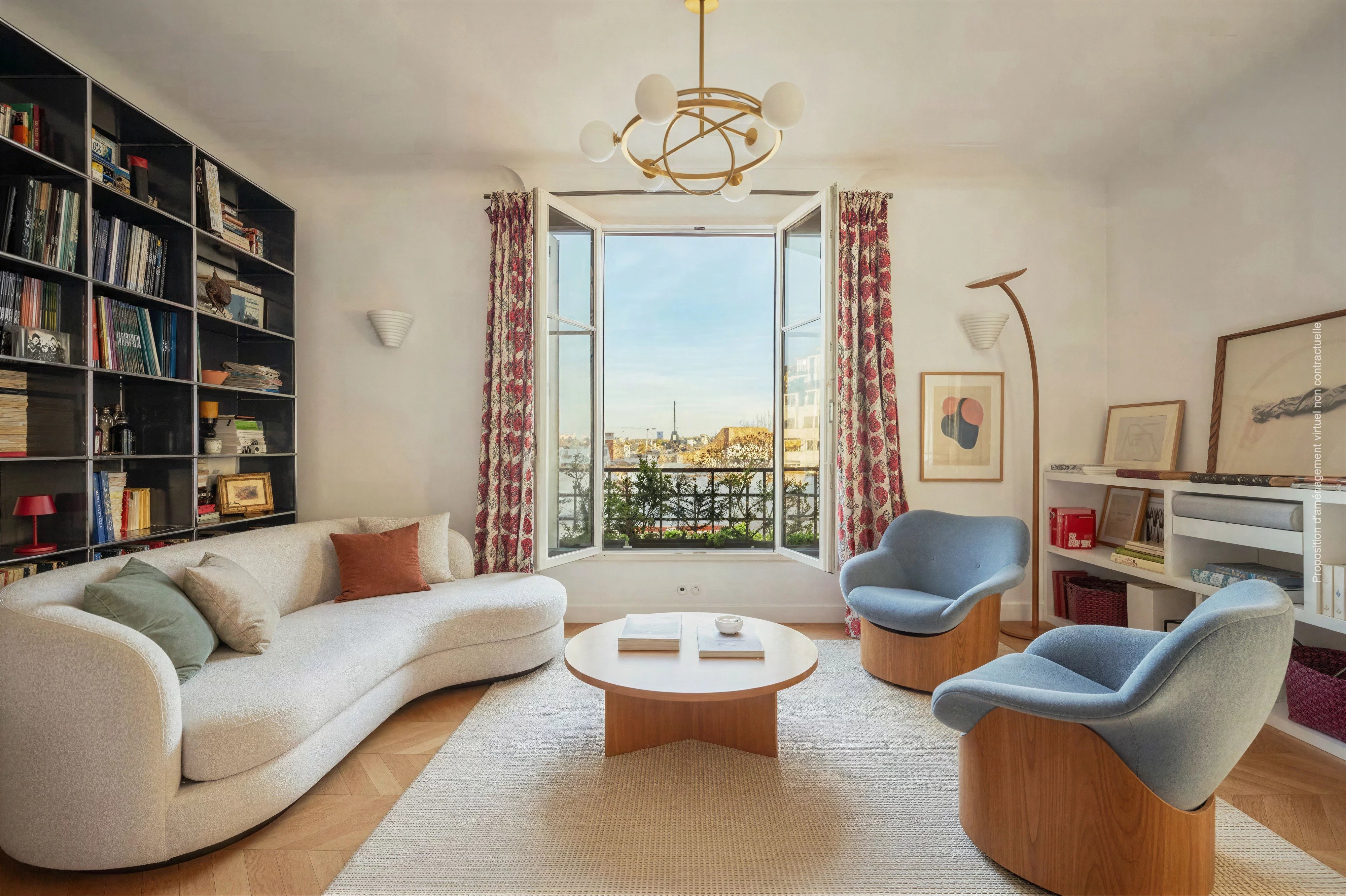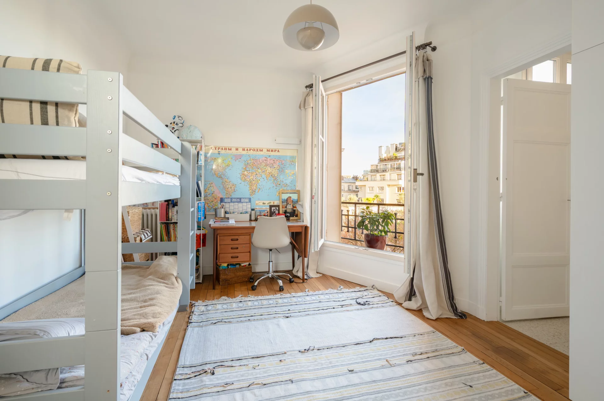 Rénové récemment avec des matériaux de grande qualité, il comprend une entrée desservant une chambre parentale, une salle de douche et un salon avec une vue dégagée plein sud et, en majesté, la tour Eiffel. La cuisine dînatoire est attenante. Deux grandes chambres d'enfants se partagent une salle de bains avec toilettes.