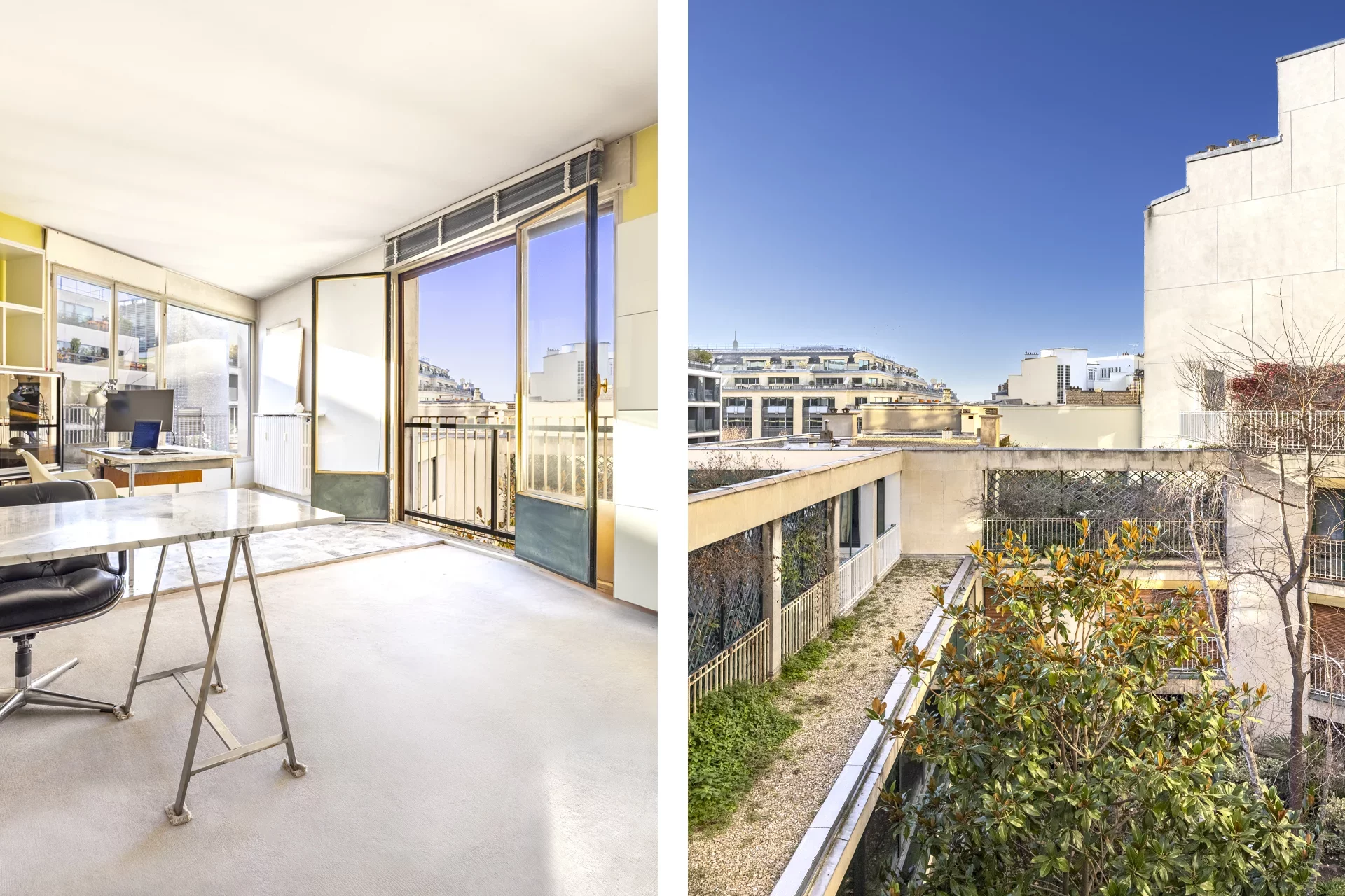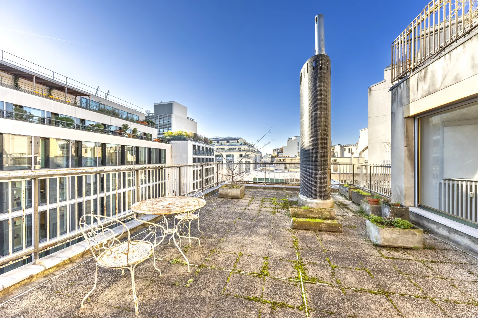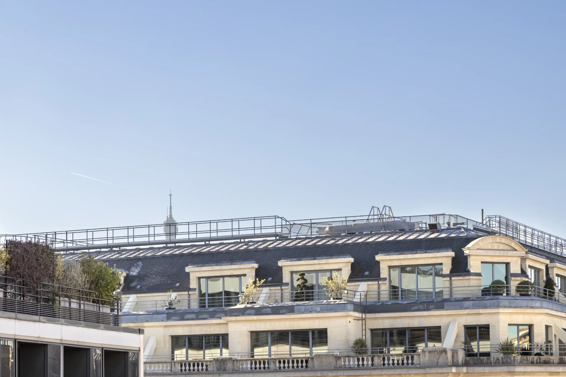 Bénéficiant d’une exposition sud-ouest, le séjour s’ouvre sur cette grande terrasse de 56 m², offrant une vue dégagée avec perspective sur la Tour Eiffel, rare dans ce secteur recherché.