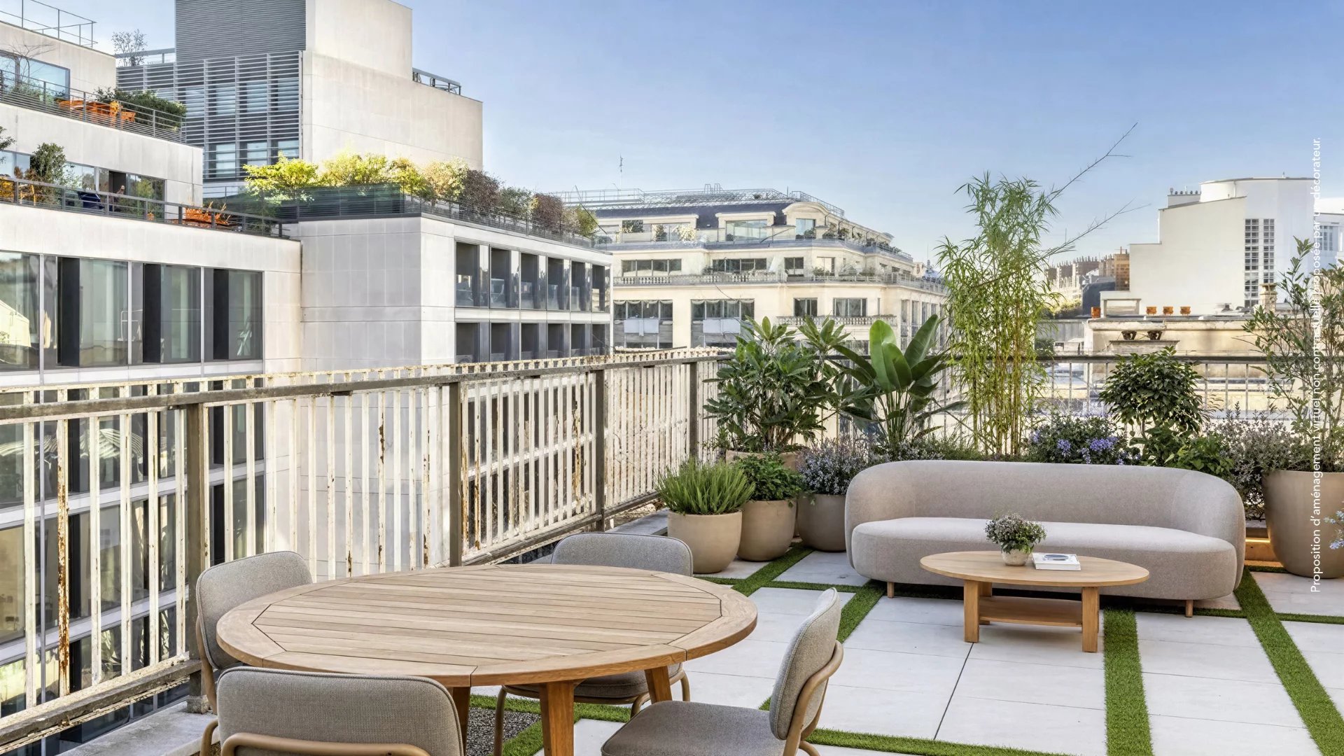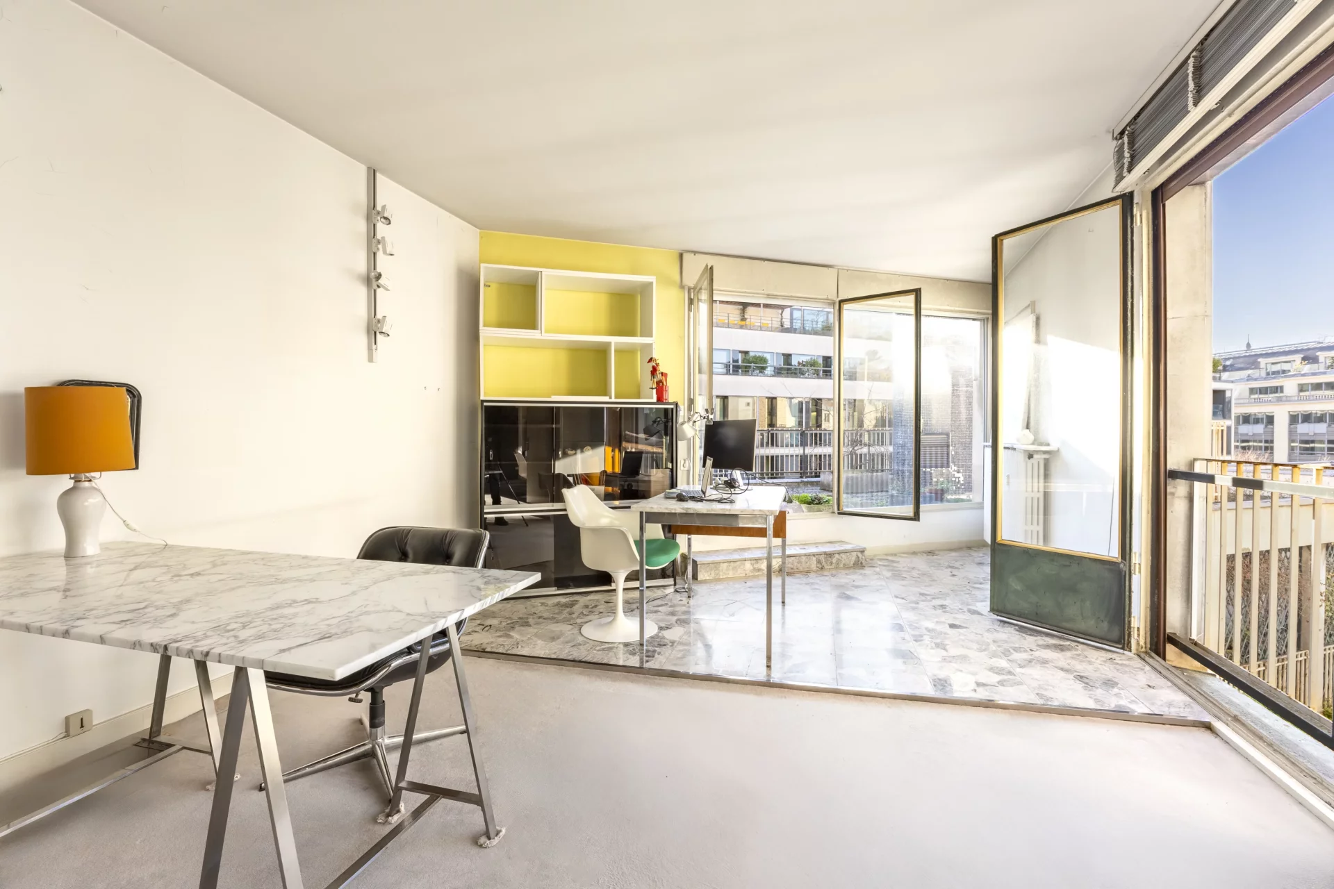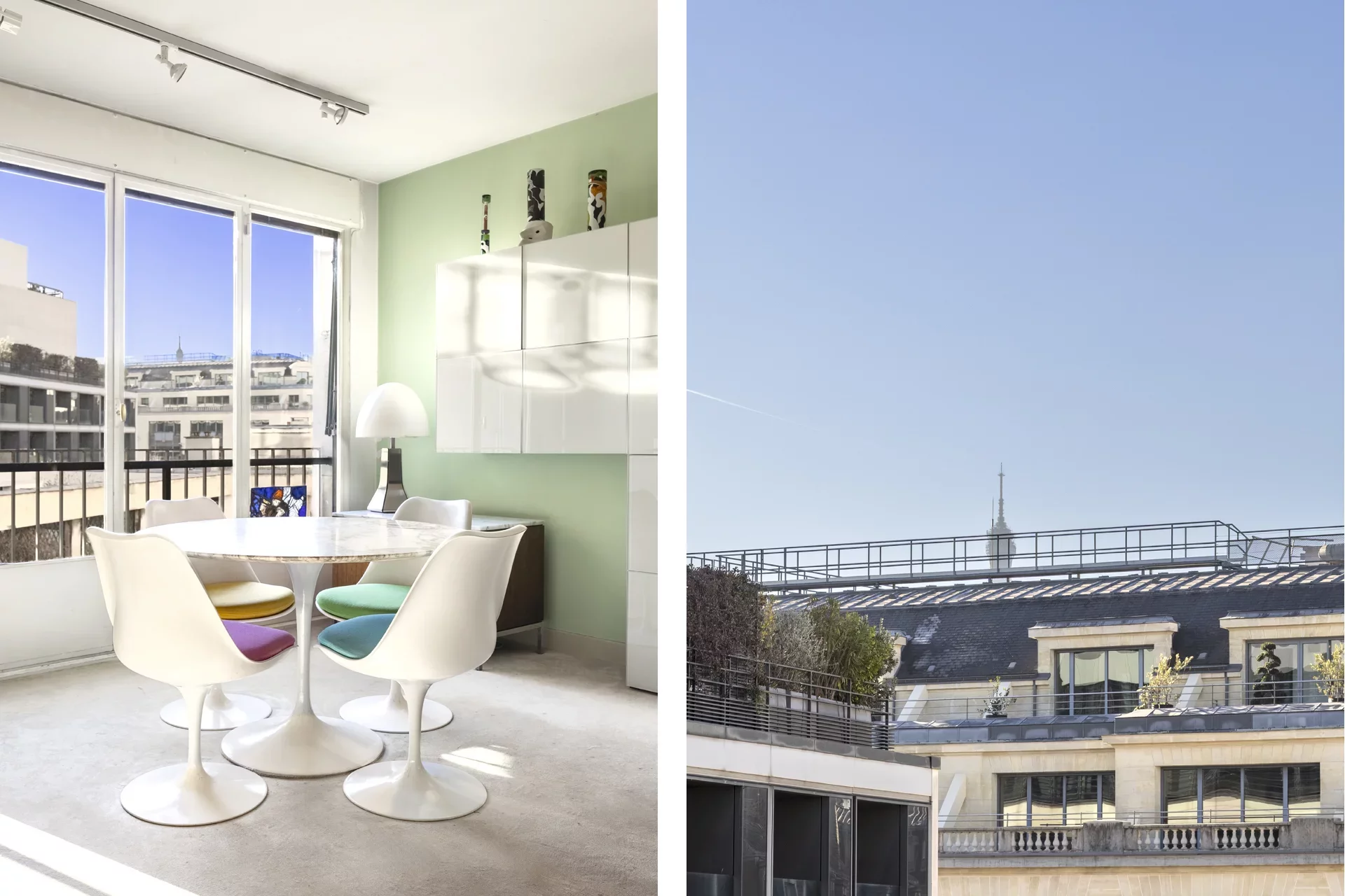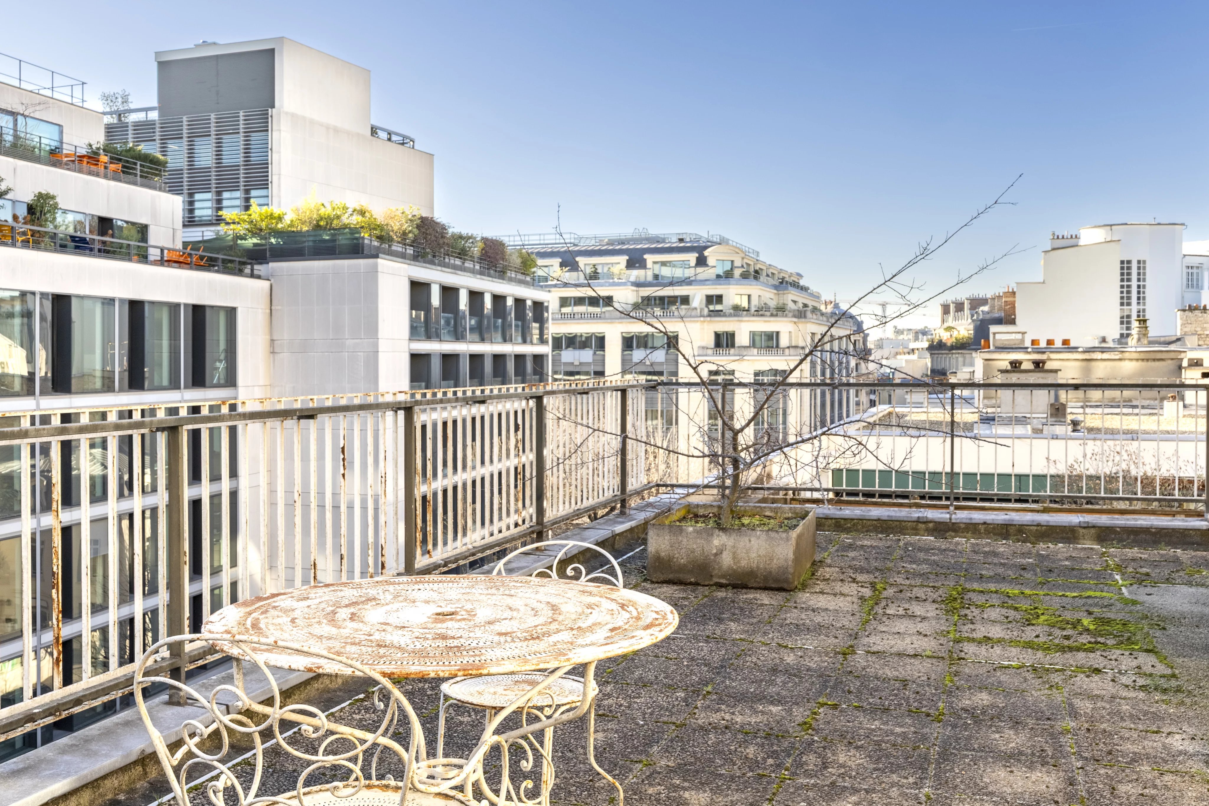 Bénéficiant d’une exposition sud-ouest, le séjour s’ouvre sur cette grande terrasse de 56 m², offrant une vue dégagée avec perspective sur la Tour Eiffel, rare dans ce secteur recherché.