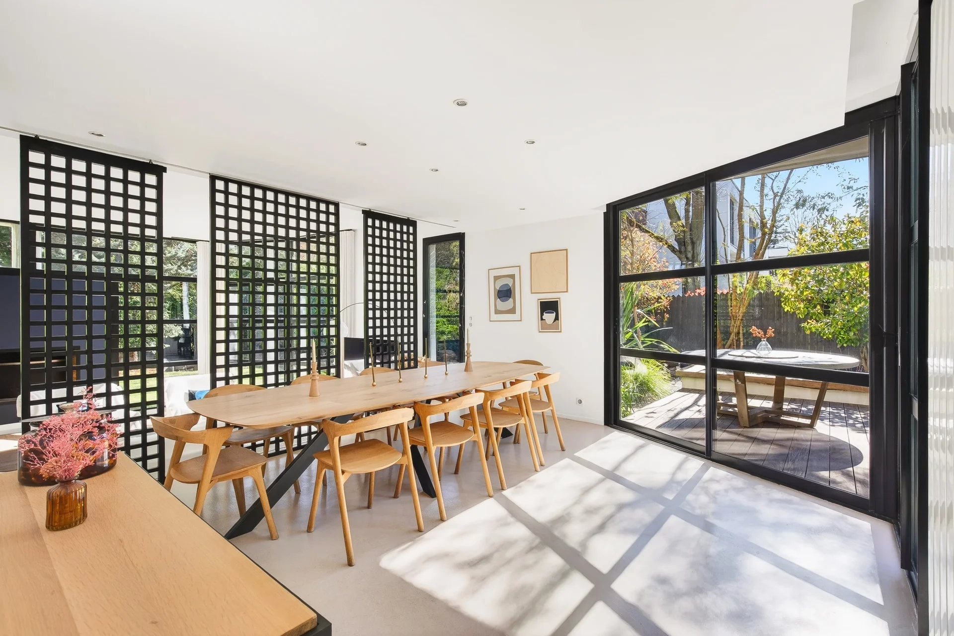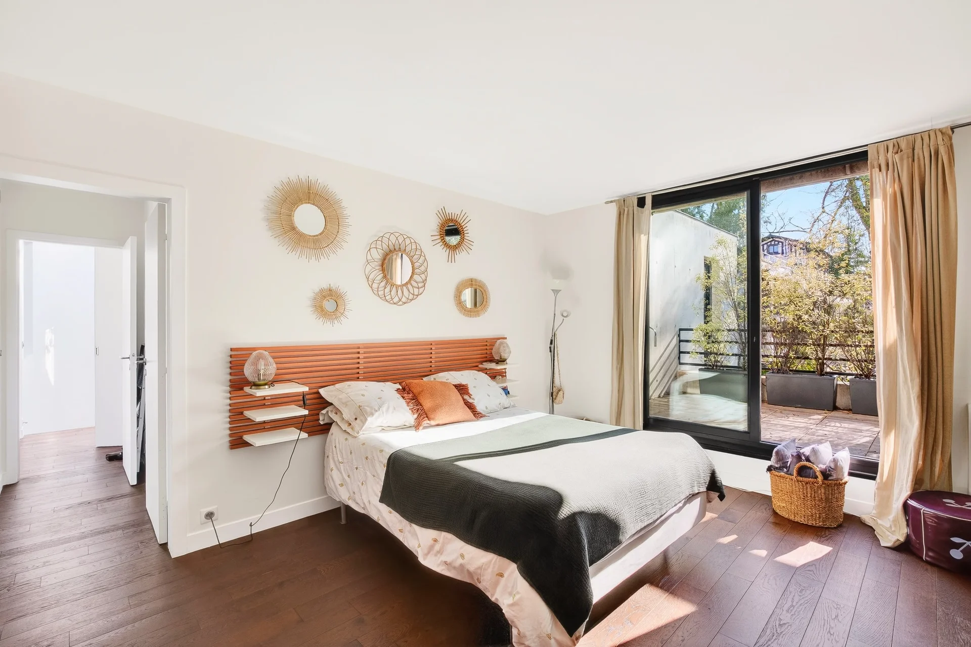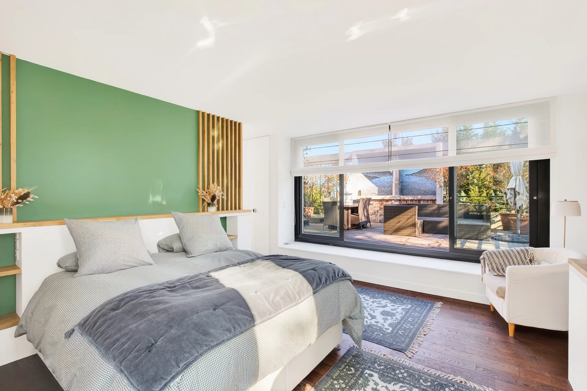 Au rez-de-jardin, l’entrée, agrémentée de rangements, s’ouvre sur un superbe espace de réception de 46 m² avec cheminée, baigné de lumière grâce à de larges baies vitrées et bénéficiant d’une hauteur sous plafond de plus de 3 mètres. La spacieuse salle à manger se prolonge naturellement vers une cuisine contemporaine entièrement équipée, l’ensemble offrant un accès de plain-pied à la terrasse et au jardin paysager. Une première chambre avec sa salle d’eau et ses toilettes, une pièce polyvalente (bureau, salle de sport), ainsi que des toilettes indépendantes complètent ce niveau.