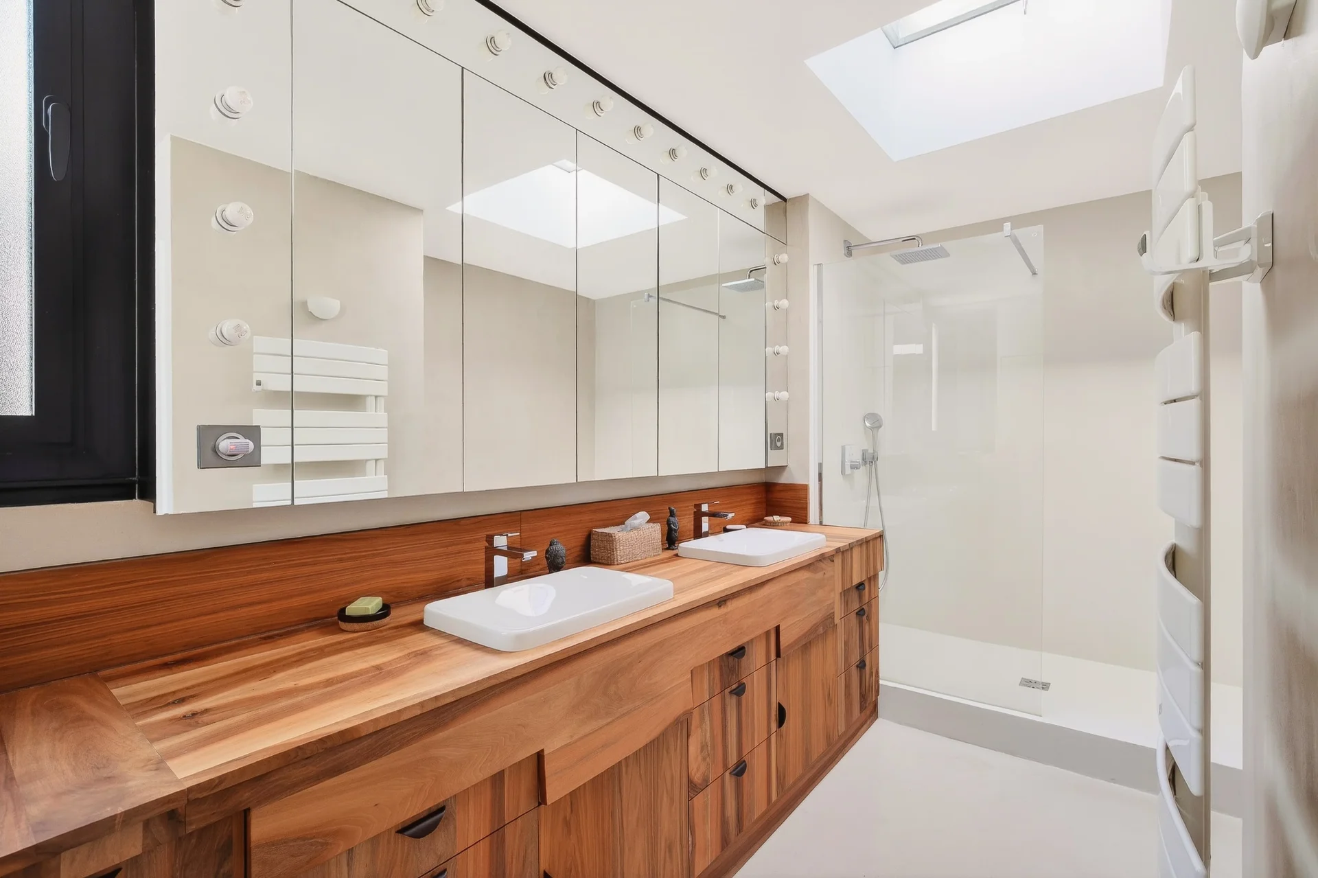À l’étage, une suite parentale lumineuse dispose de sa salle de douche, d’un dressing et d’un accès direct à une spacieuse terrasse à l’abri des regards. Deux autres chambres complètent ce niveau : l’une bénéficie d’une salle de bains privative avec toilettes et d’un accès à une terrasse indépendante ; l’autre s’ouvre sur la même terrasse que la suite parentale, offrant une belle continuité des espaces extérieurs. Ce niveau est également complété par un espace bureau et des toilettes indépendantes.