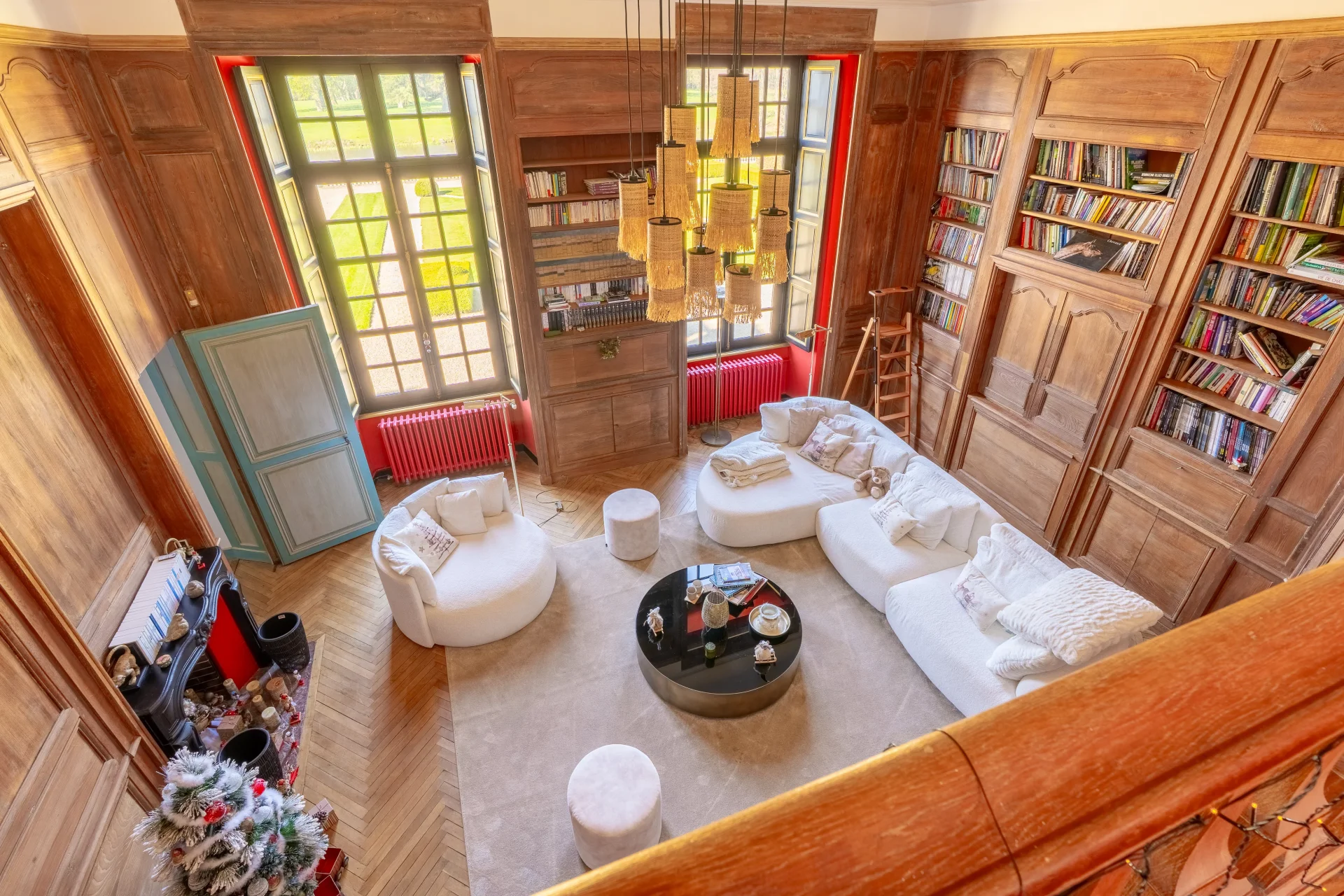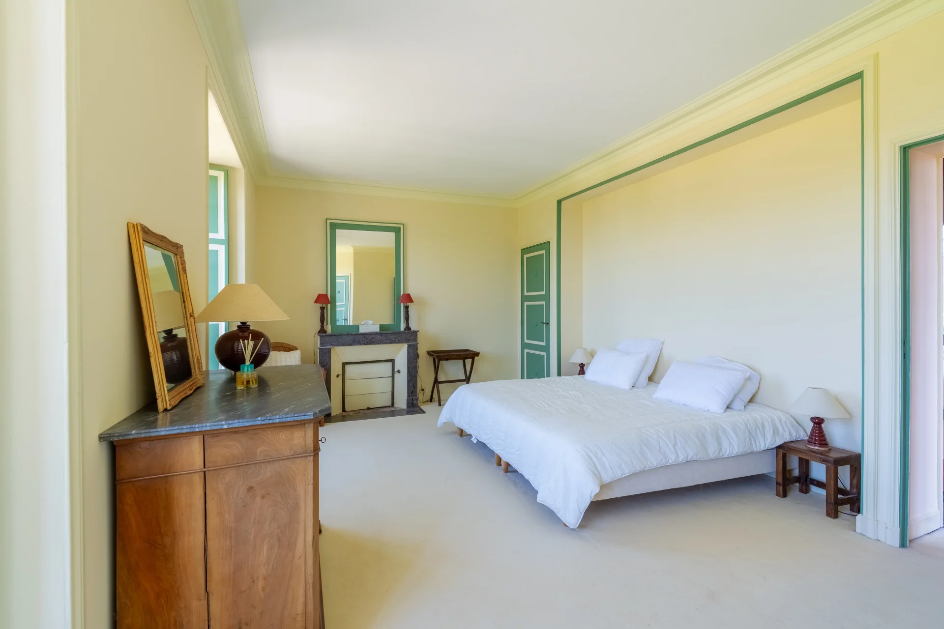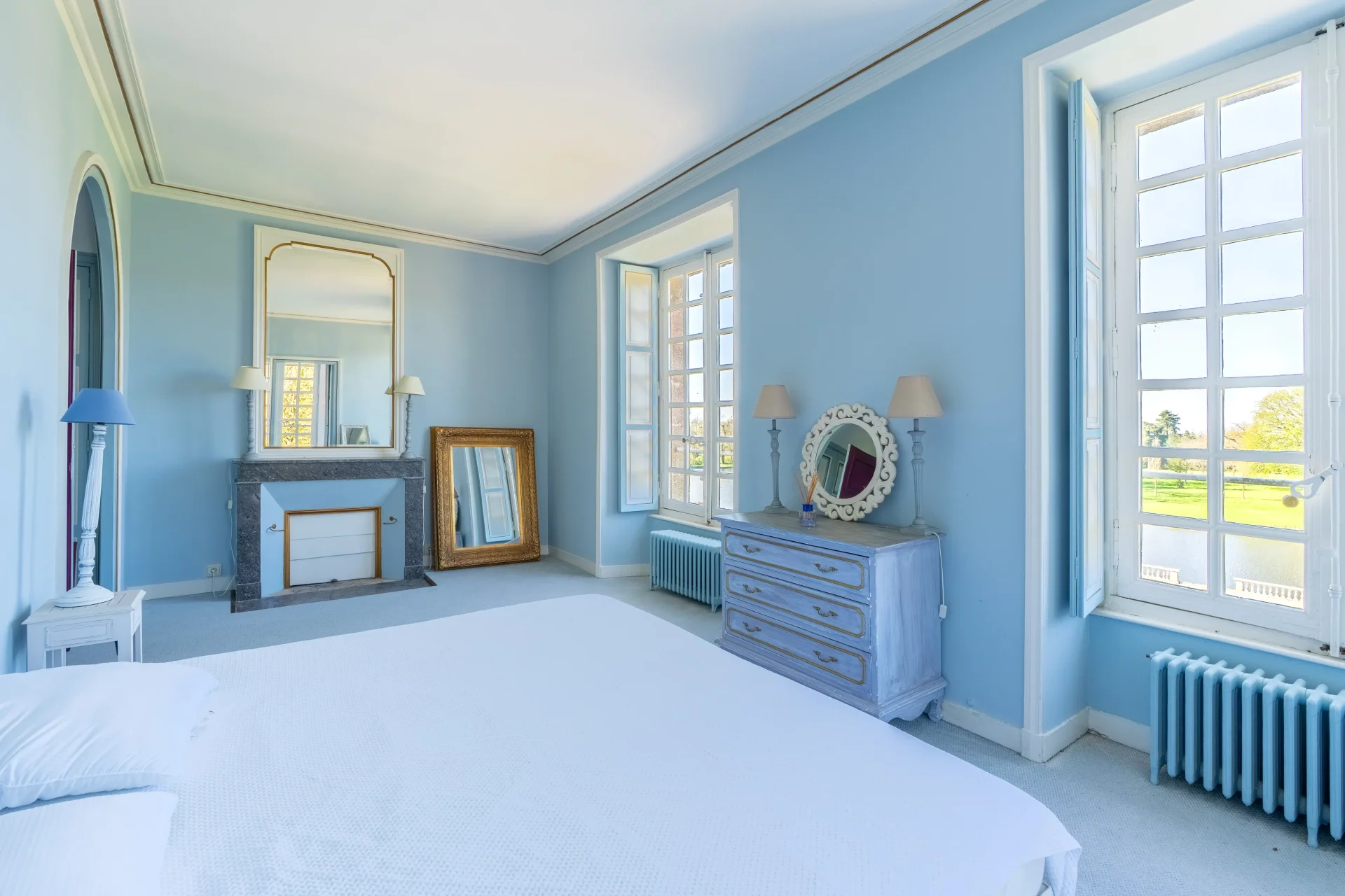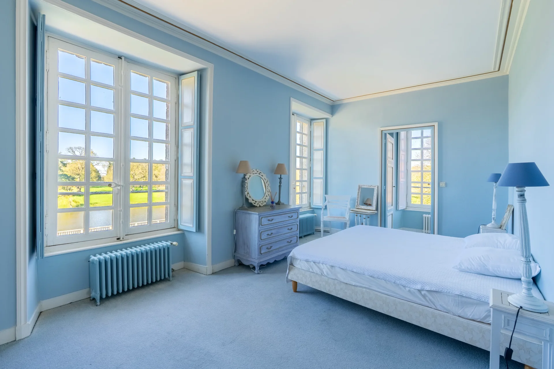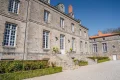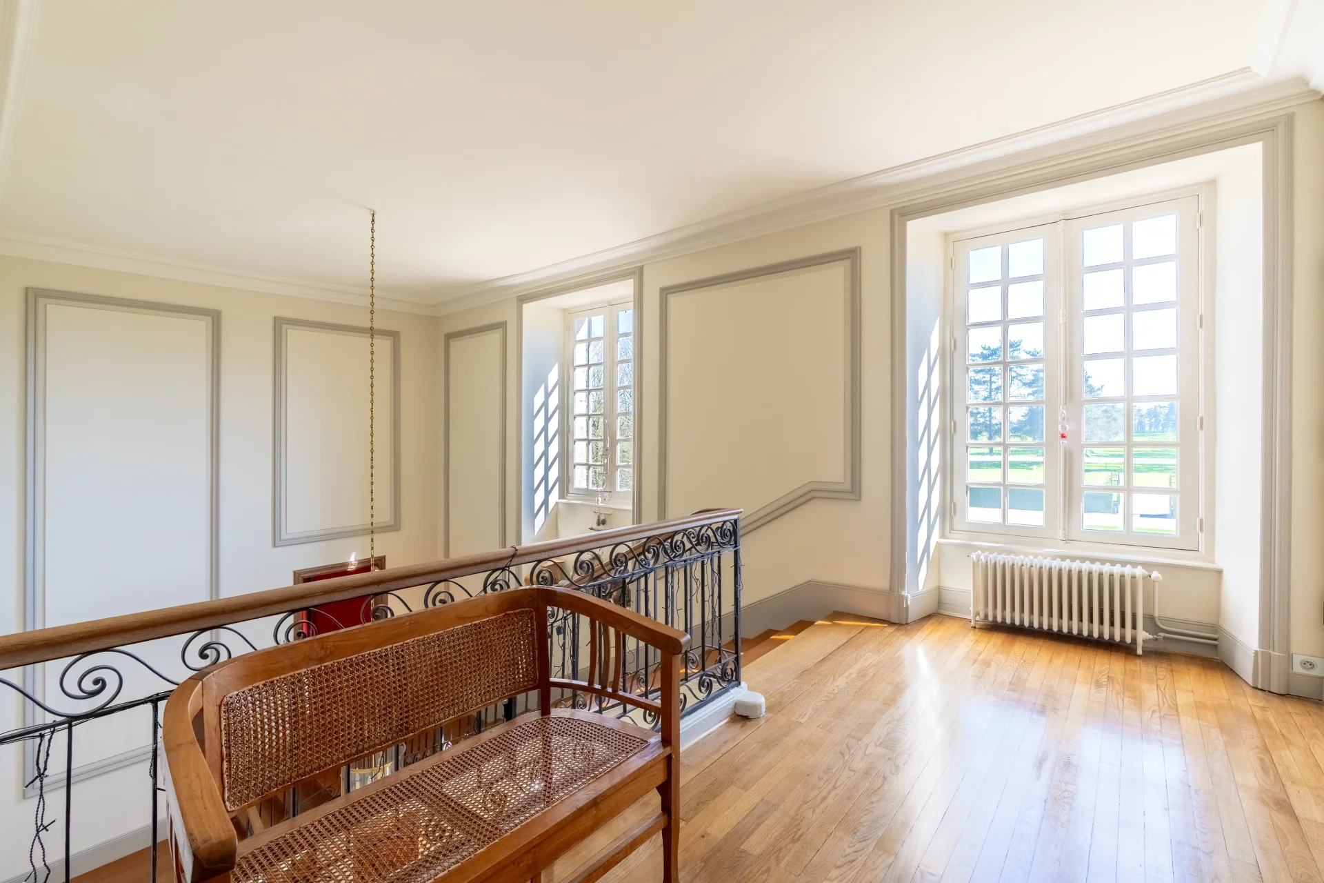 Le corps central en granit déploie sur ses façades nord et sud sept travées de hautes fenêtres à claveaux, couronnées d'une toiture en ardoises à lucarnes. Un élégant escalier en fer à cheval précède au sud l'entrée principale ; au nord, un grand escalier à balustres ouvre sur le jardin. 900m² habitables se répartissent sur quatre niveaux : grand salon de 67m², salon bibliothèque boisé de 54m² avec mezzanine, galerie distribuant trois bureaux, salle à manger, cuisine, sept chambres avec salles de bains, caves, greniers. Parquets à chevrons, boiseries sculptées, cheminées d'époque composent un intérieur raffiné, doté du confort moderne, géothermie et fibre optique.