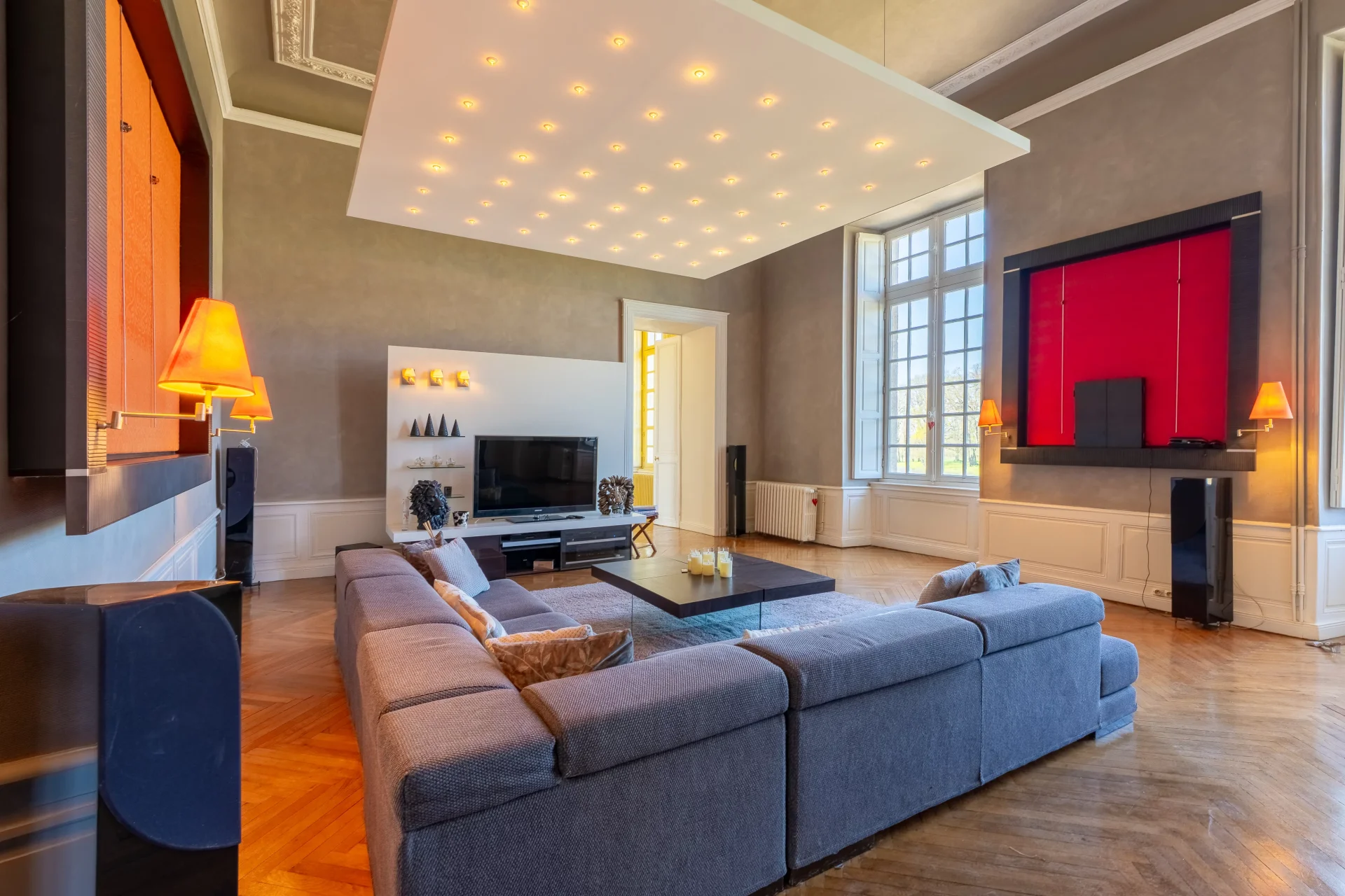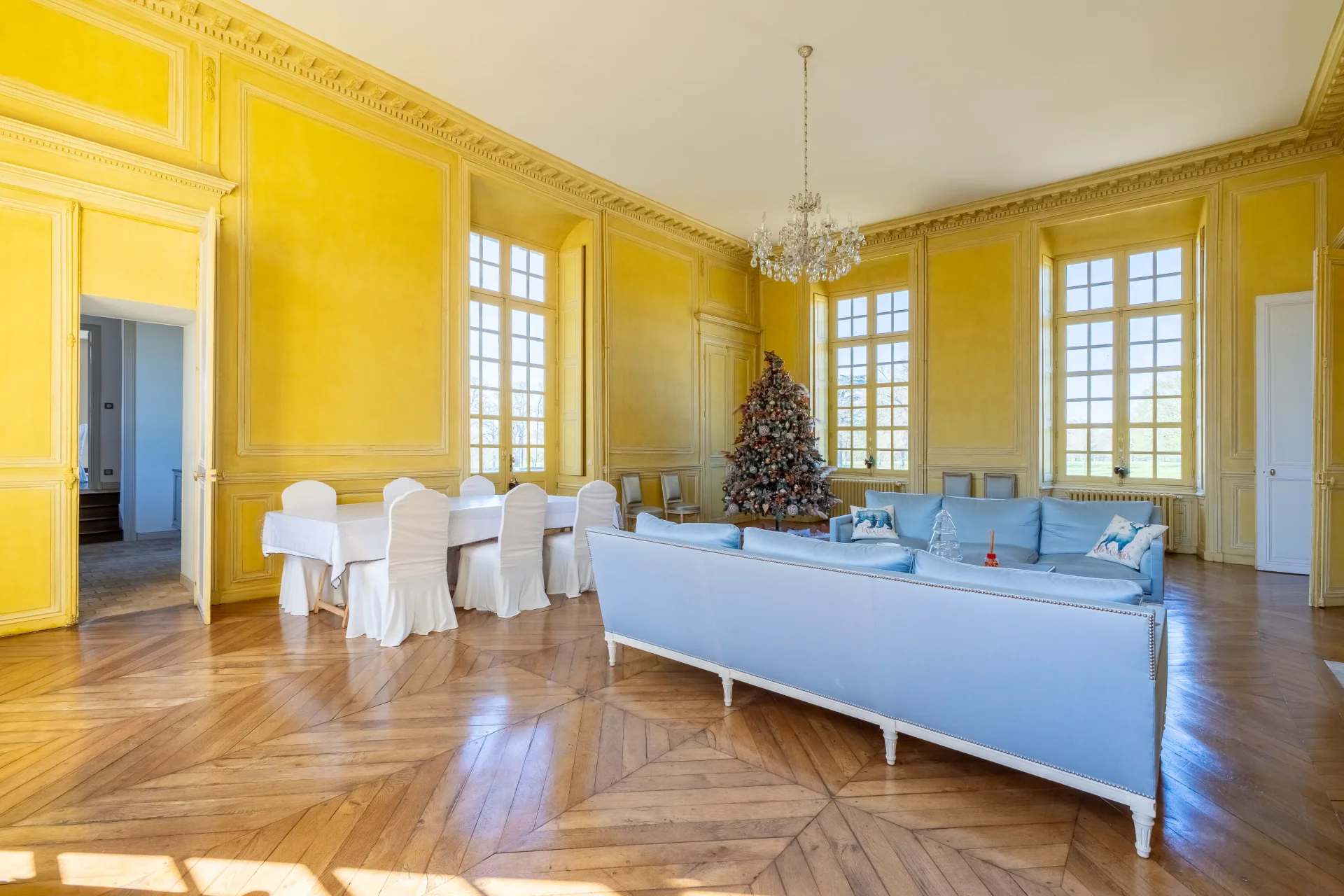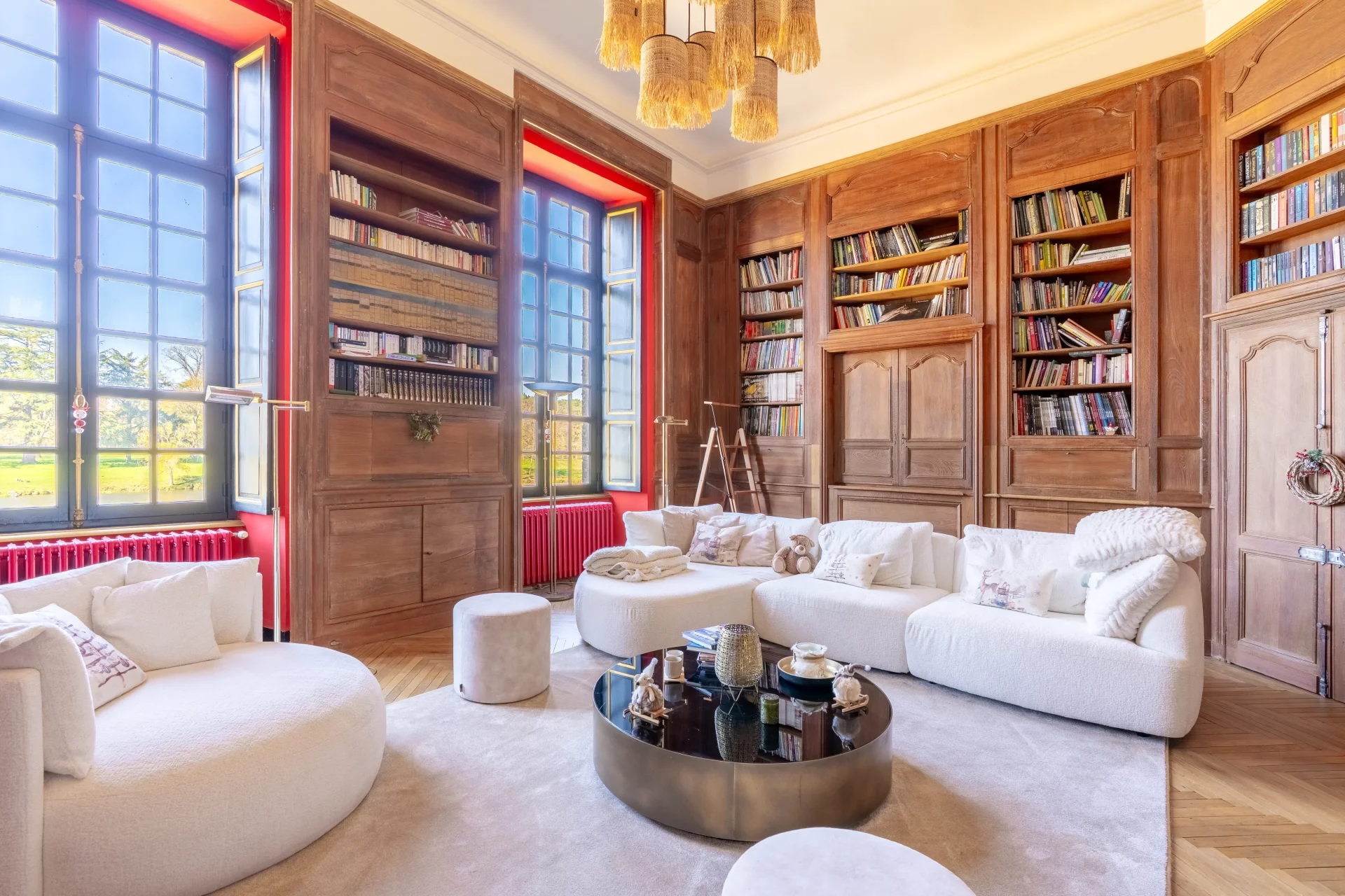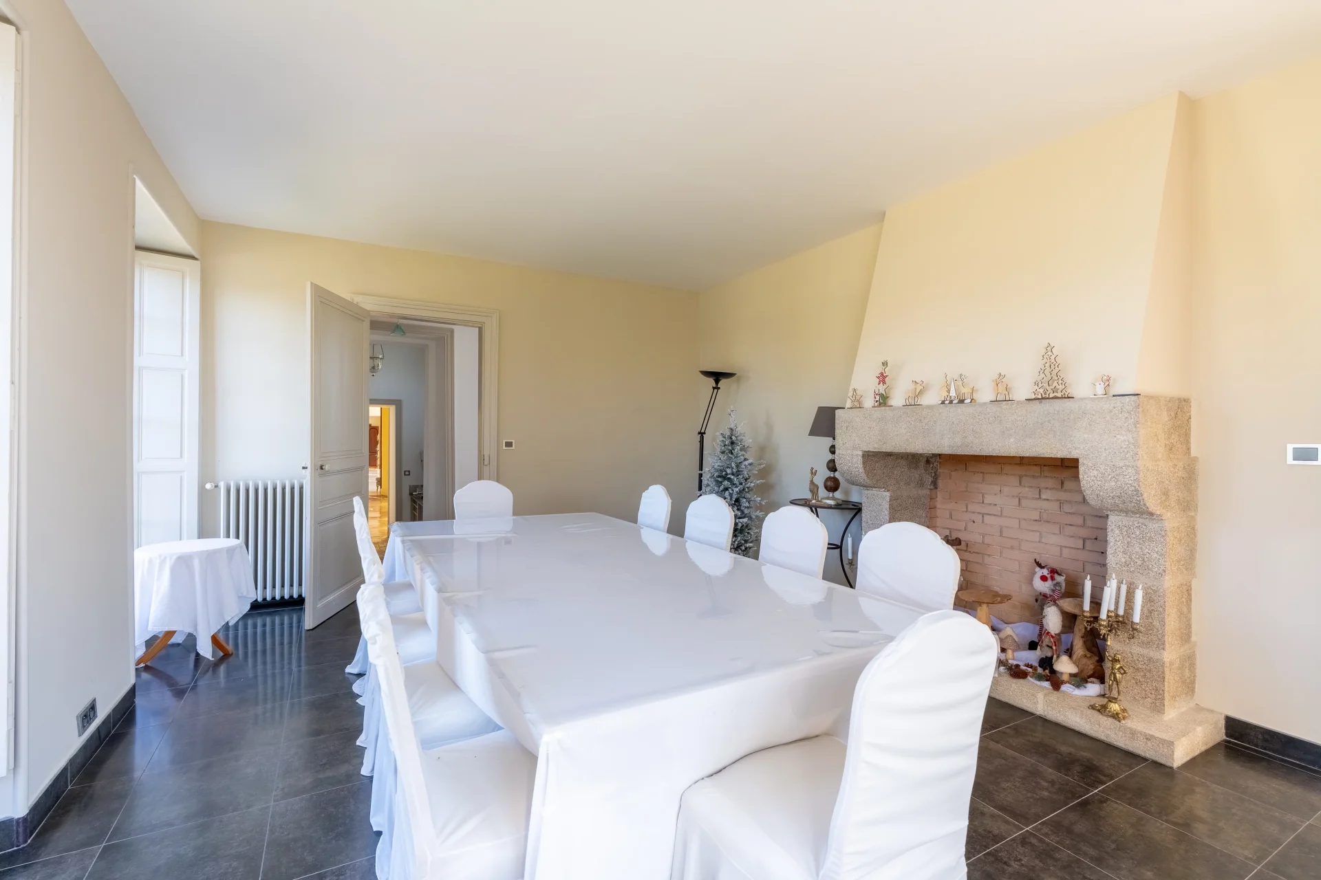 Le corps central en granit déploie sur ses façades nord et sud sept travées de hautes fenêtres à claveaux, couronnées d'une toiture en ardoises à lucarnes. Un élégant escalier en fer à cheval précède au sud l'entrée principale ; au nord, un grand escalier à balustres ouvre sur le jardin. 900m² habitables se répartissent sur quatre niveaux : grand salon de 67m², salon bibliothèque boisé de 54m² avec mezzanine, galerie distribuant trois bureaux, salle à manger, cuisine, sept chambres avec salles de bains, caves, greniers. Parquets à chevrons, boiseries sculptées, cheminées d'époque composent un intérieur raffiné, doté du confort moderne, géothermie et fibre optique.