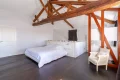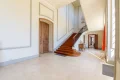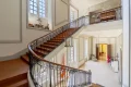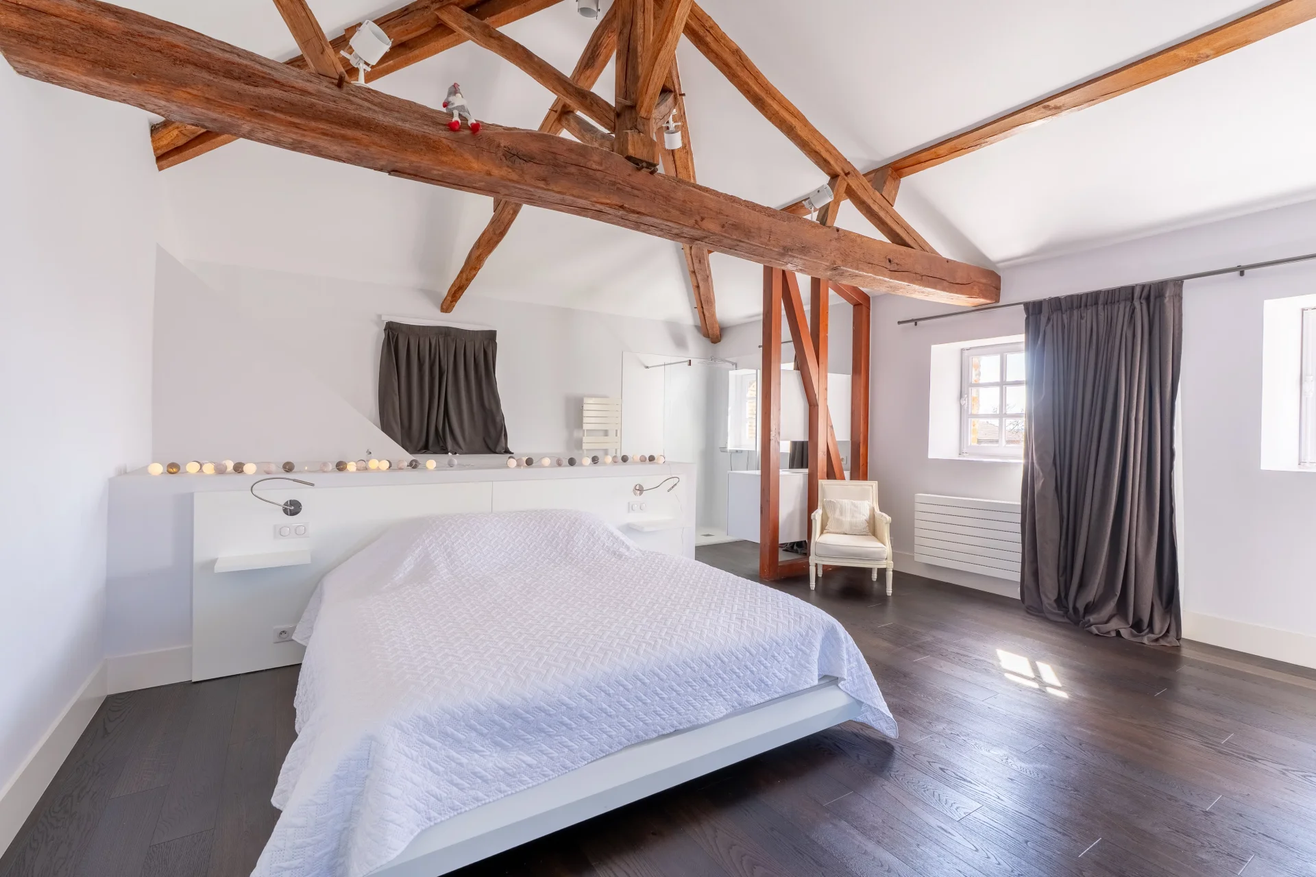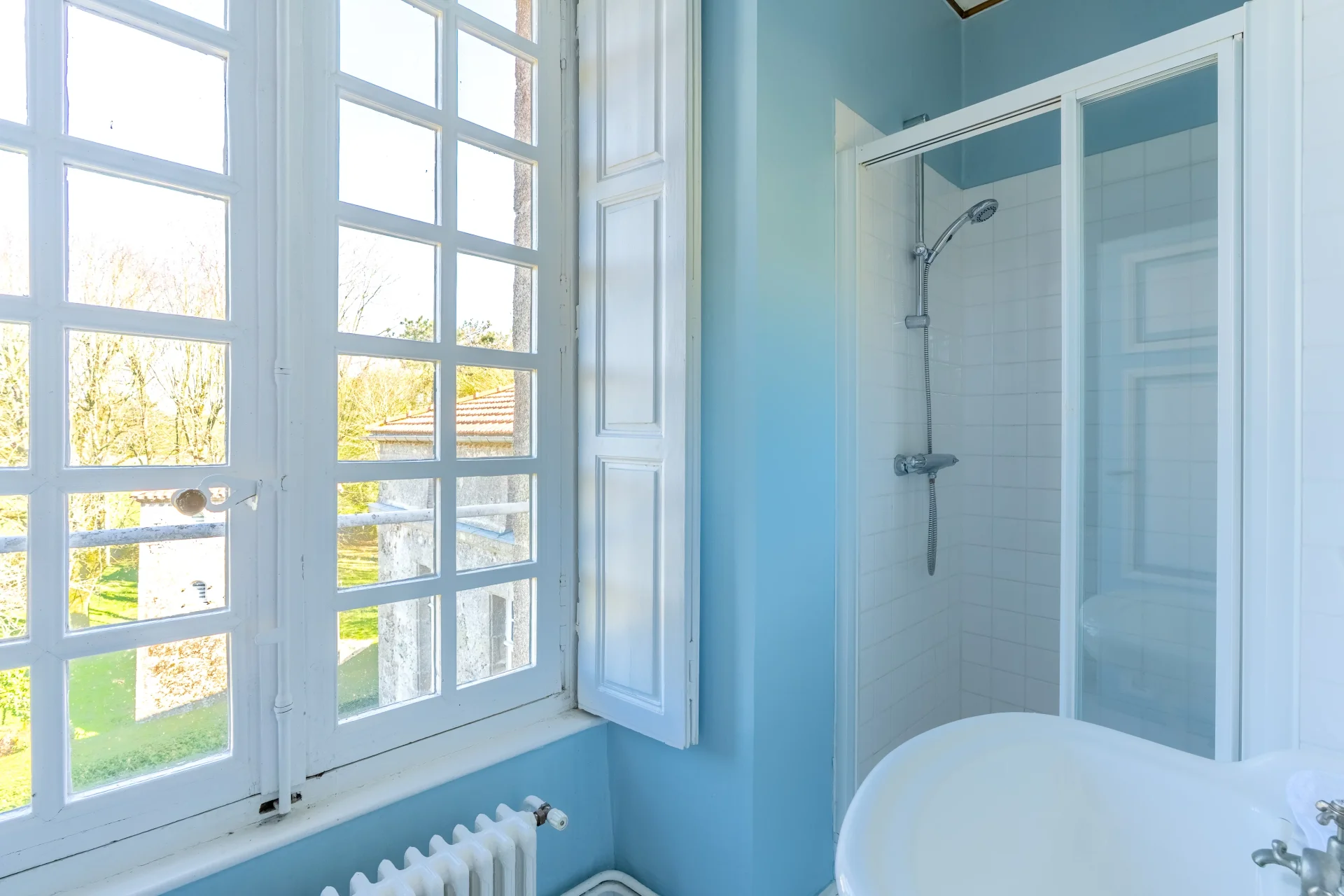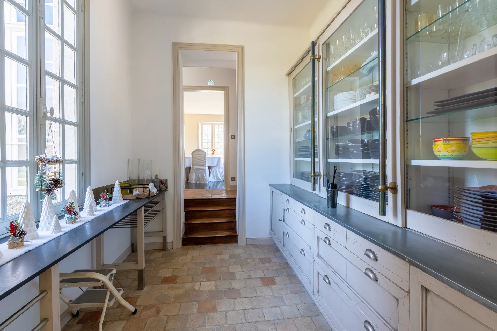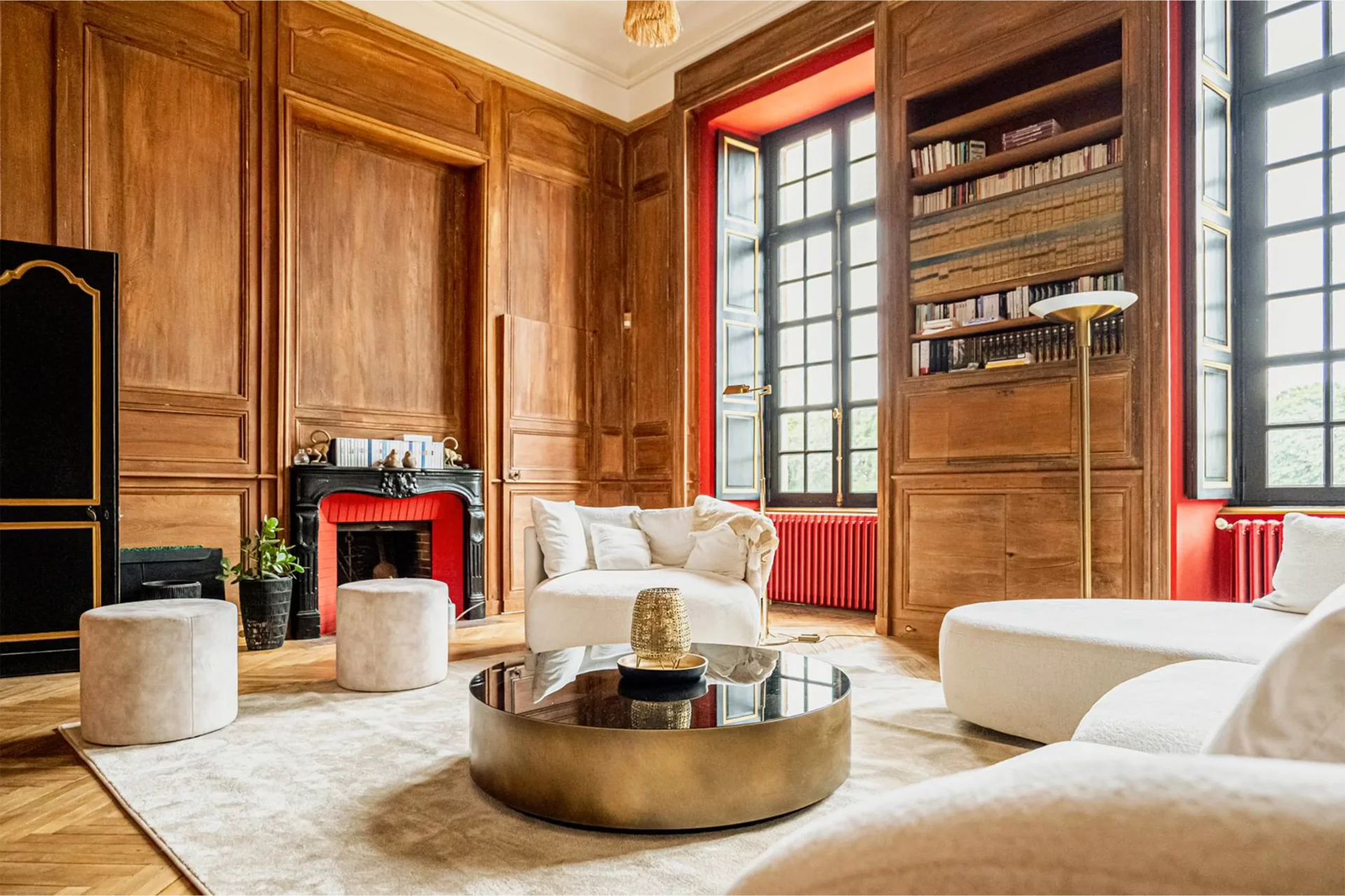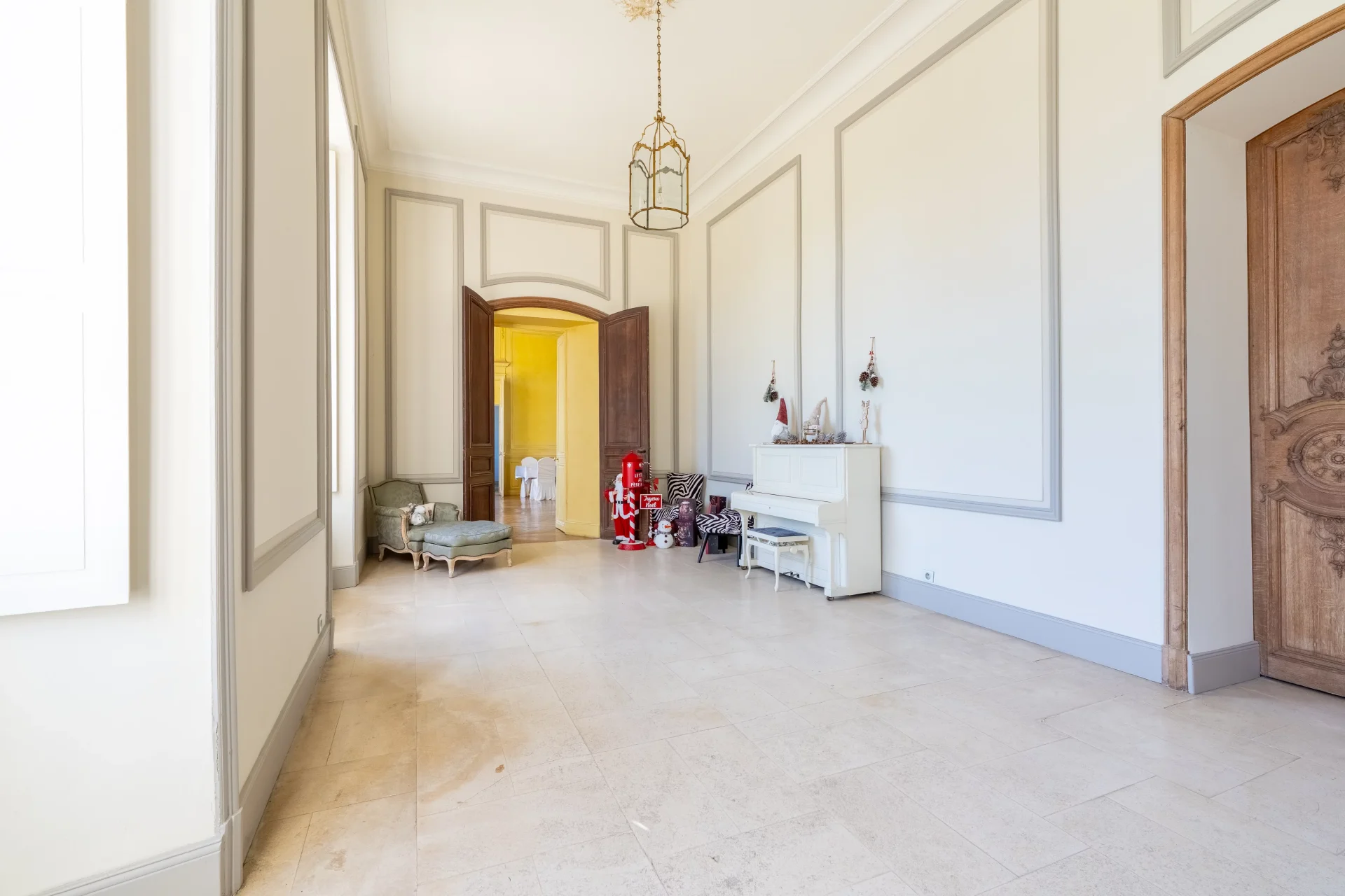 Le corps central en granit déploie sur ses façades nord et sud sept travées de hautes fenêtres à claveaux, couronnées d'une toiture en ardoises à lucarnes. Un élégant escalier en fer à cheval précède au sud l'entrée principale ; au nord, un grand escalier à balustres ouvre sur le jardin. 900m² habitables se répartissent sur quatre niveaux : grand salon de 67m², salon bibliothèque boisé de 54m² avec mezzanine, galerie distribuant trois bureaux, salle à manger, cuisine, sept chambres avec salles de bains, caves, greniers. Parquets à chevrons, boiseries sculptées, cheminées d'époque composent un intérieur raffiné, doté du confort moderne, géothermie et fibre optique.