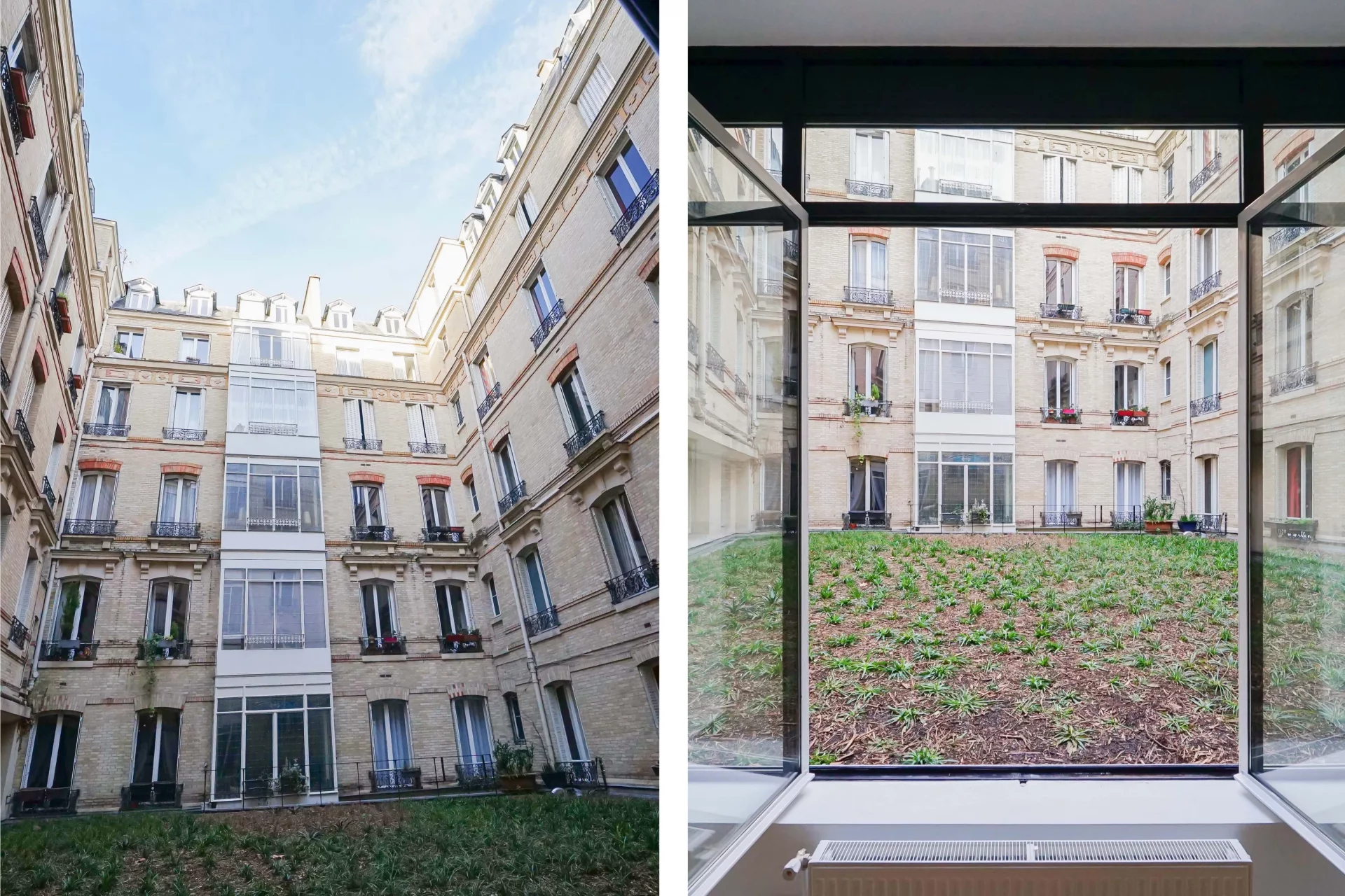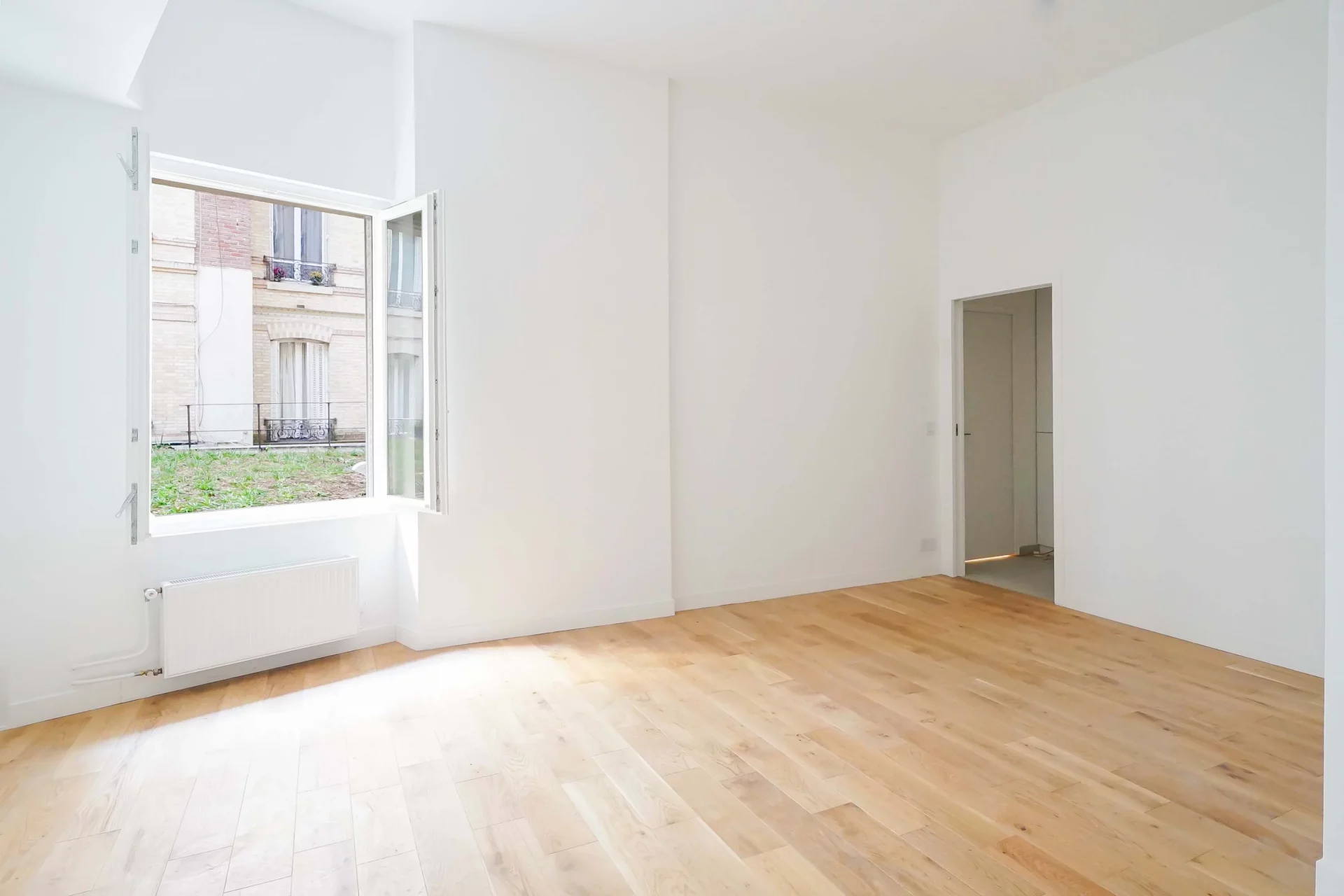 Il est orienté au calme absolu sur une cour végétalisée et se compose d'un grand salon agrémenté d'un élégant bow-window, d'une cuisine ouverte équipée, de toilettes séparées et d'une grande chambre avec une salle de douche à l'italienne attenante. Le plan compact offre des volumes généreux ainsi qu'une belle hauteur sous plafond de 3m10.