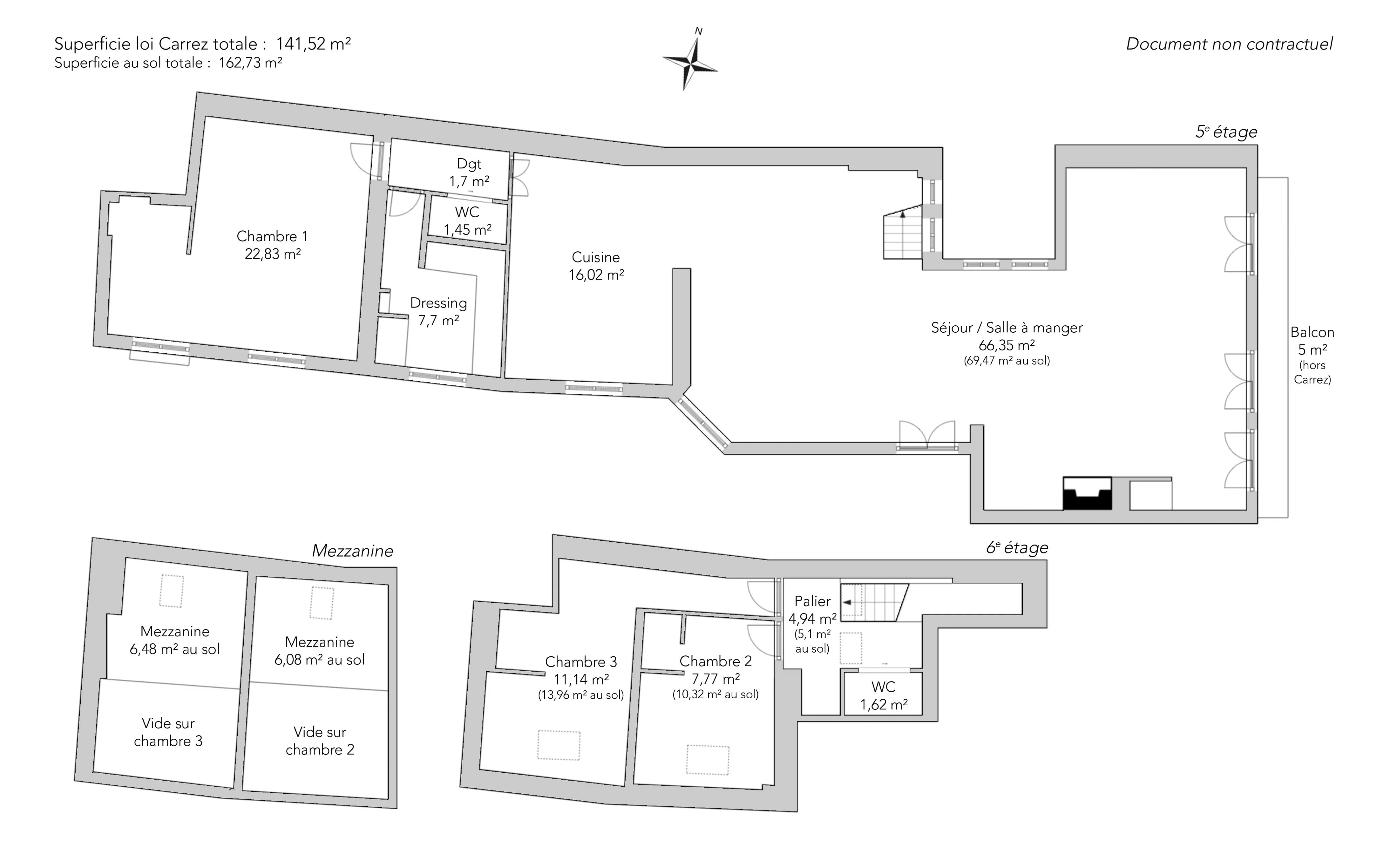D’une surface de 141,52 m² loi Carrez (162,73m² au sol), il séduit par ses volumes généreux, sa luminosité et la qualité de ses prestations.