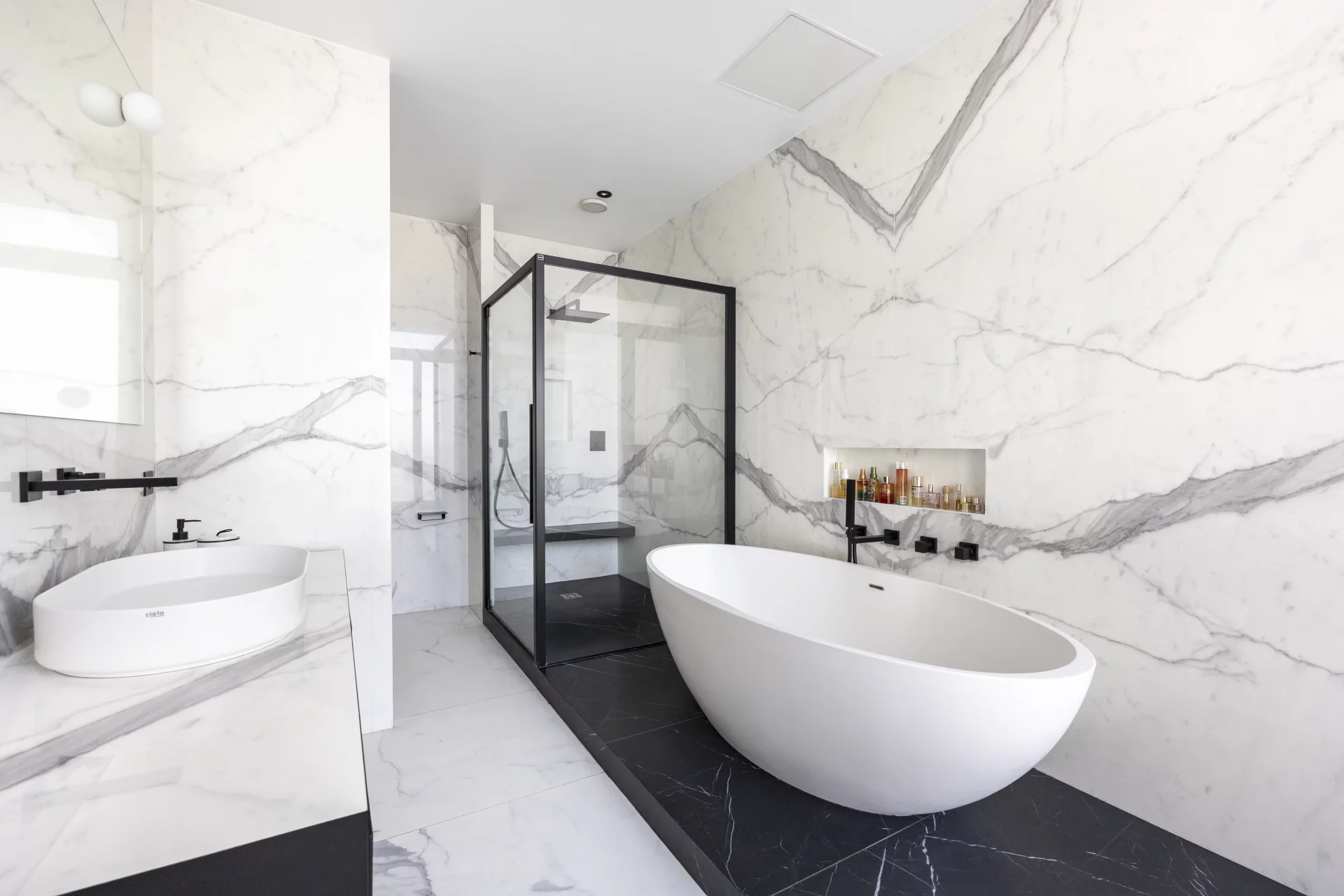 L’espace nuit comprend une suite parentale avec salle de bains et douche, quatre autres chambres disposant chacune de leur salle de douche privative, deux toilettes invités, une buanderie et de nombreux rangements intégrés.