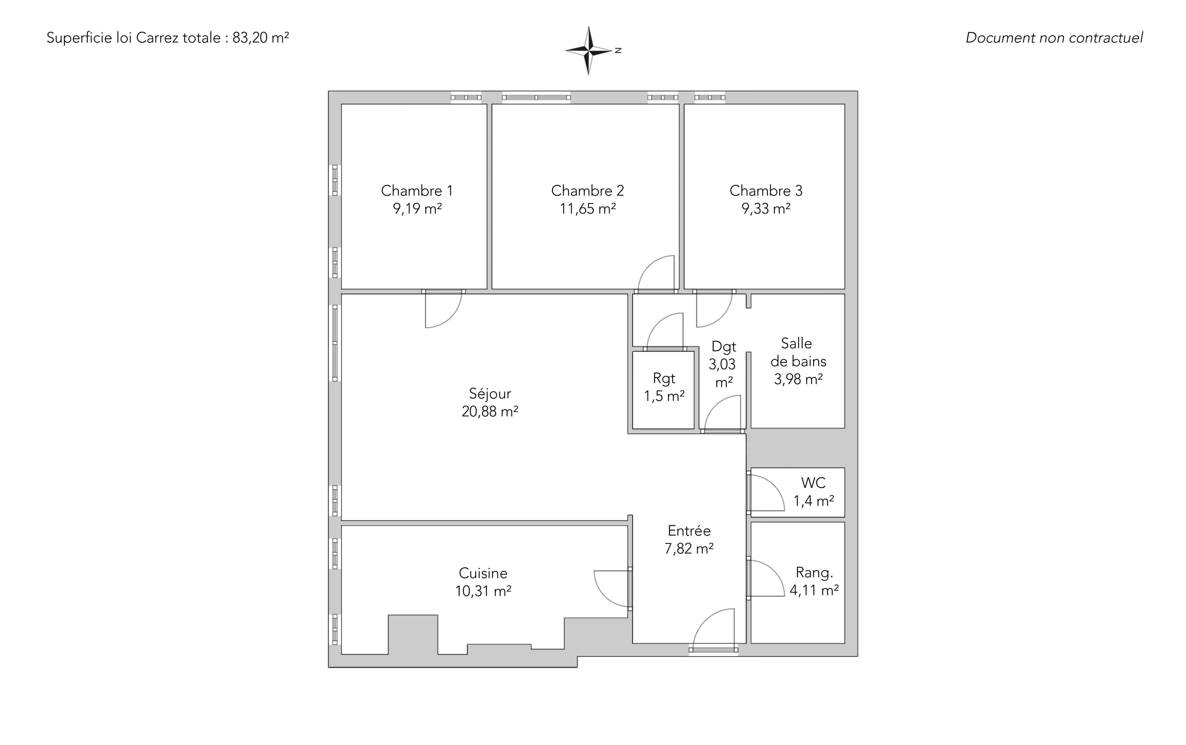 Il se compose d’une entrée, d’un vaste séjour, d’une cuisine indépendante — facilement ouvrable sur le séjour —, de trois chambres, d’une salle de bains, de toilettes séparées et de nombreux rangements.