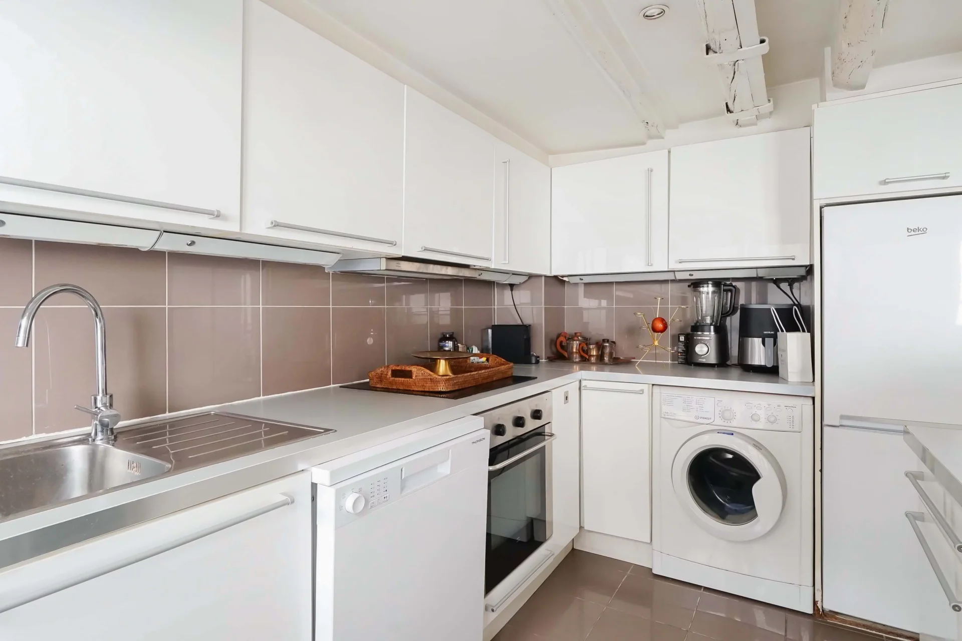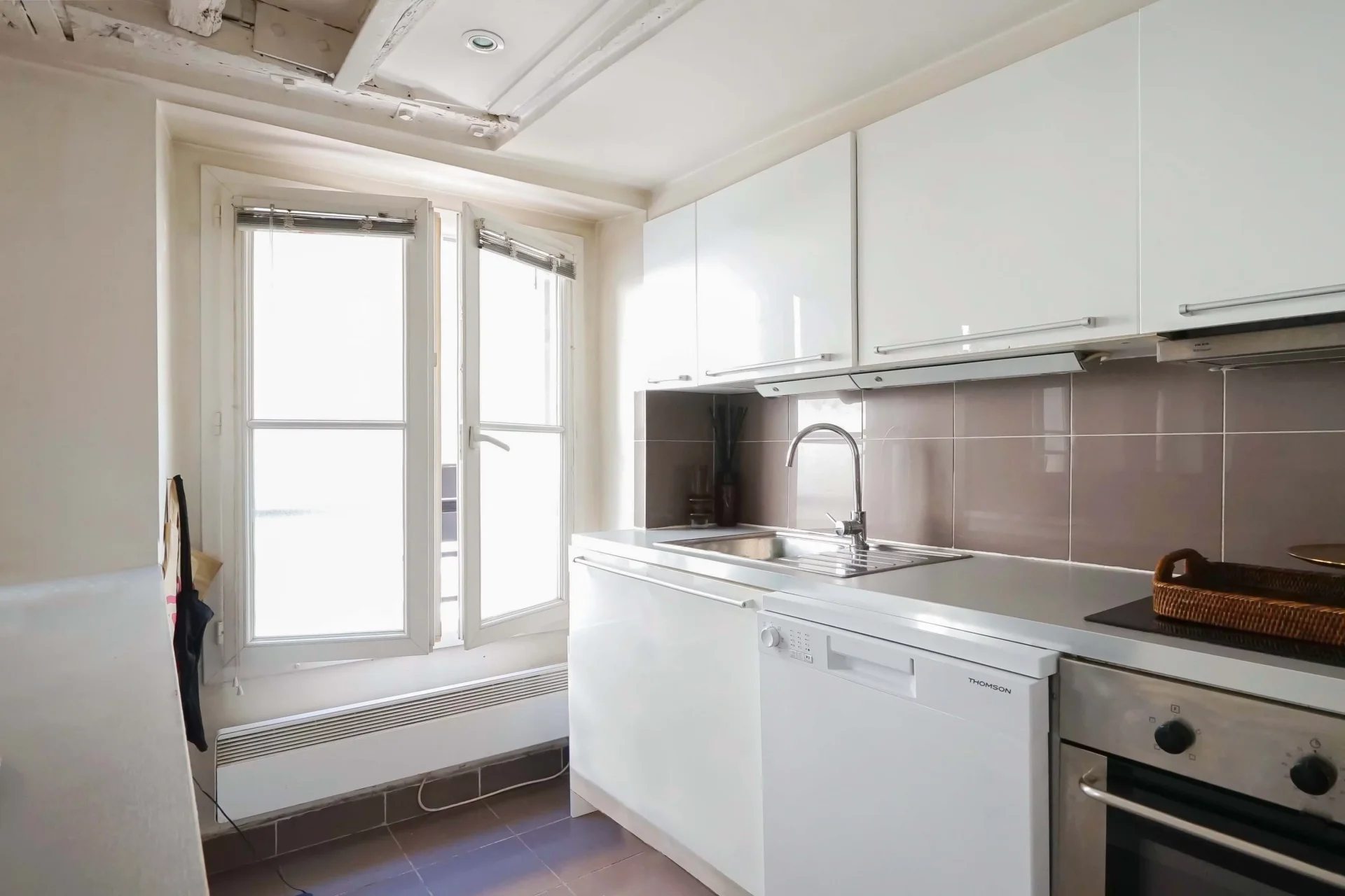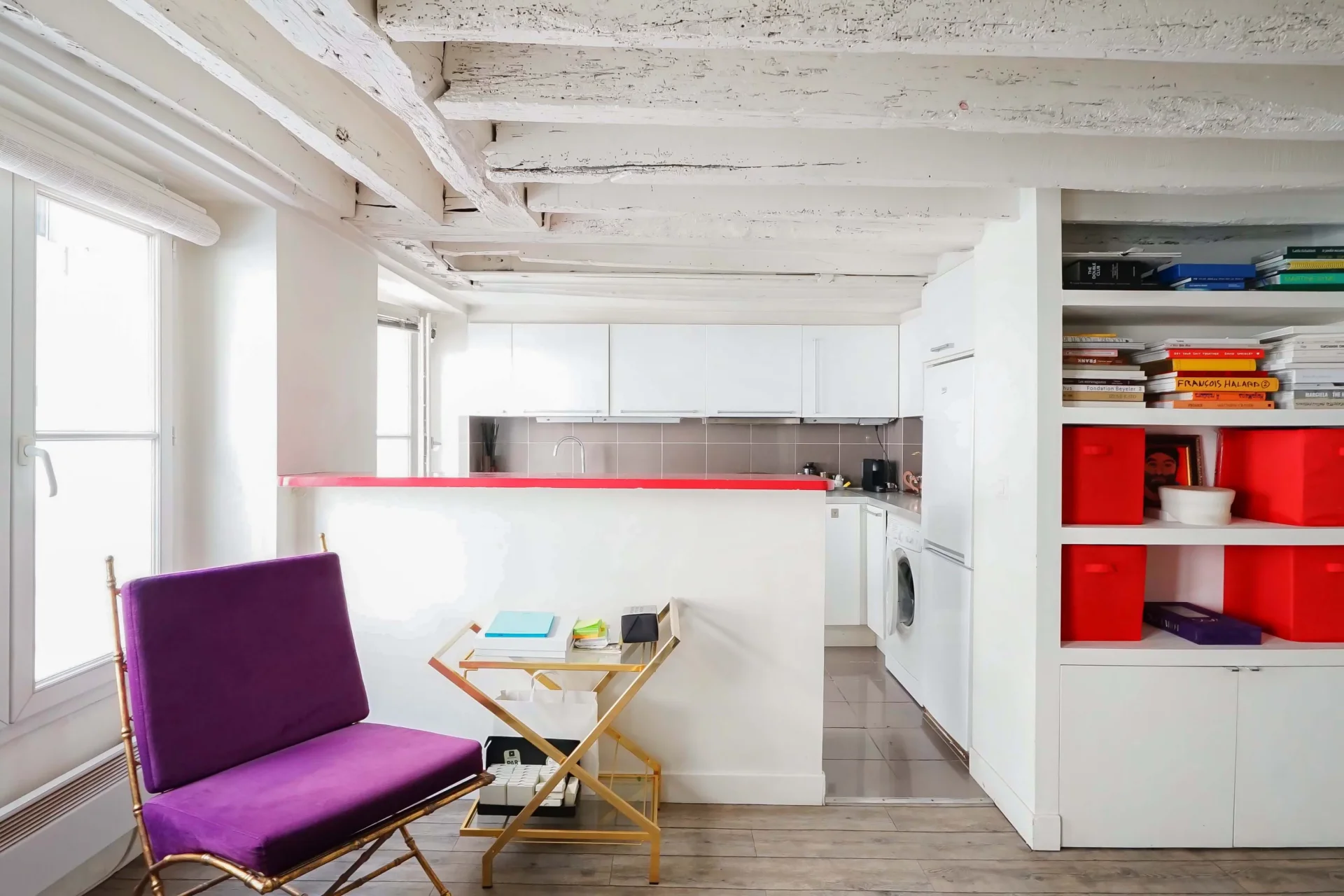 Cet appartement de caractère séduit par son authenticité et son charme typiquement parisien avec poutres apparentes.