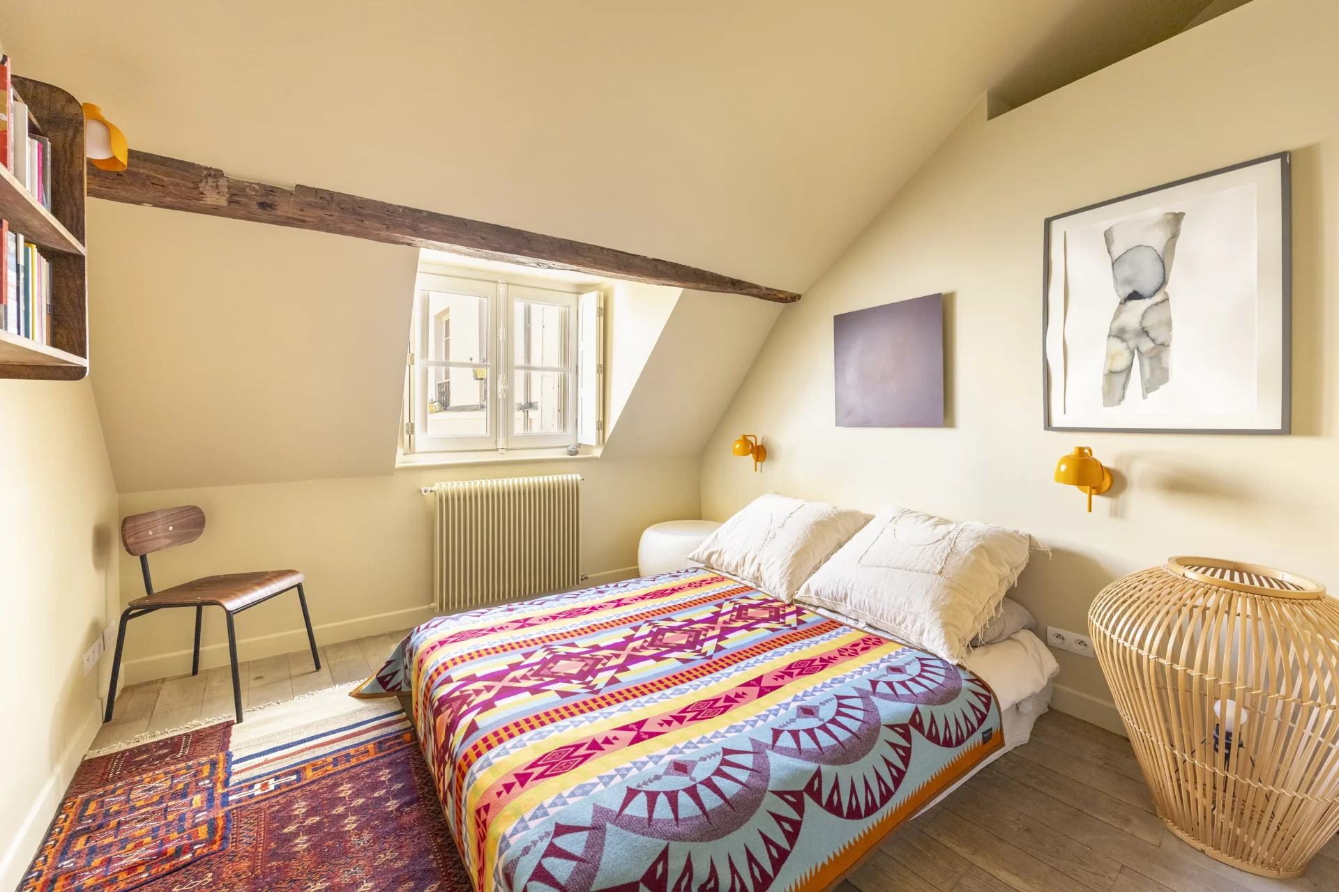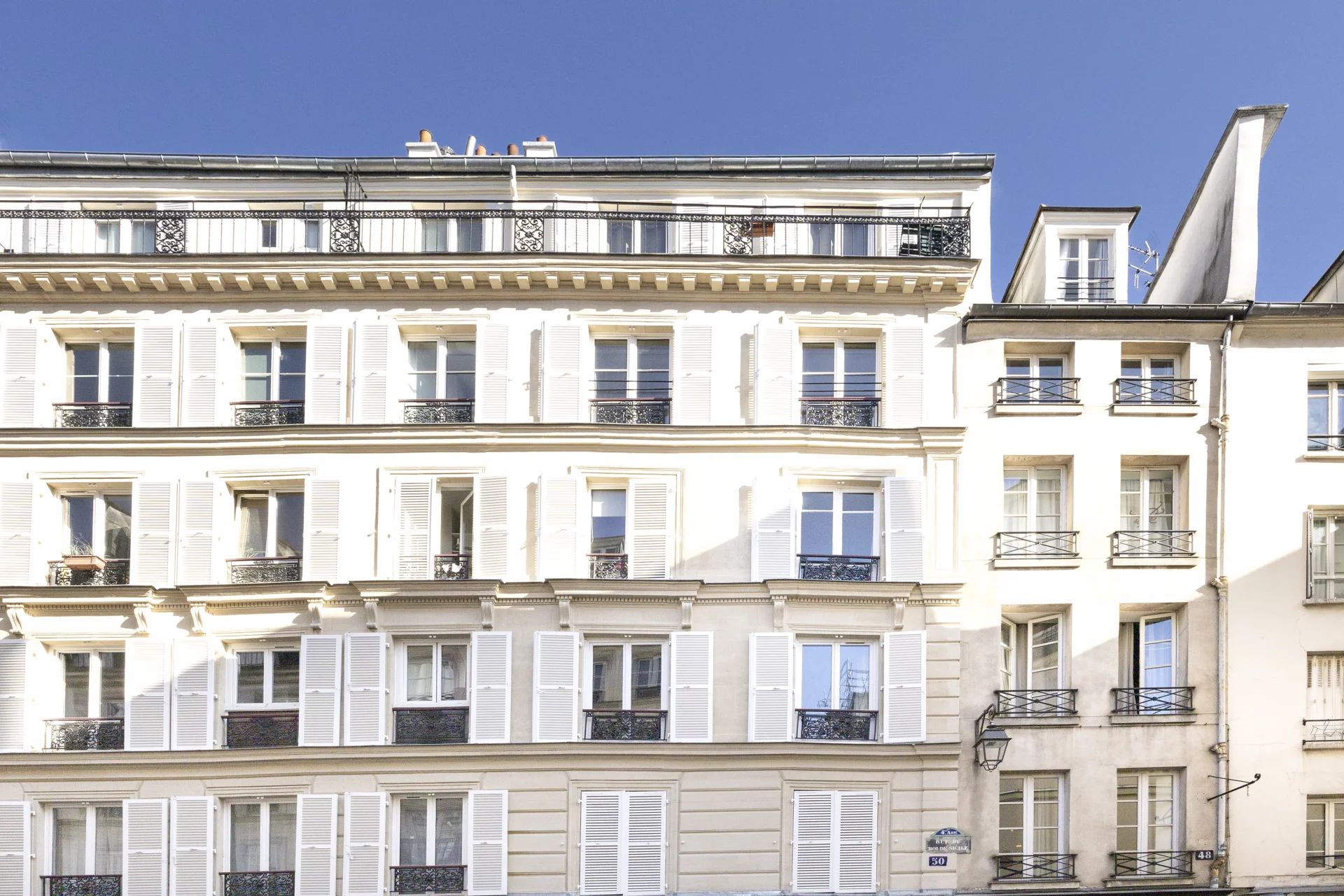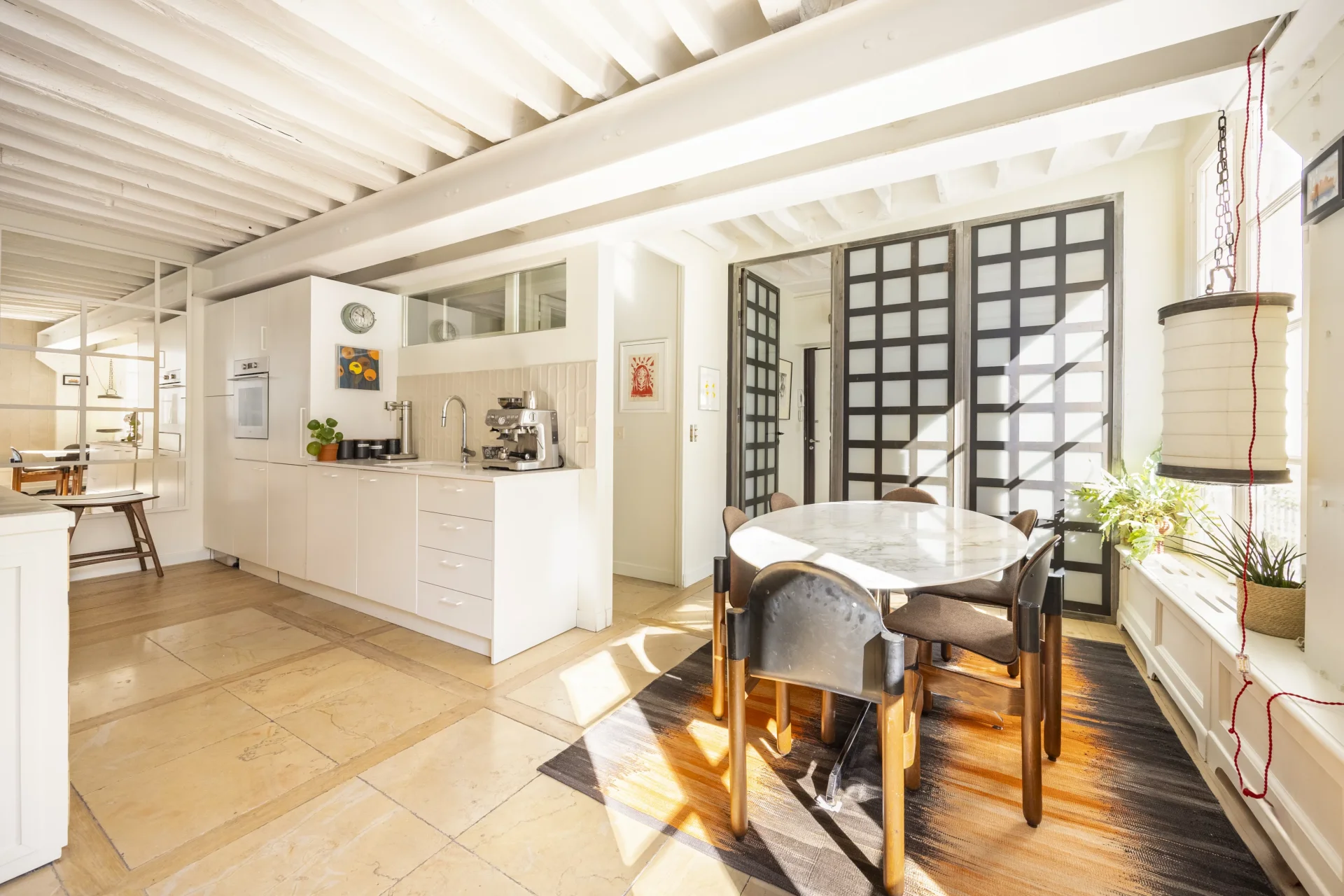 Au coeur du Marais. Au sein d'une bâtisse de 1750 classée monument historique, triplex atypique emprunt d'authenticité et de charme, d'une superficie de 132,7m² au sol et 91,23m² loi Carrez. Entièrement rénové par architecte, ce bien comme une maison bénéficie de calme absolu, de jolis volumes et d'une agréable vue. Au premier niveau, il comprend une belle réception dotée de poutres apparentes d'origine et d'une cheminée, une cuisine ouverte équipée, d'une chambre master avec dressing et salle d'eau, et des toilettes invités. Le deuxième niveau comporte une chambre, une salle de douche avec toilettes et un dressing. Au troisième niveau, une chambre mansardée et des combles. Deux caves complètent ce bien rare à la vente.