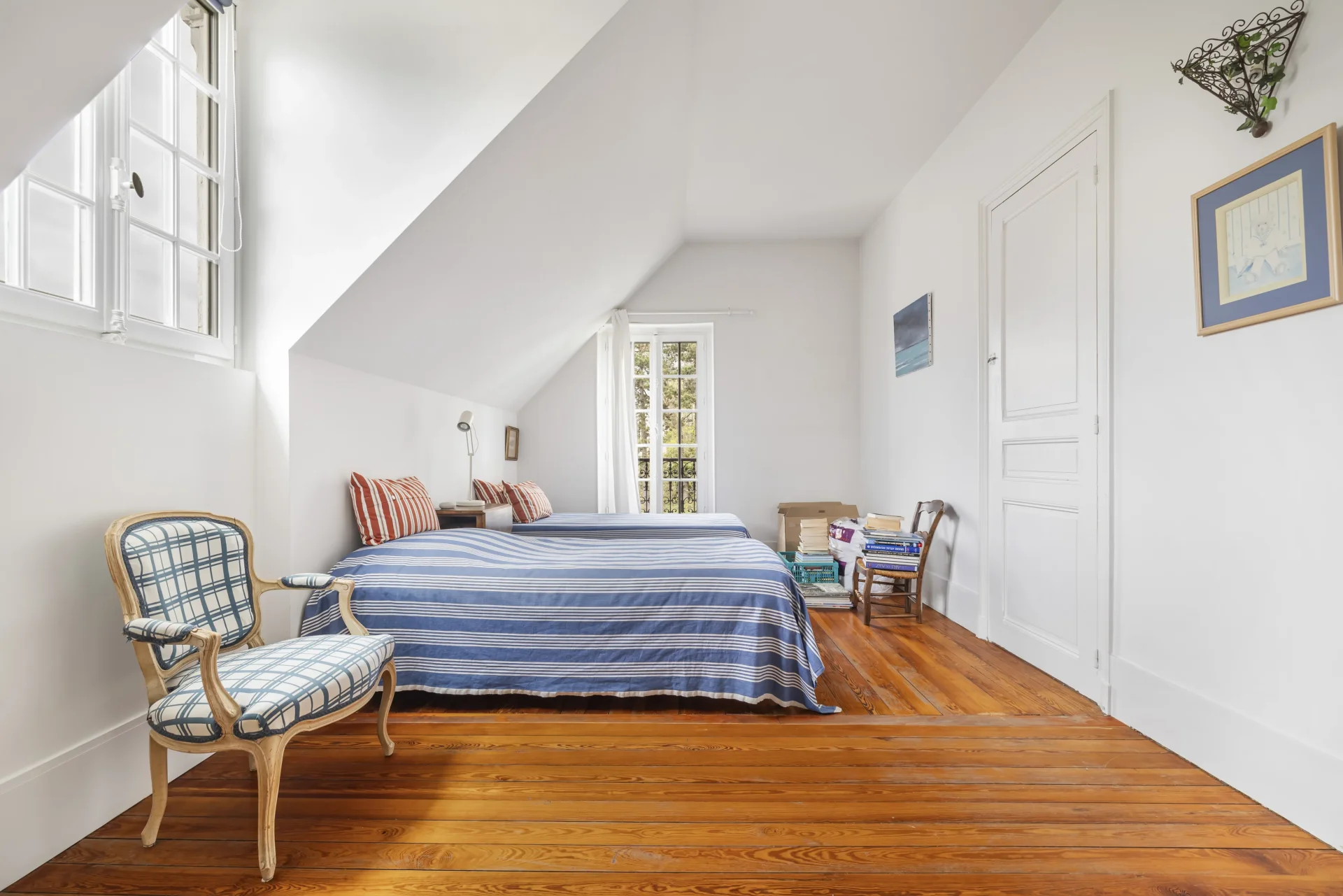 À l’étage, trois chambres composent un univers familial, réparties autour de leurs pièces d’eau. Le deuxième étage accueillent d’autres espaces de nuit, lumineux et paisibles, ainsi que des lieux plus confidentiels, propices au calme ou au travail. Les combles ont été aménagées permettant de créer un volume supplémentaire.
