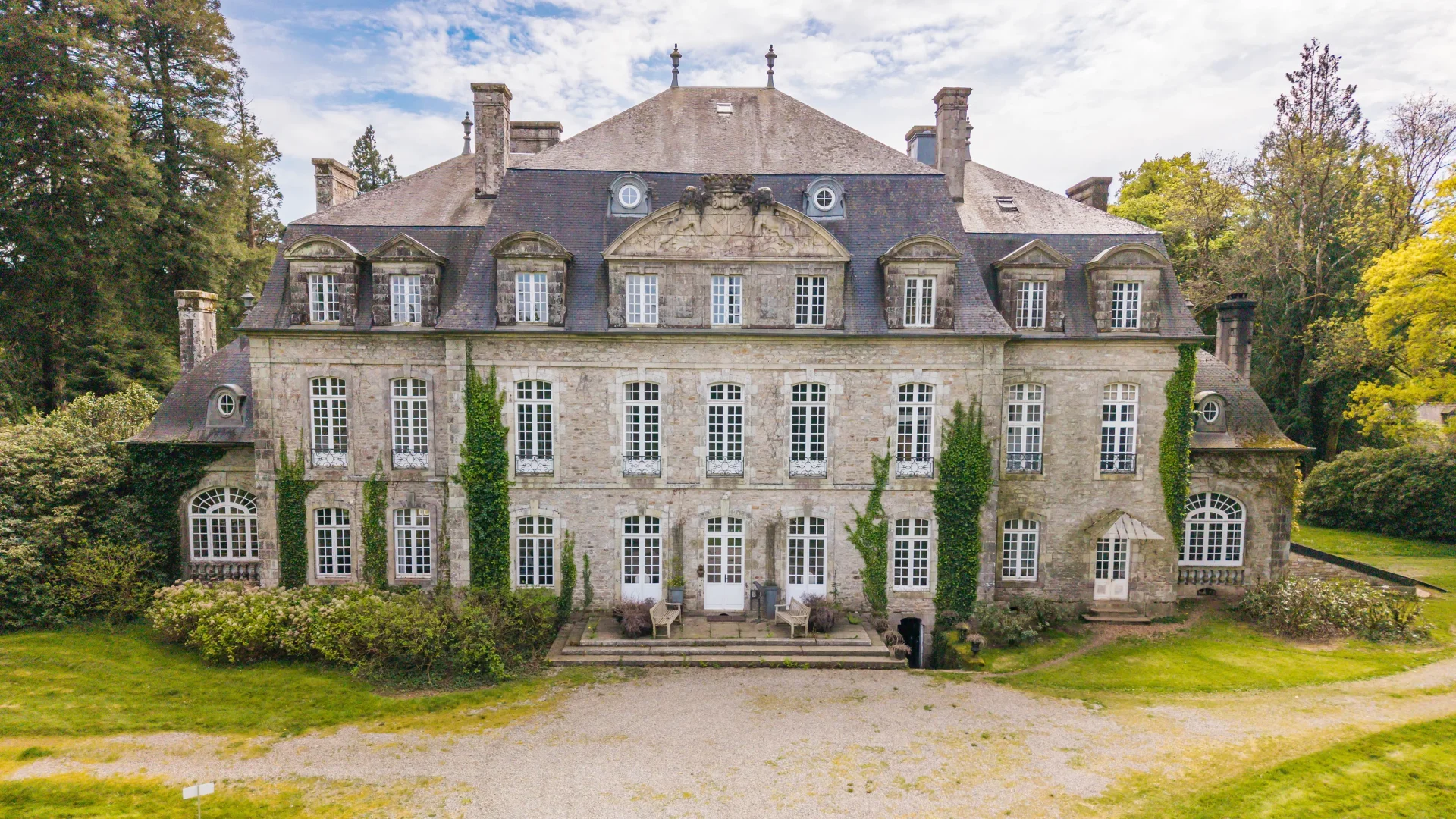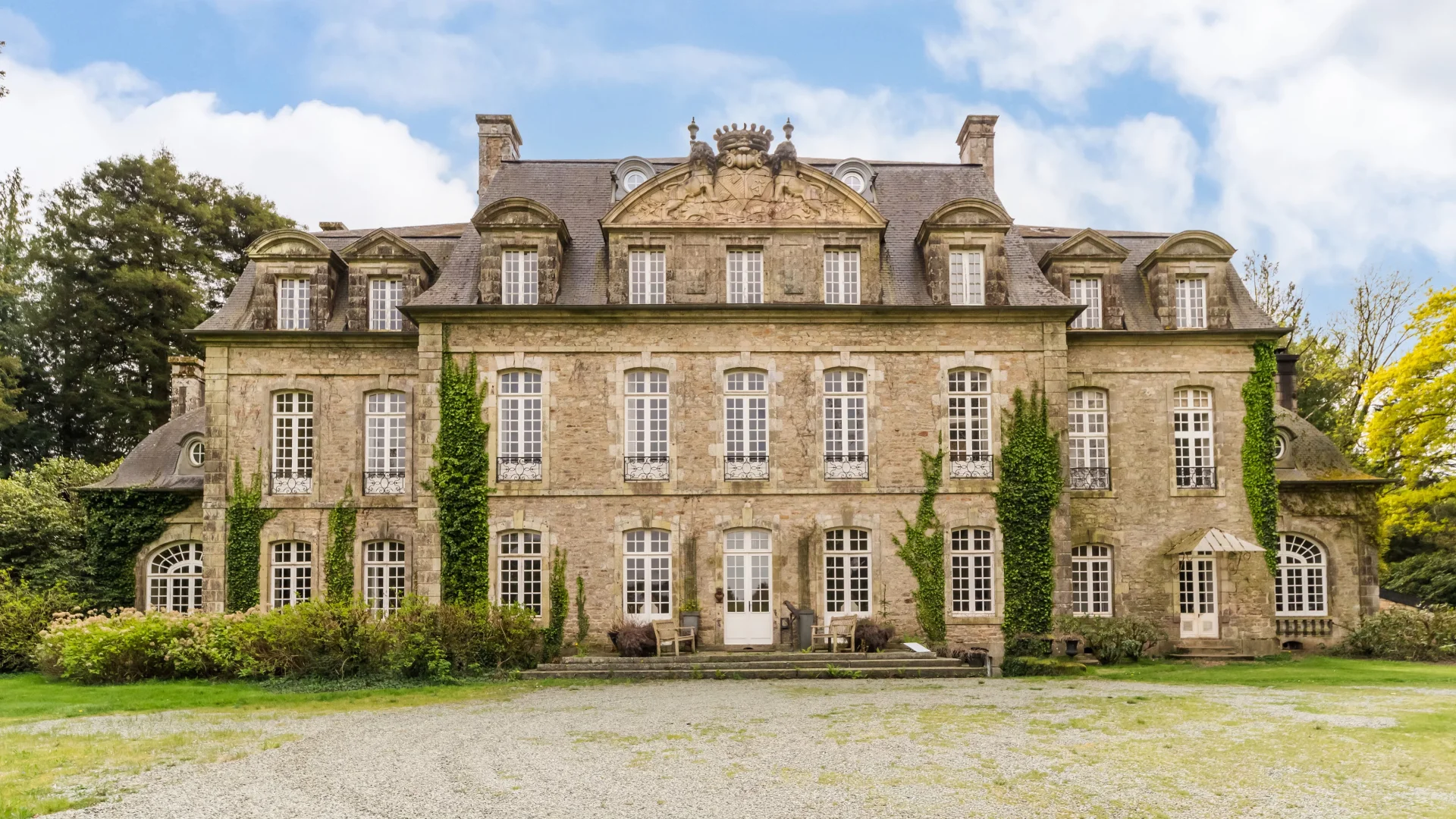 Développé selon un plan allongé, l’ensemble s’organise autour d’un corps central de cinq travées, prolongé par deux pavillons en léger retrait et des annexes de plain-pied. L’architecture est animée par une toiture à la Mansart, des lucarnes régulières et un fronton cintré orné d’armoiries venant souligner les travées centrales. Les dépendances complètent harmonieusement la propriété.