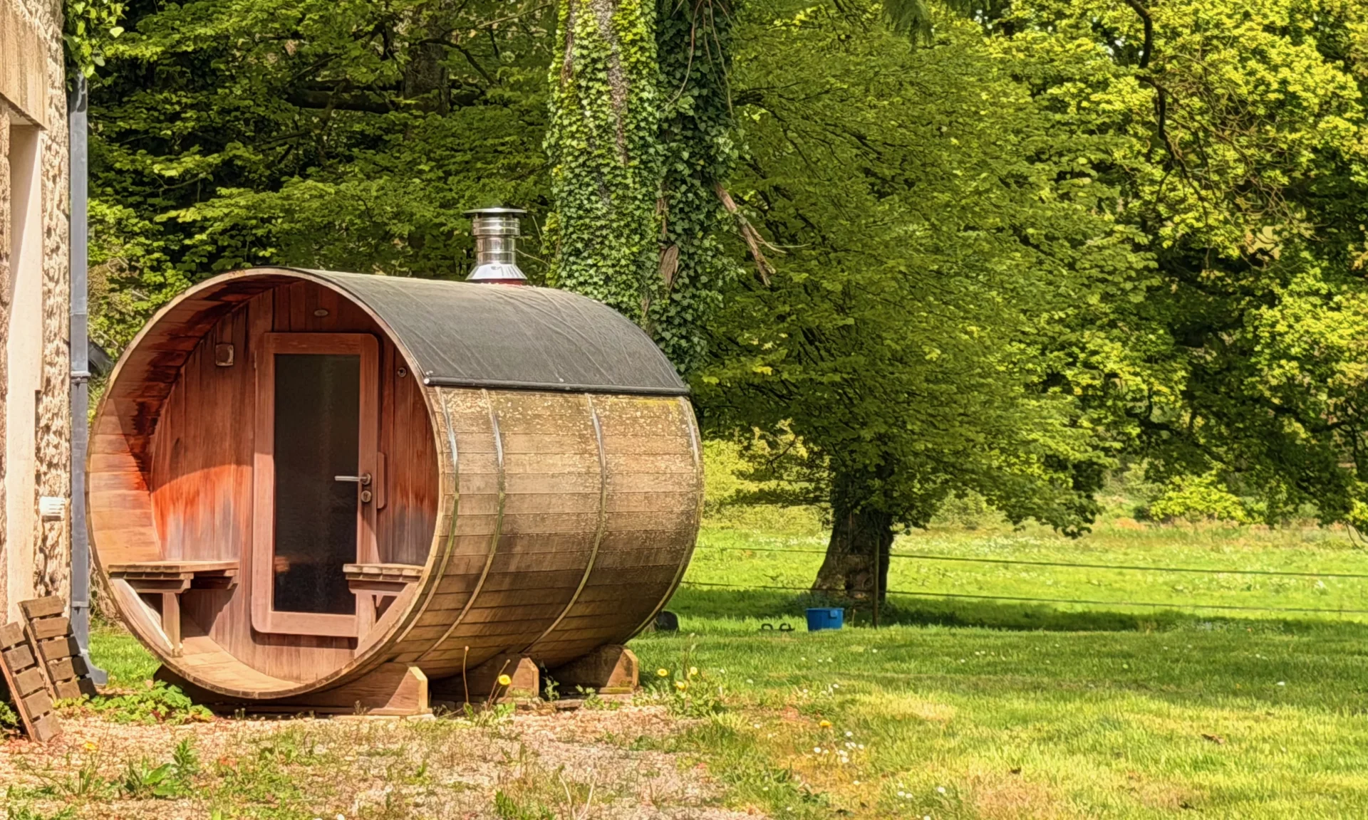 – Sauna en cèdre rouge, fabriqué en France et chauffé au poêle à bois, offrant une vue apaisante sur la nature, les chevaux et les arbres centenaires