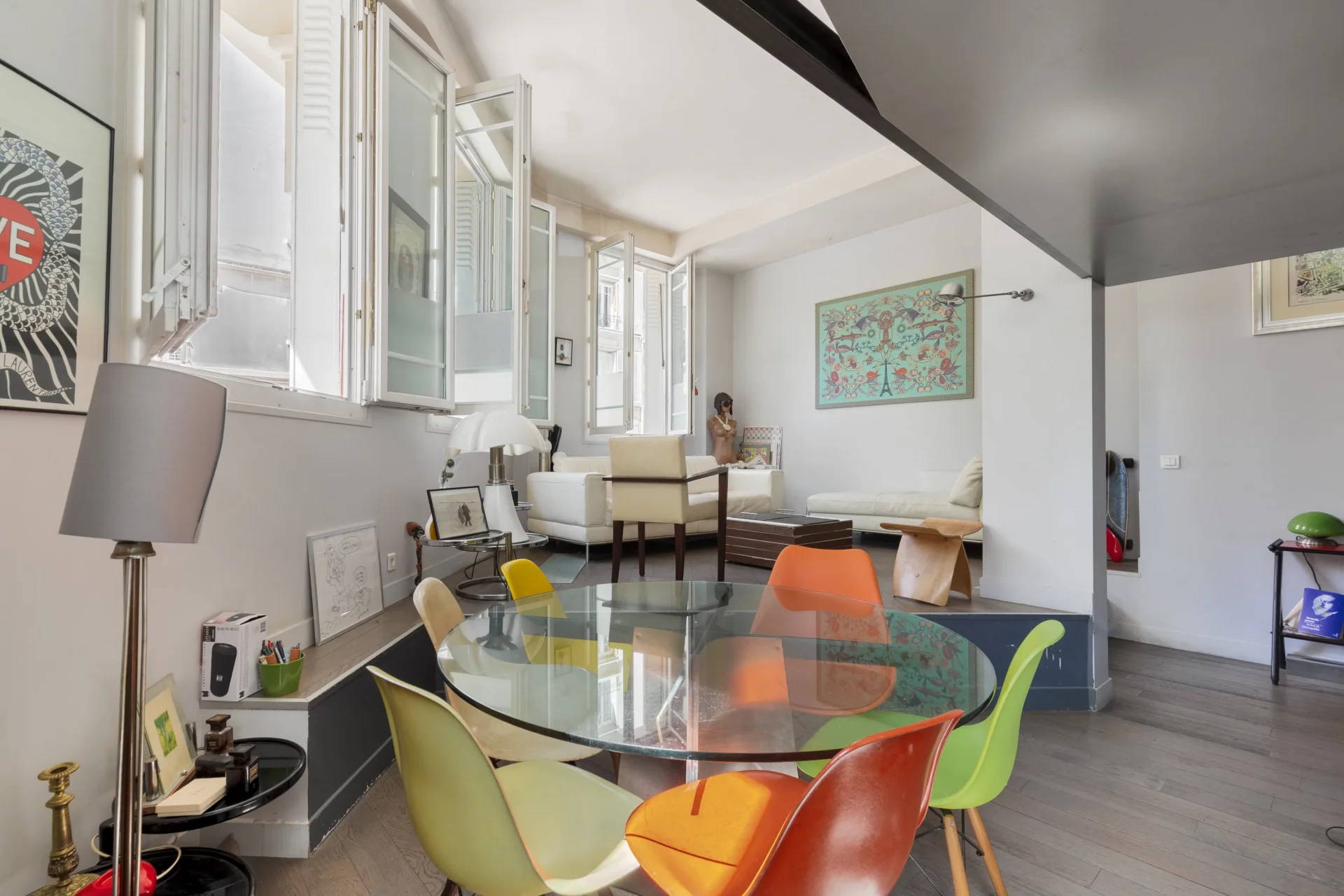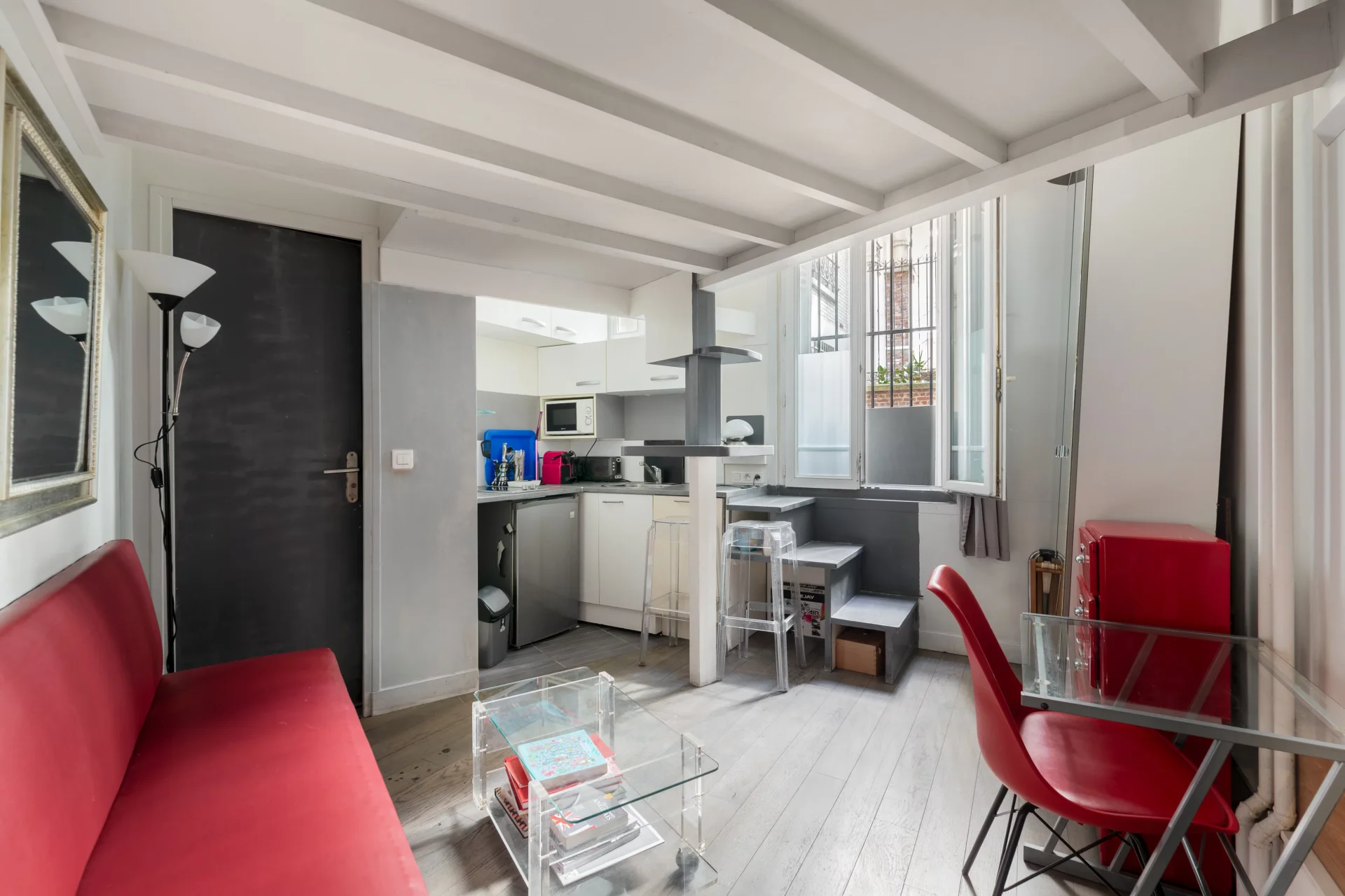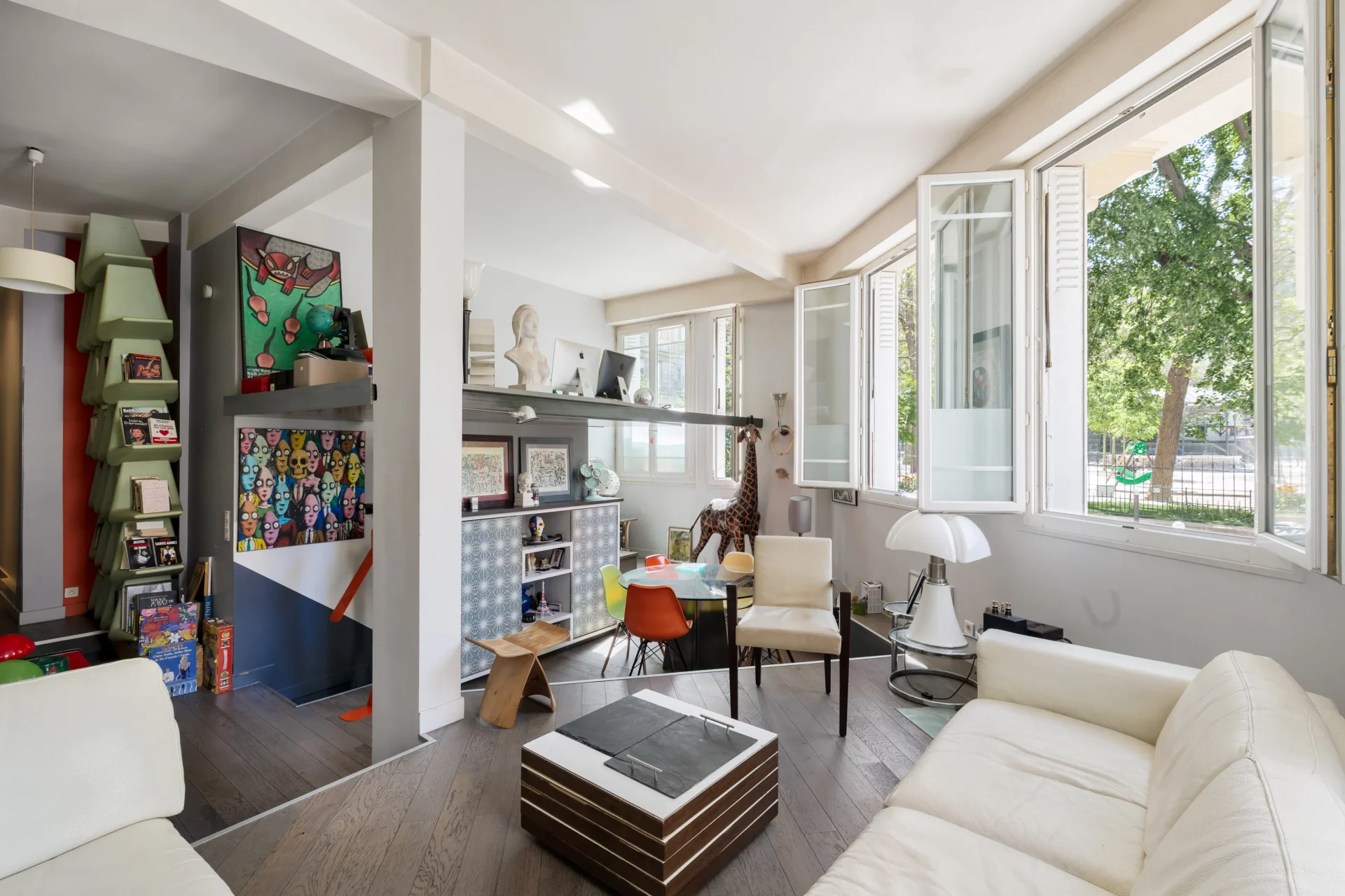 Le plan sans perte de place comprend une entrée, un spacieux double séjour exposé sud avec une belle hauteur sous plafond, une cuisine, trois chambres, dont un studio indépendant, une salle de douche, et des toilettes séparées. Baigné de lumière, il bénéficie de très beaux volumes en hauteur sous plafond.